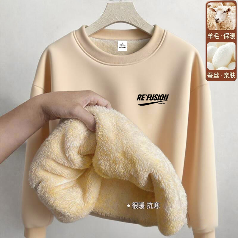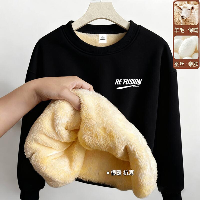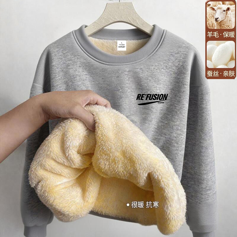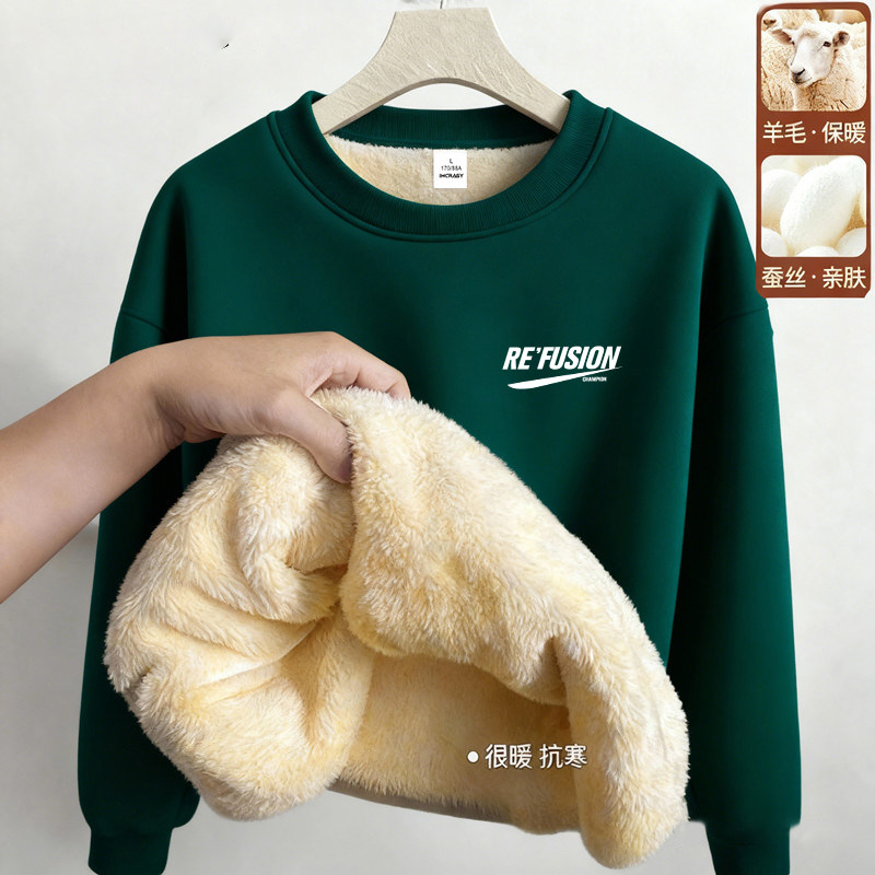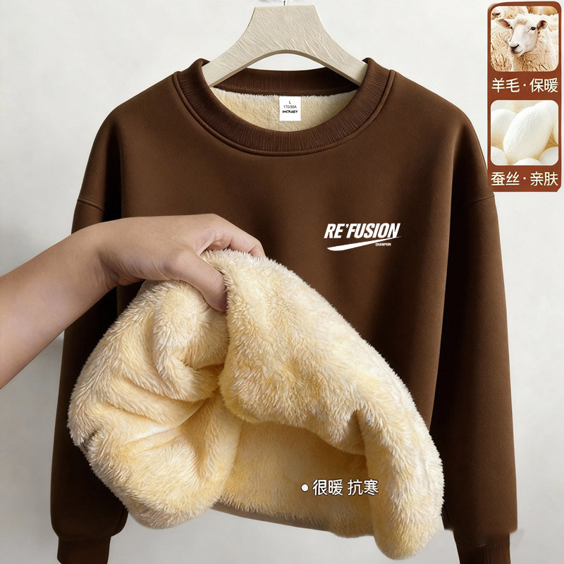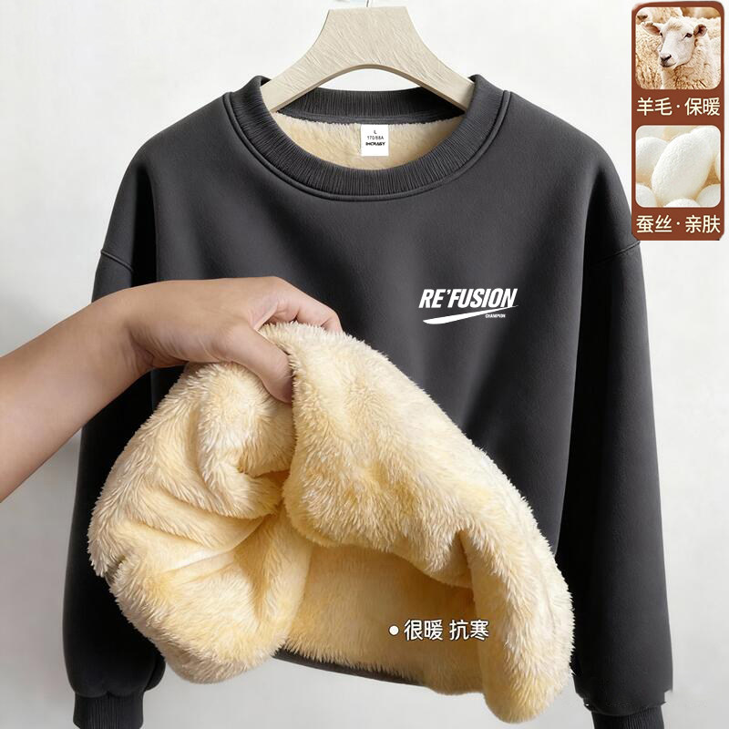 加绒加厚潮流卫衣冬季圆领套头羊毛蚕丝男女外套高级宽松保暖上衣