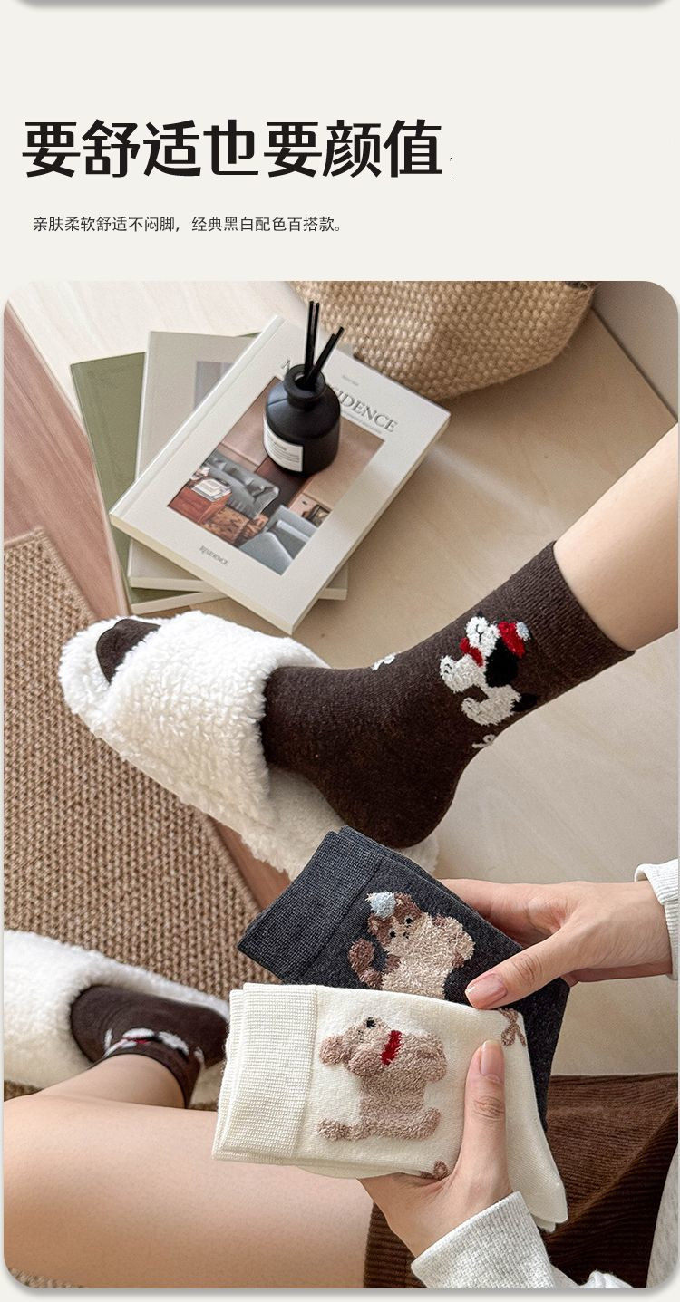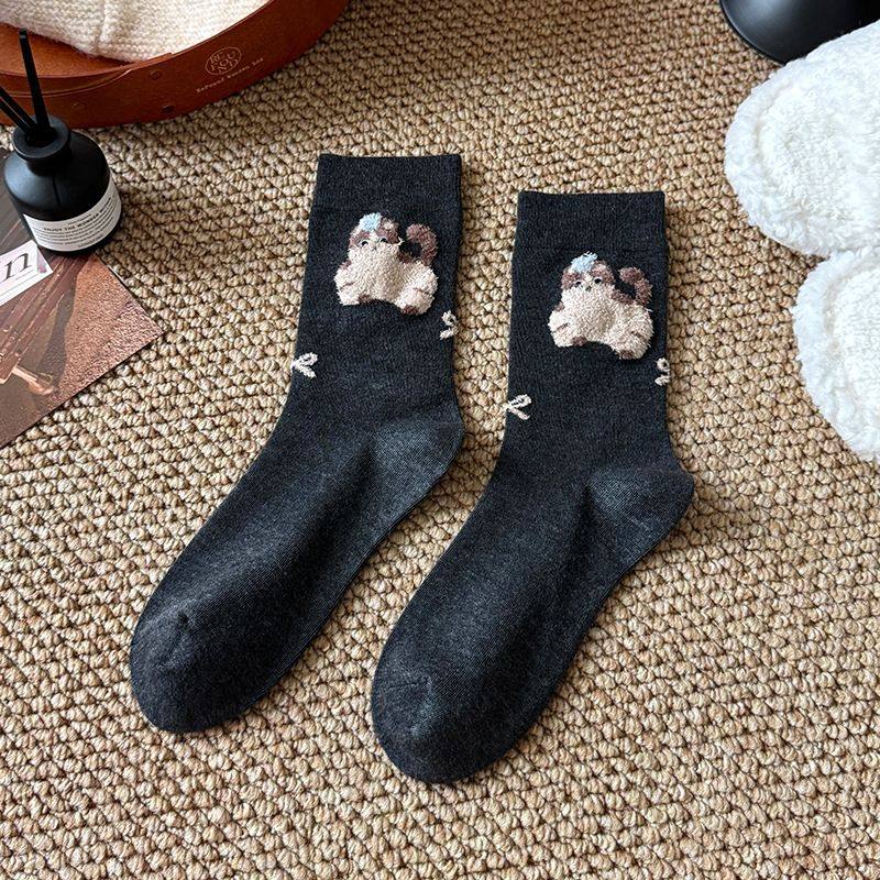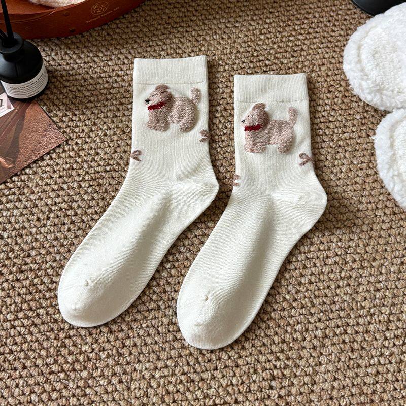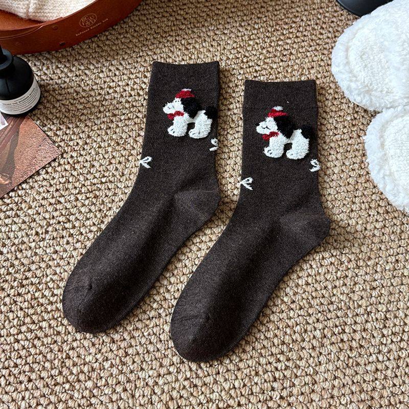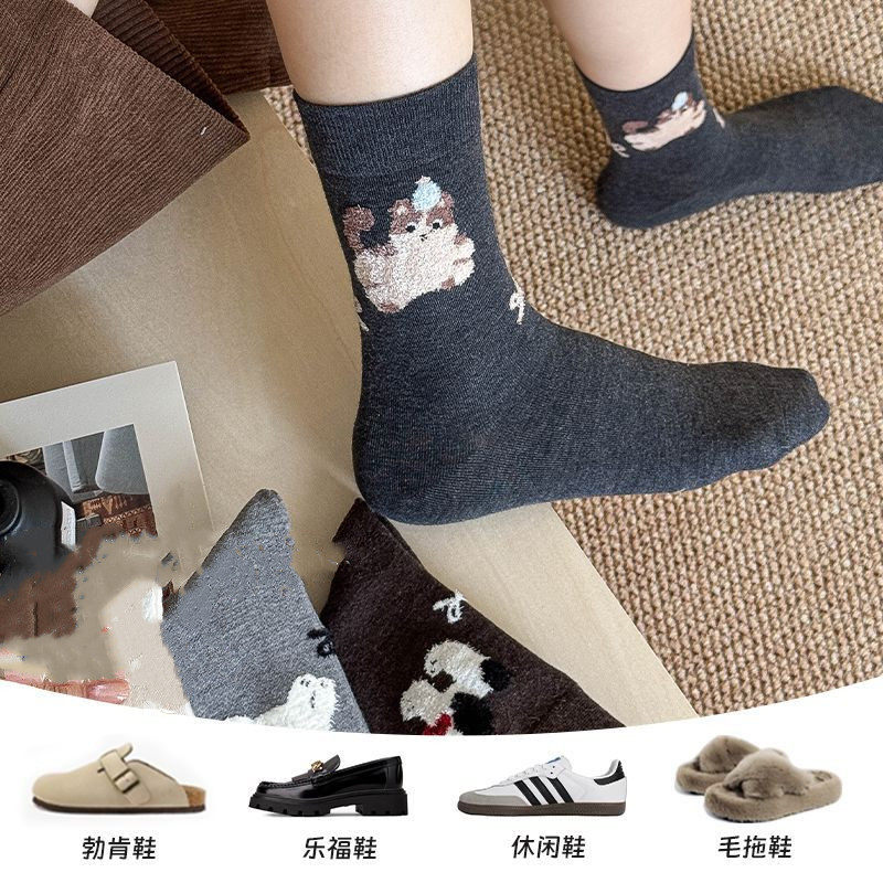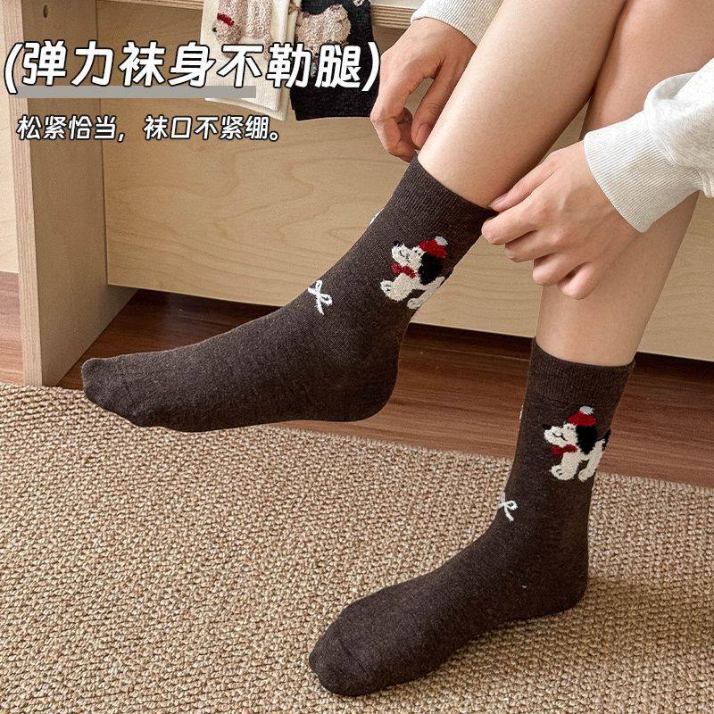 秋冬袜女可爱卡通小猫小狗中筒袜日韩时尚百搭加厚保暖无骨月子袜