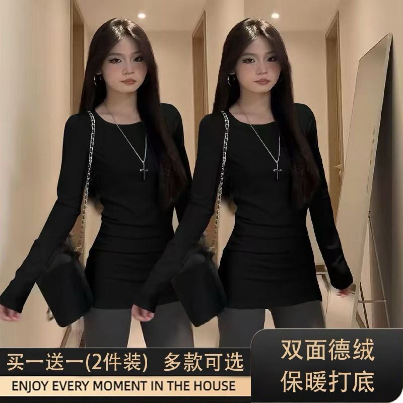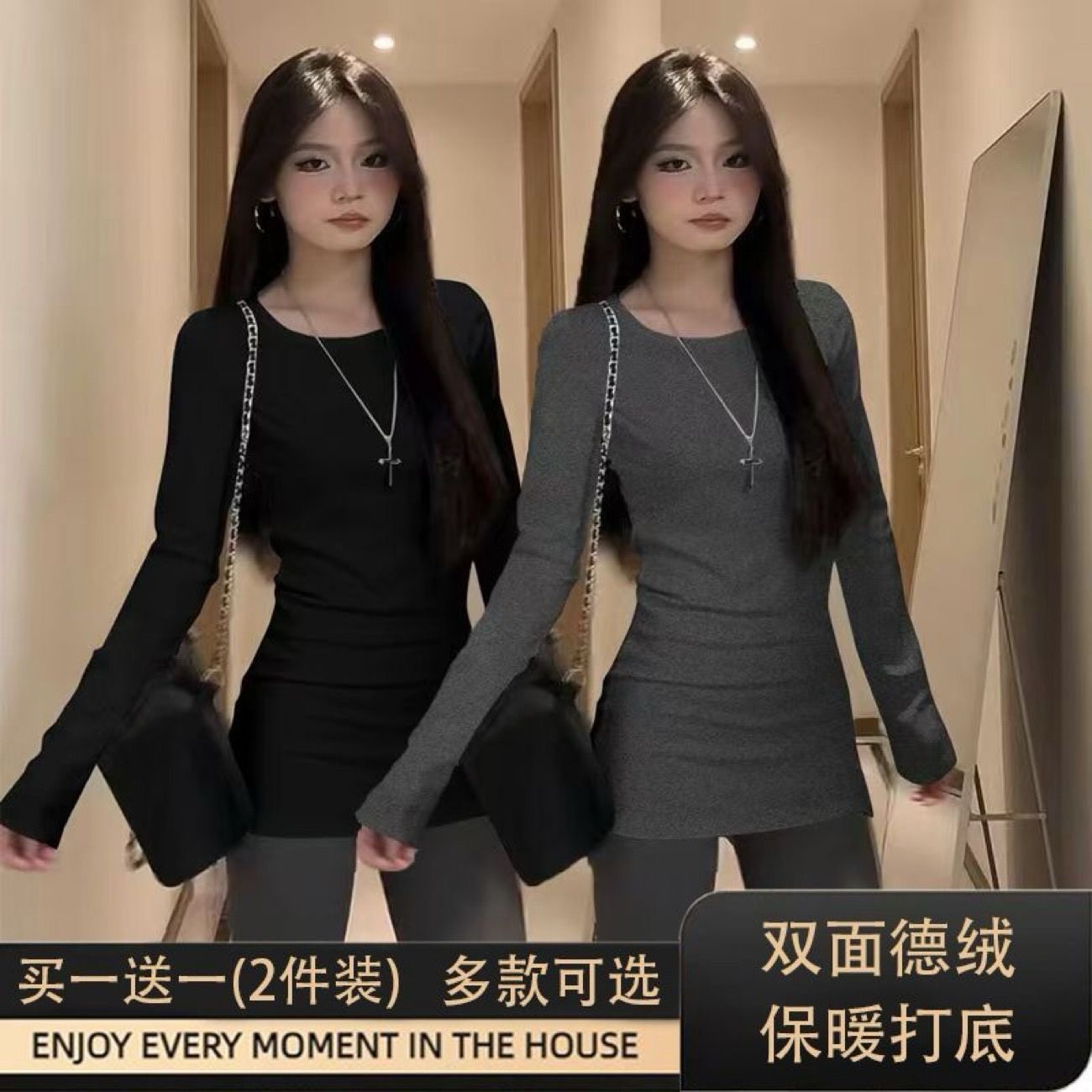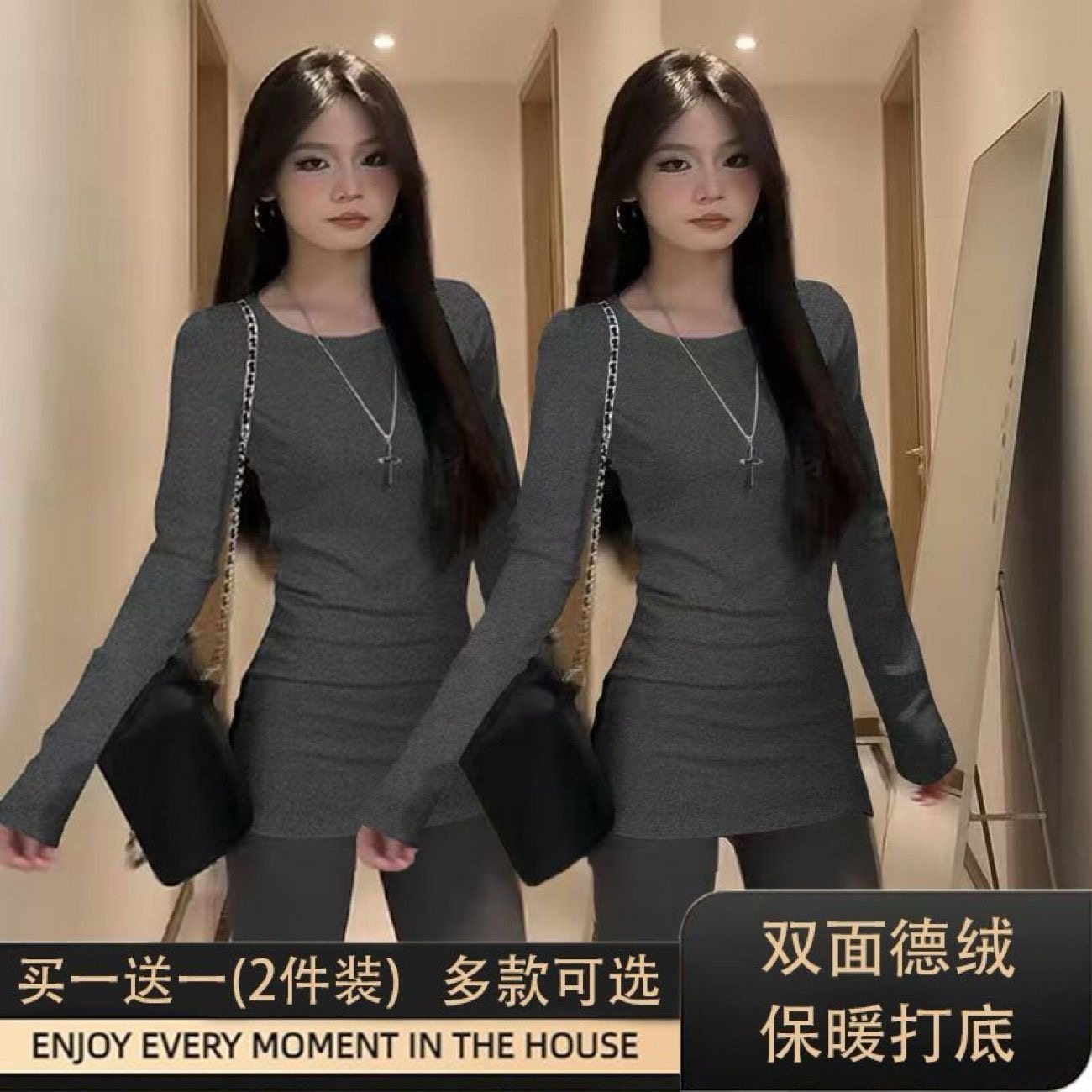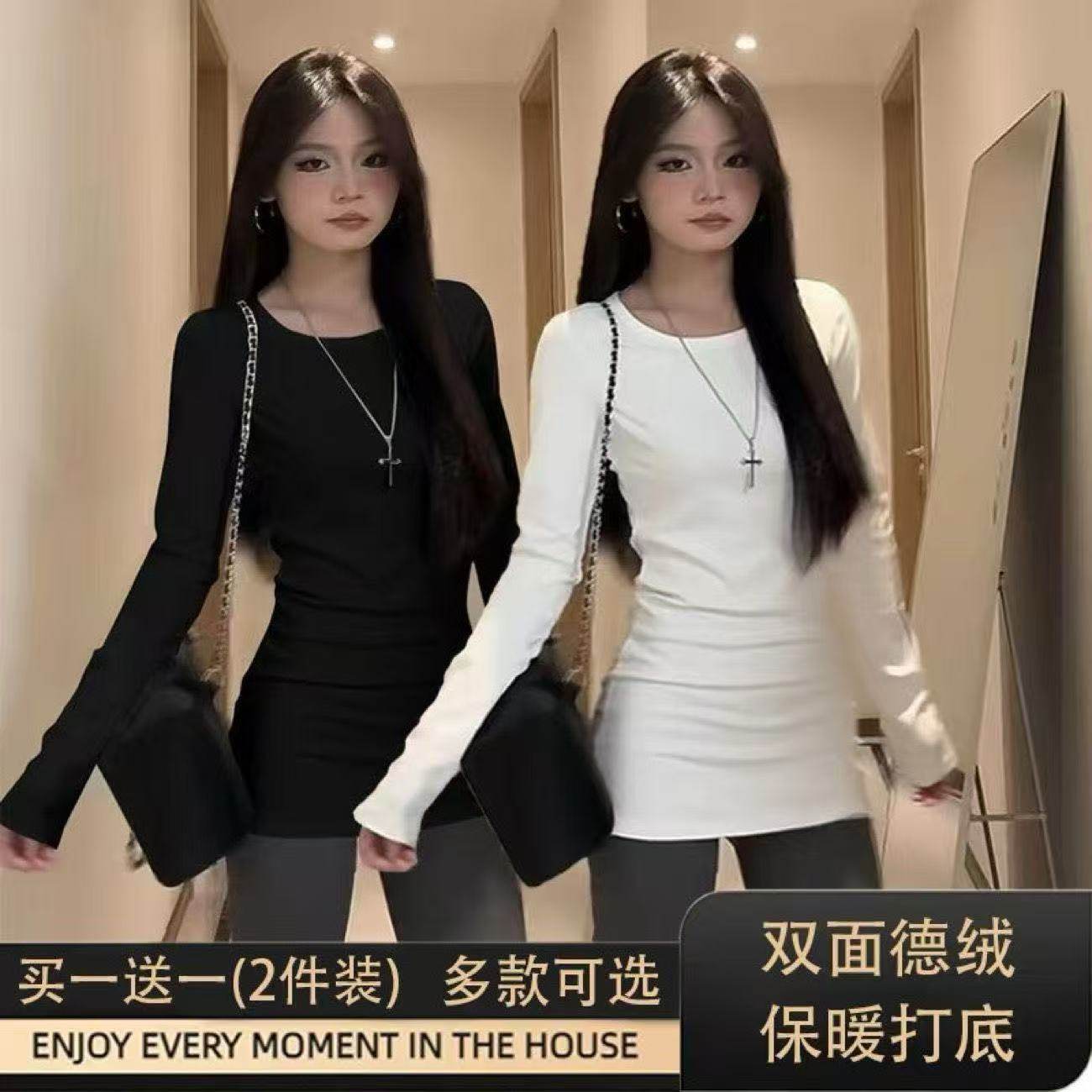 白色内搭双面德绒加厚中长款打底衫长袖t恤女遮屁股修身收腰上衣