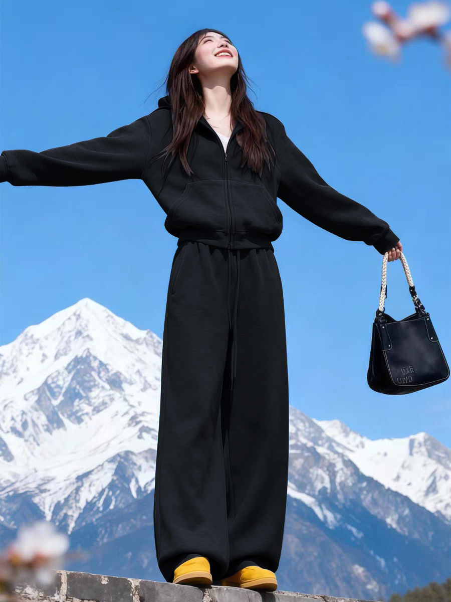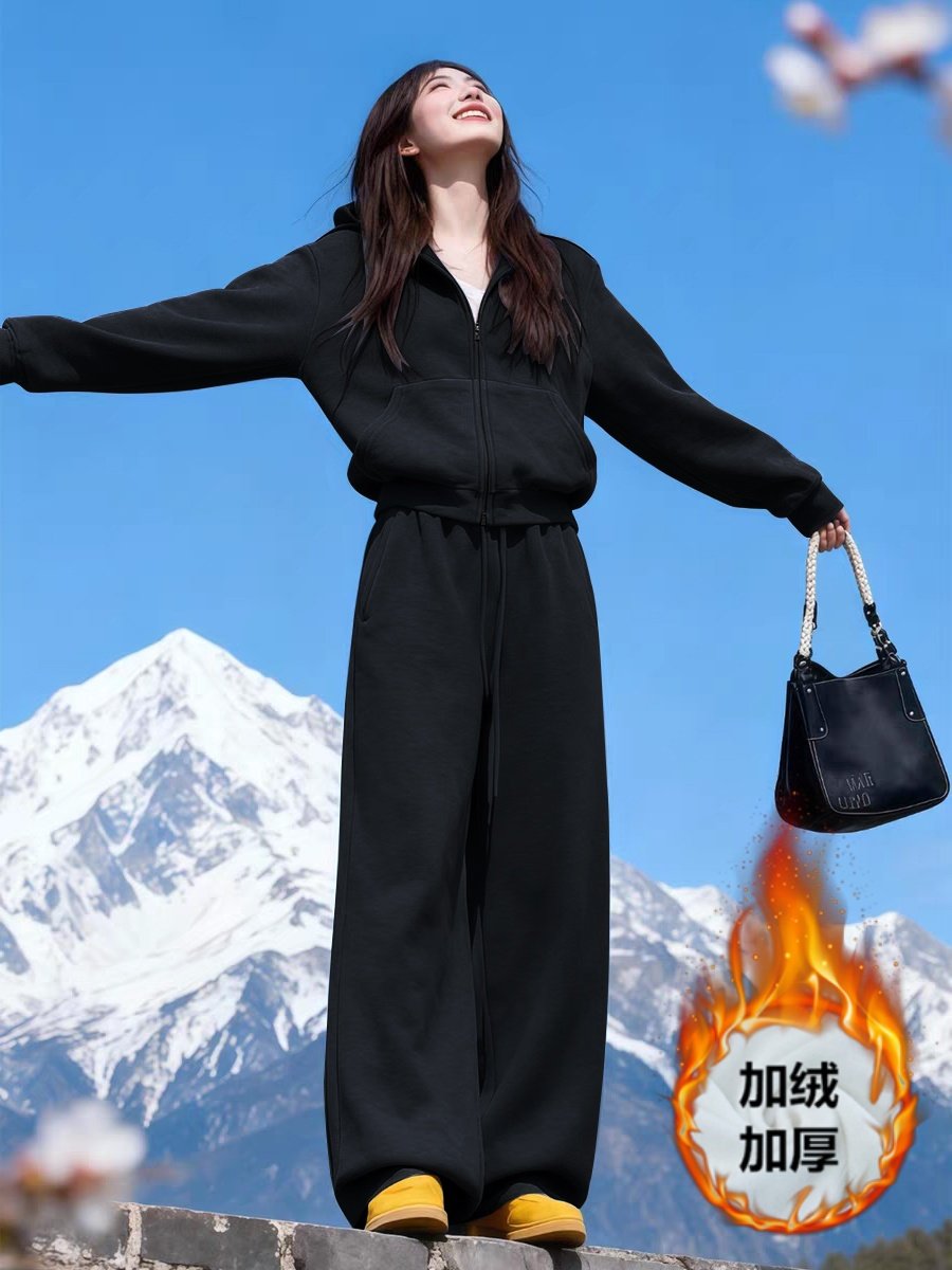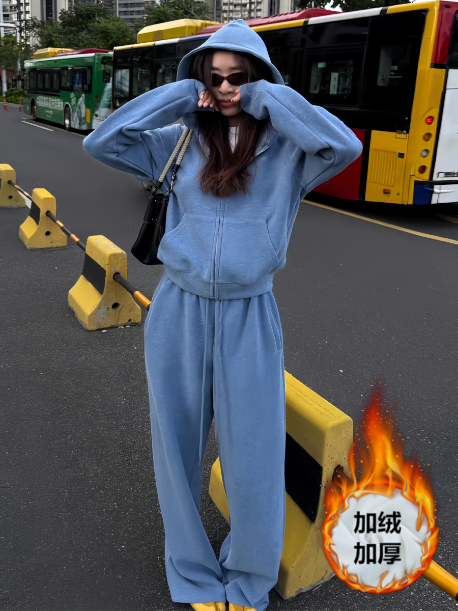 美式炸街运动服套装女秋冬加绒加厚宽松时尚卫衣休闲两件套跑步潮