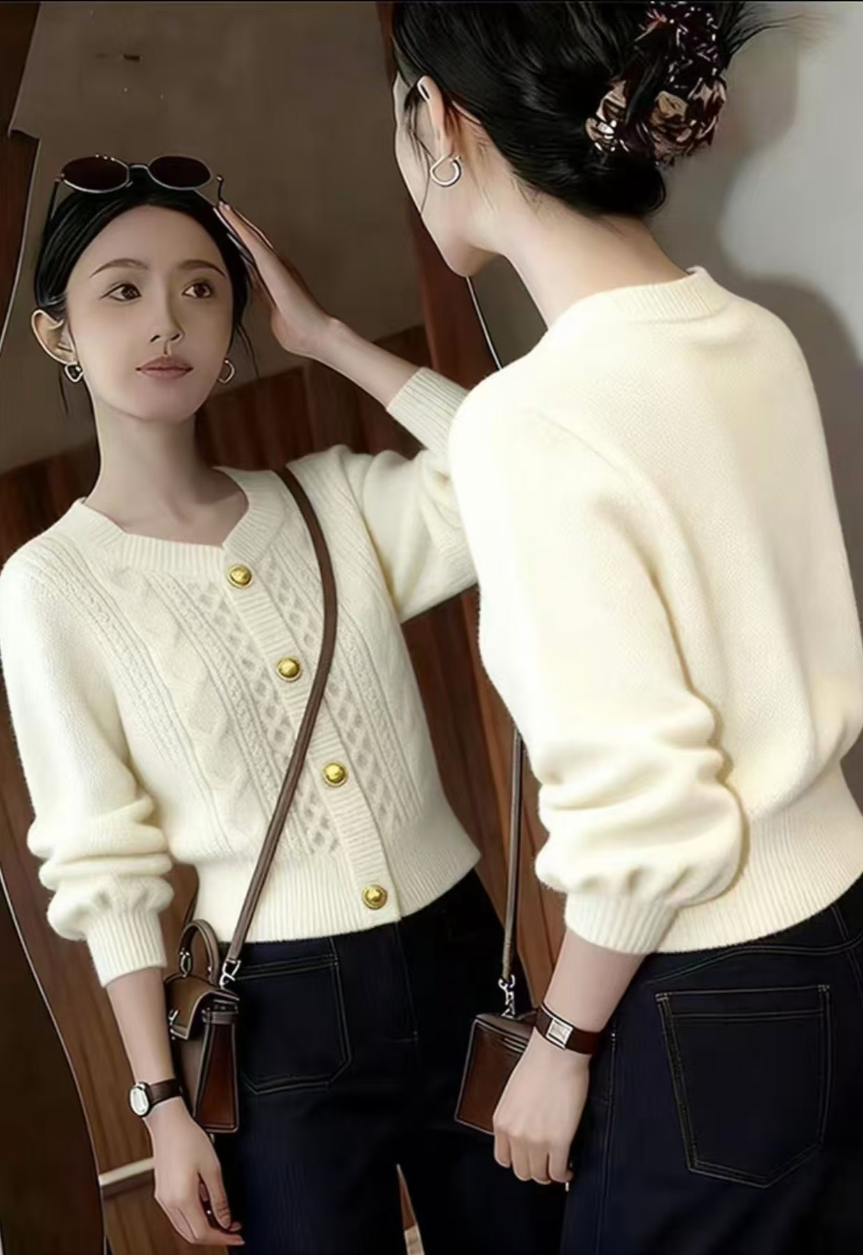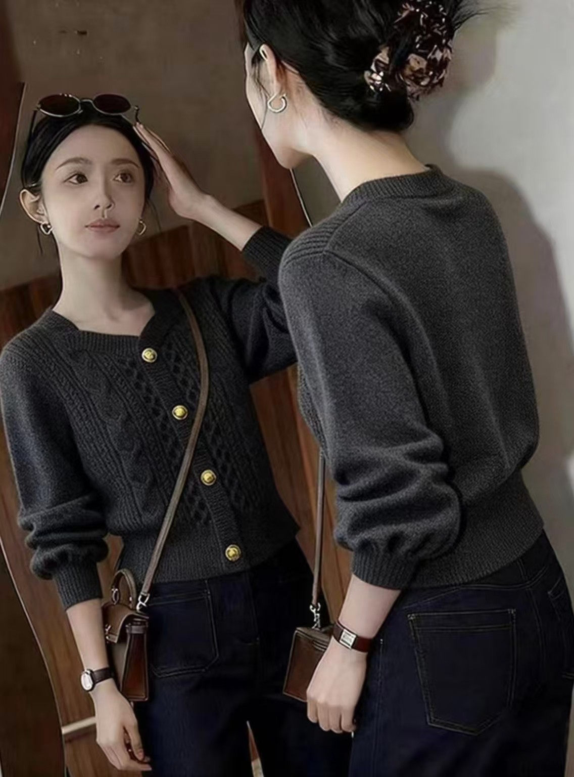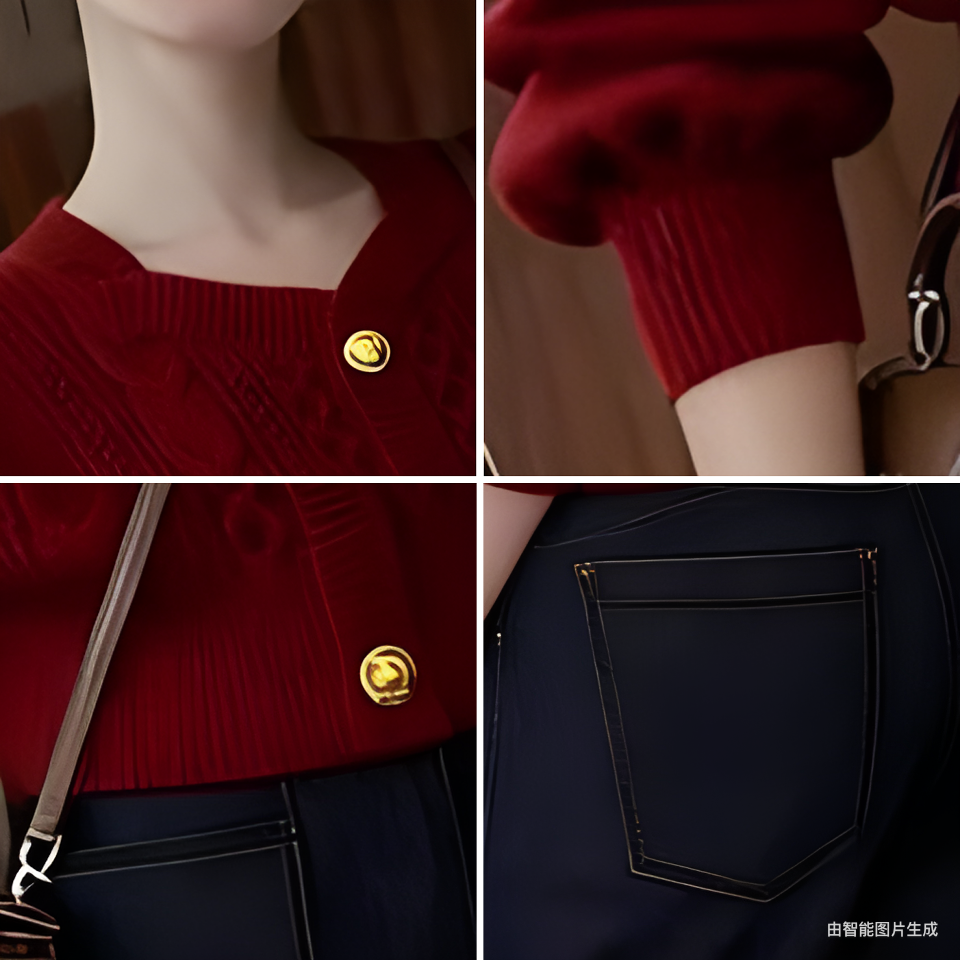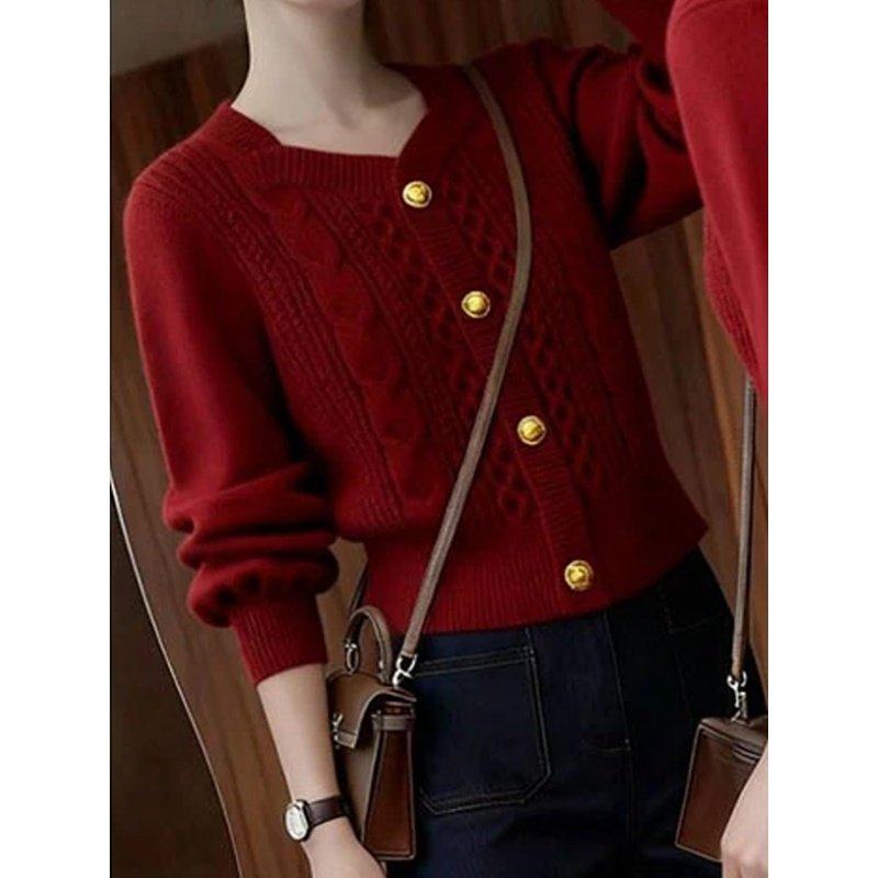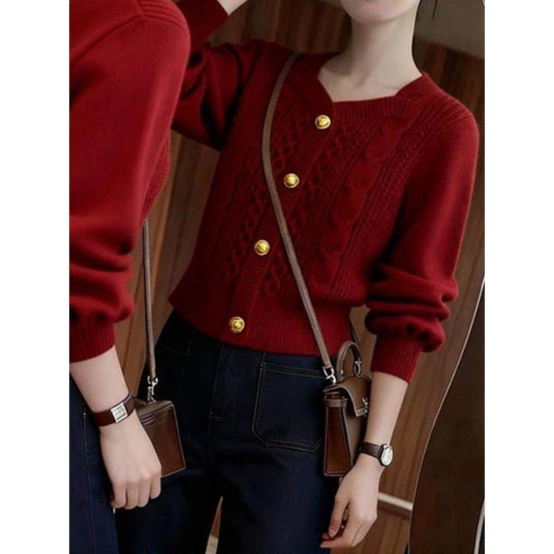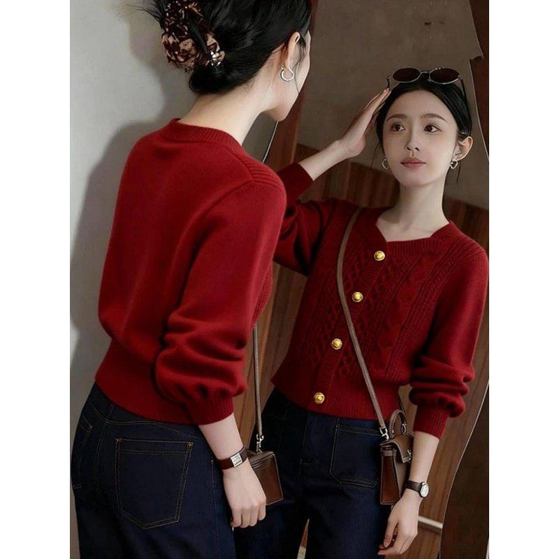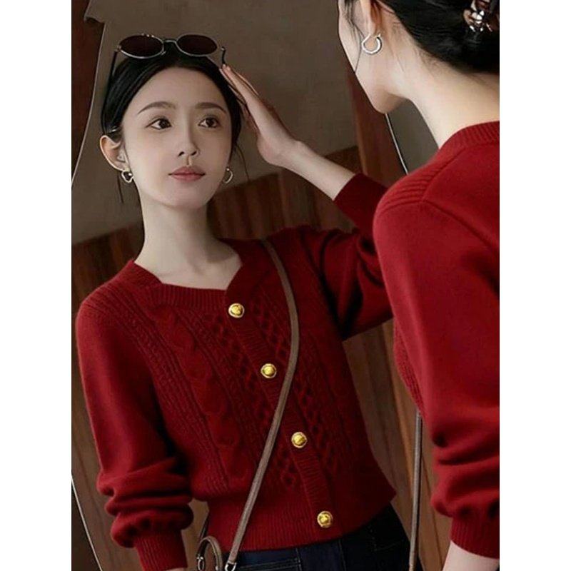 韩式红色麻花毛衣女秋冬单排扣显瘦高级感新年穿搭针织衫短款上衣