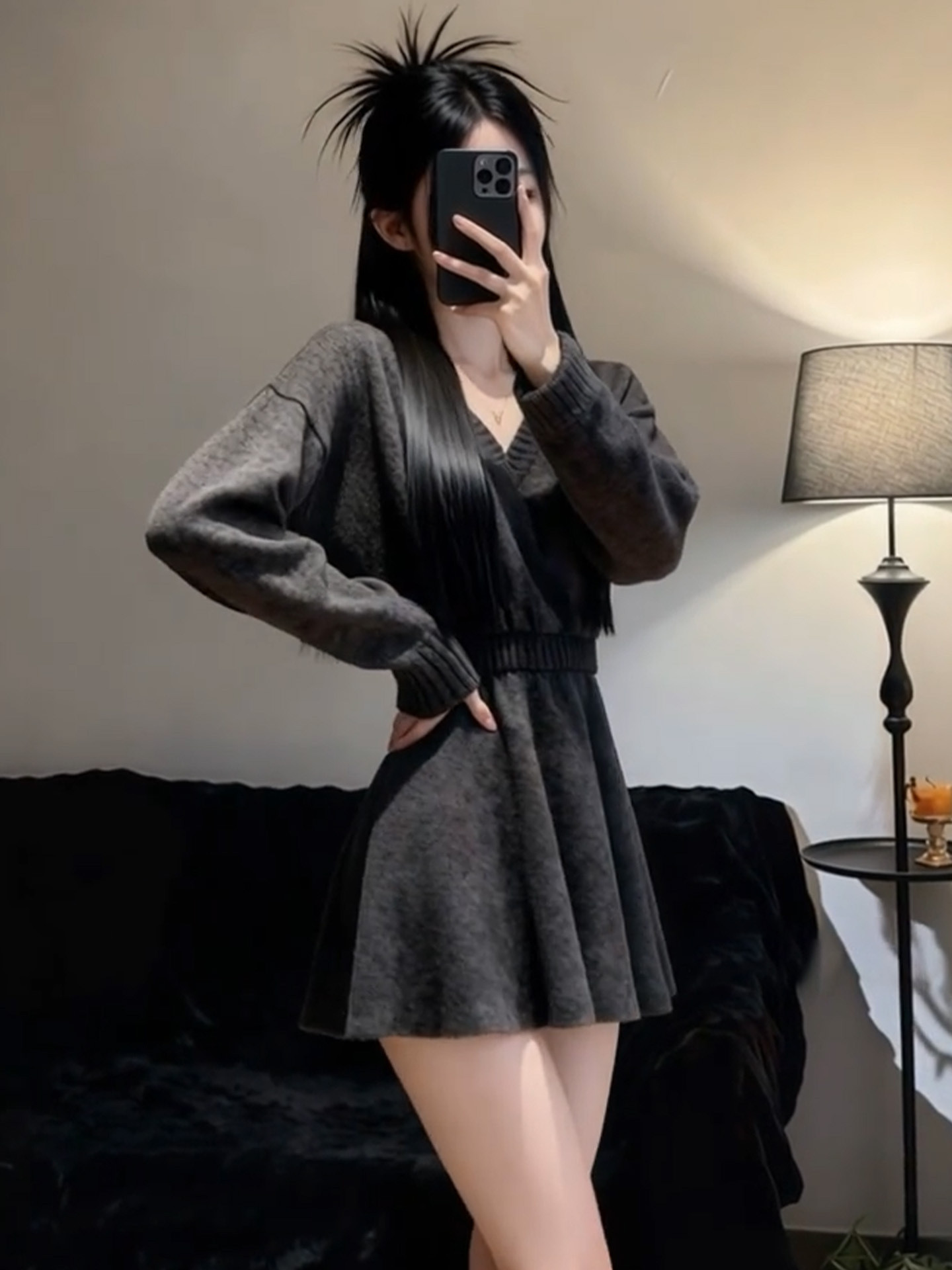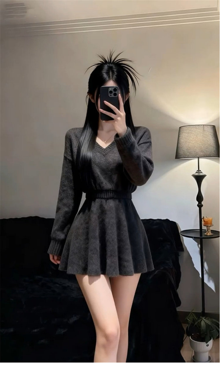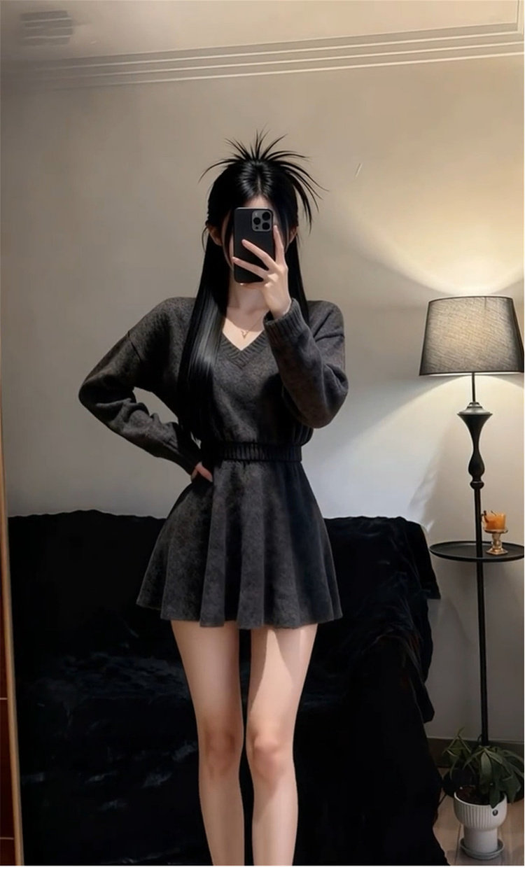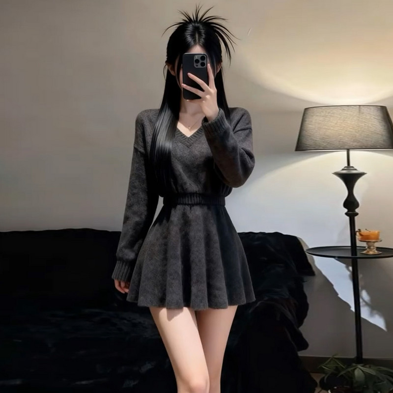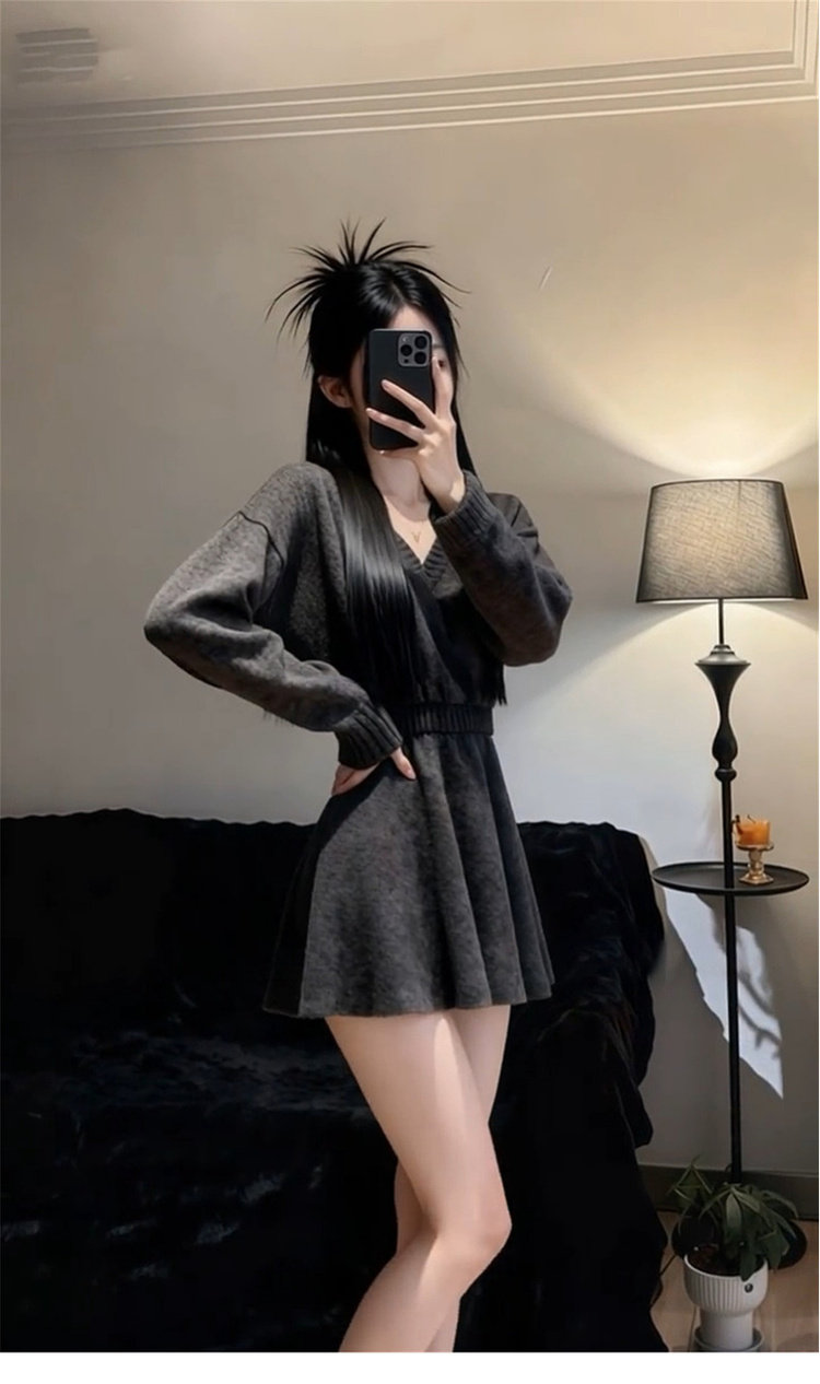 2026新款法式灰色V领长袖针织连衣裙女冬季收腰气质针织子短裙