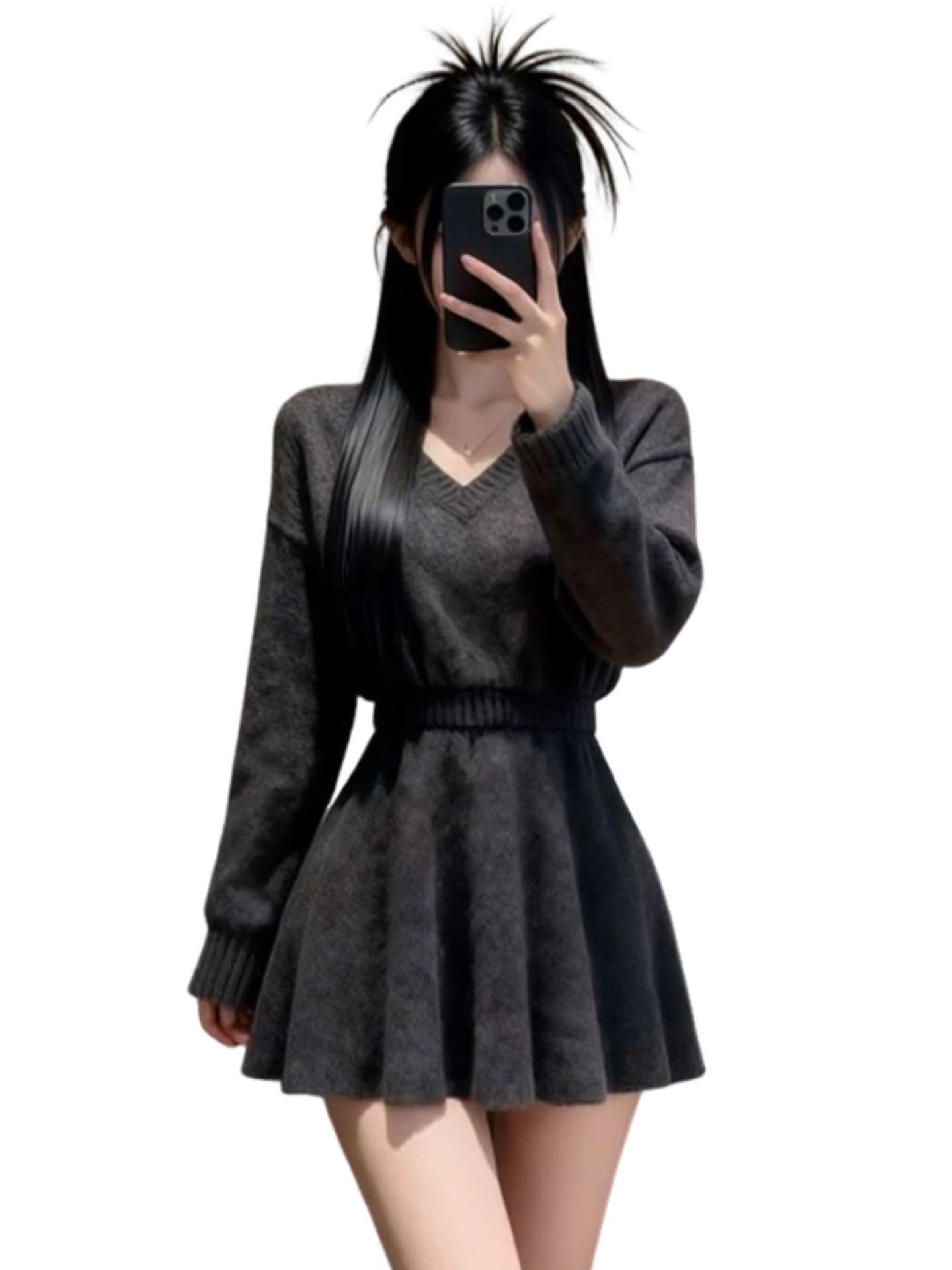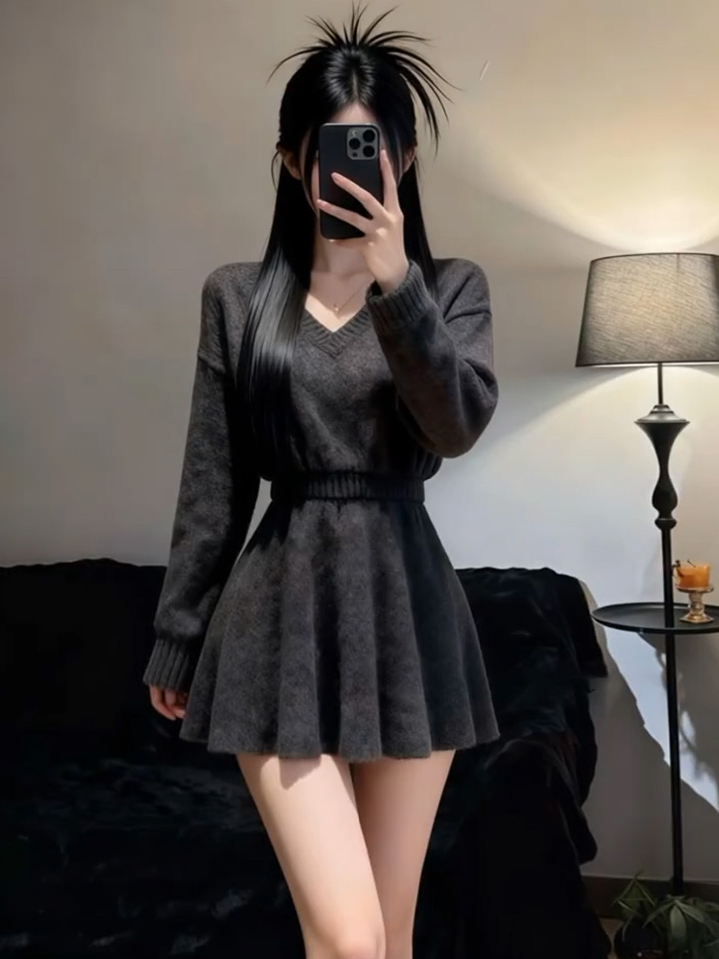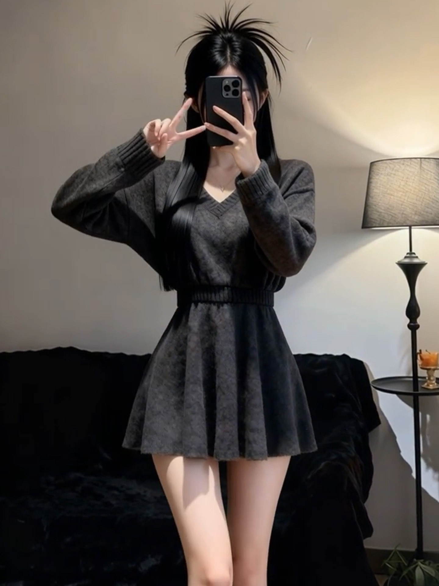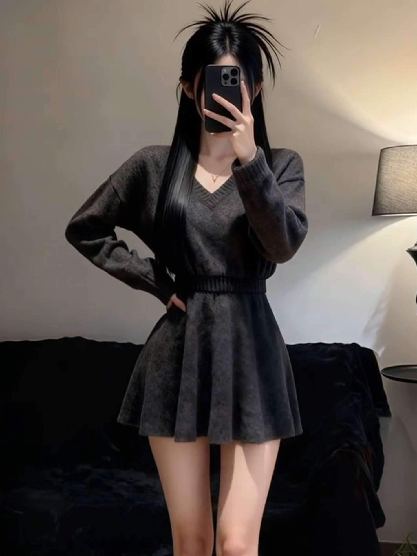 2026新款法式灰色V领长袖针织连衣裙女冬季收腰气质针织子短裙