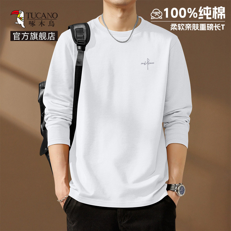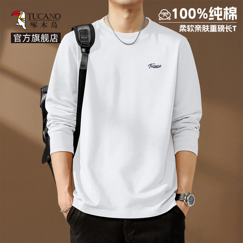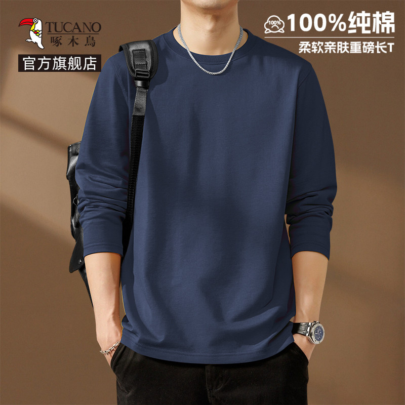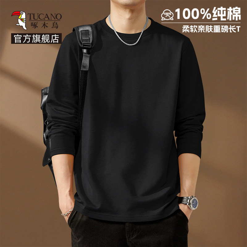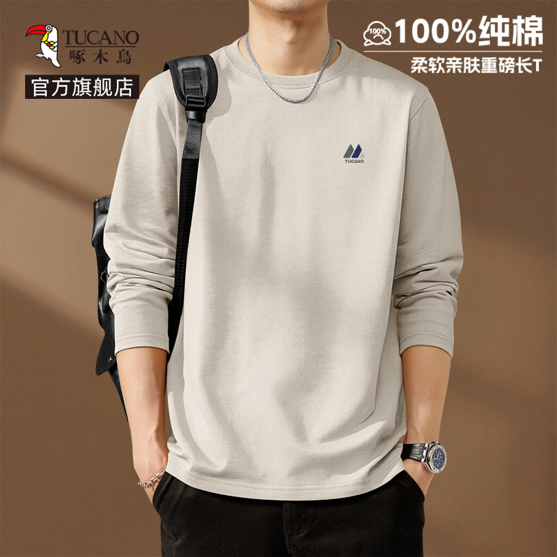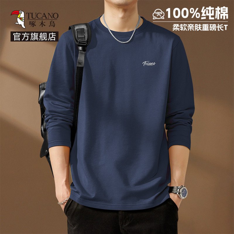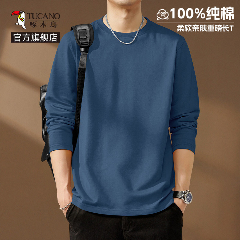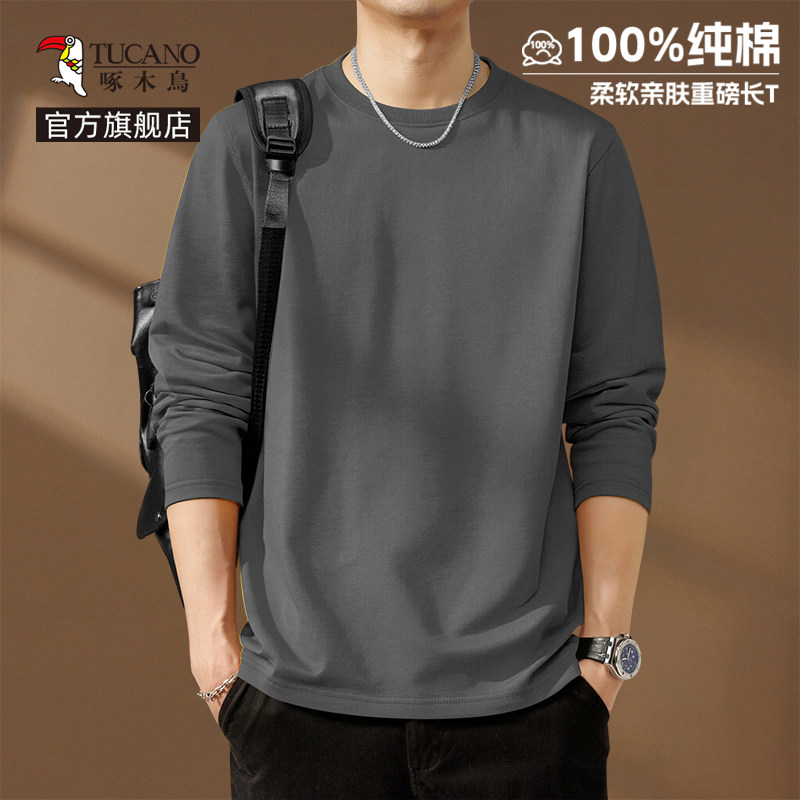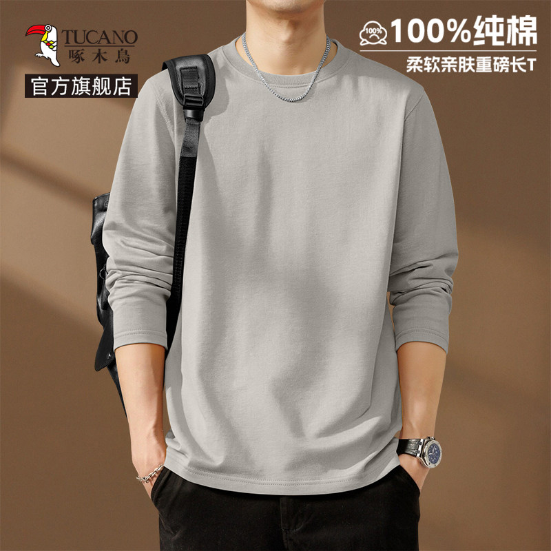啄木鸟纯棉长袖t恤男款春季休闲百搭打底衫男士宽松大码圆领上衣Y