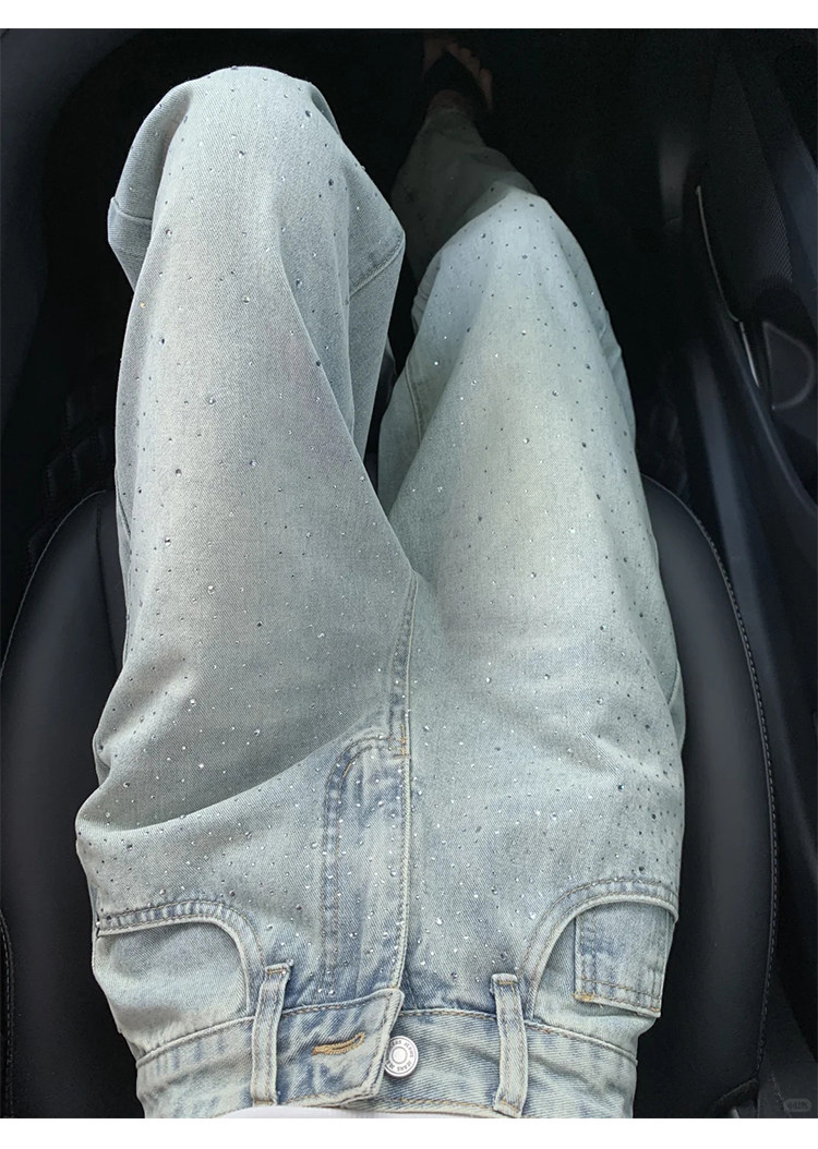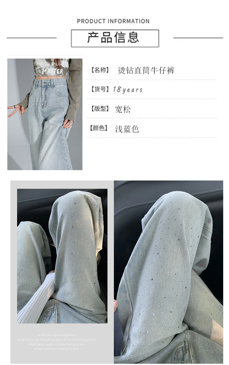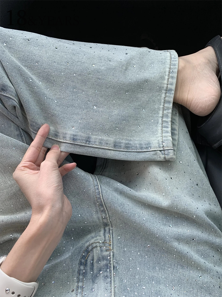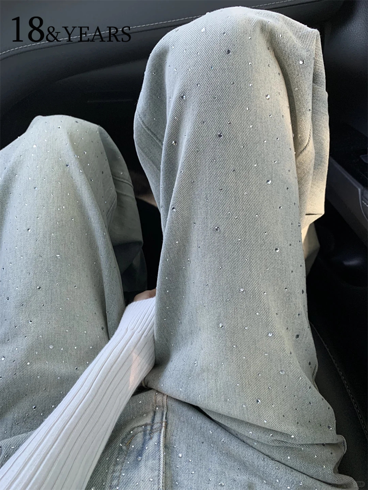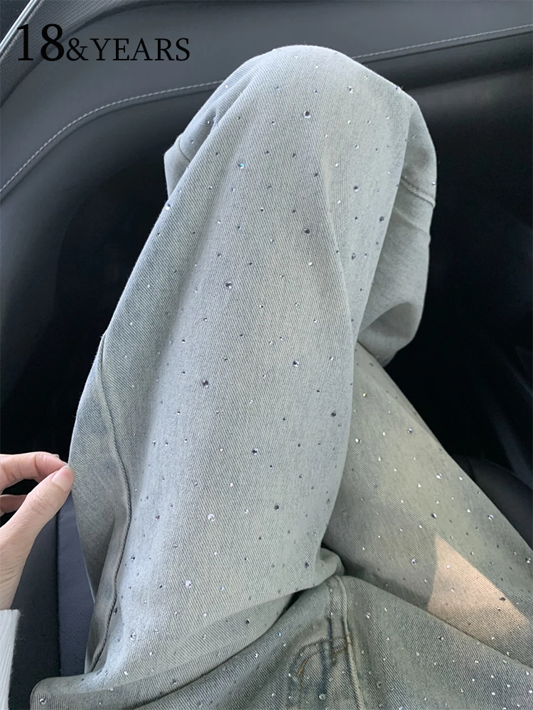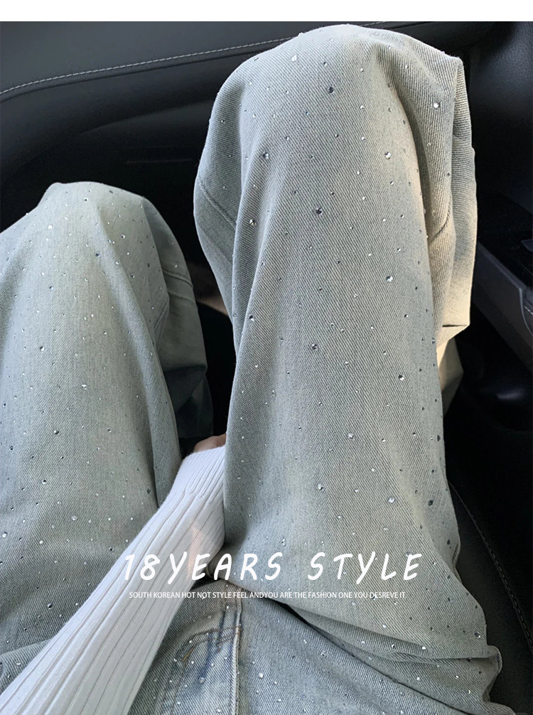 满天星带烫钻阔腿牛仔裤女2026春季新款高腰显瘦爆闪宽松直筒裤子