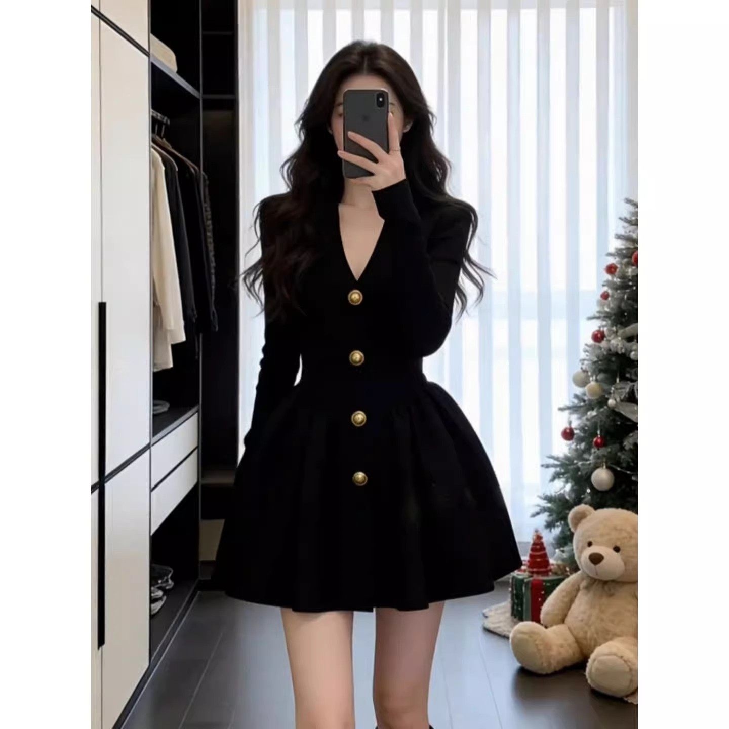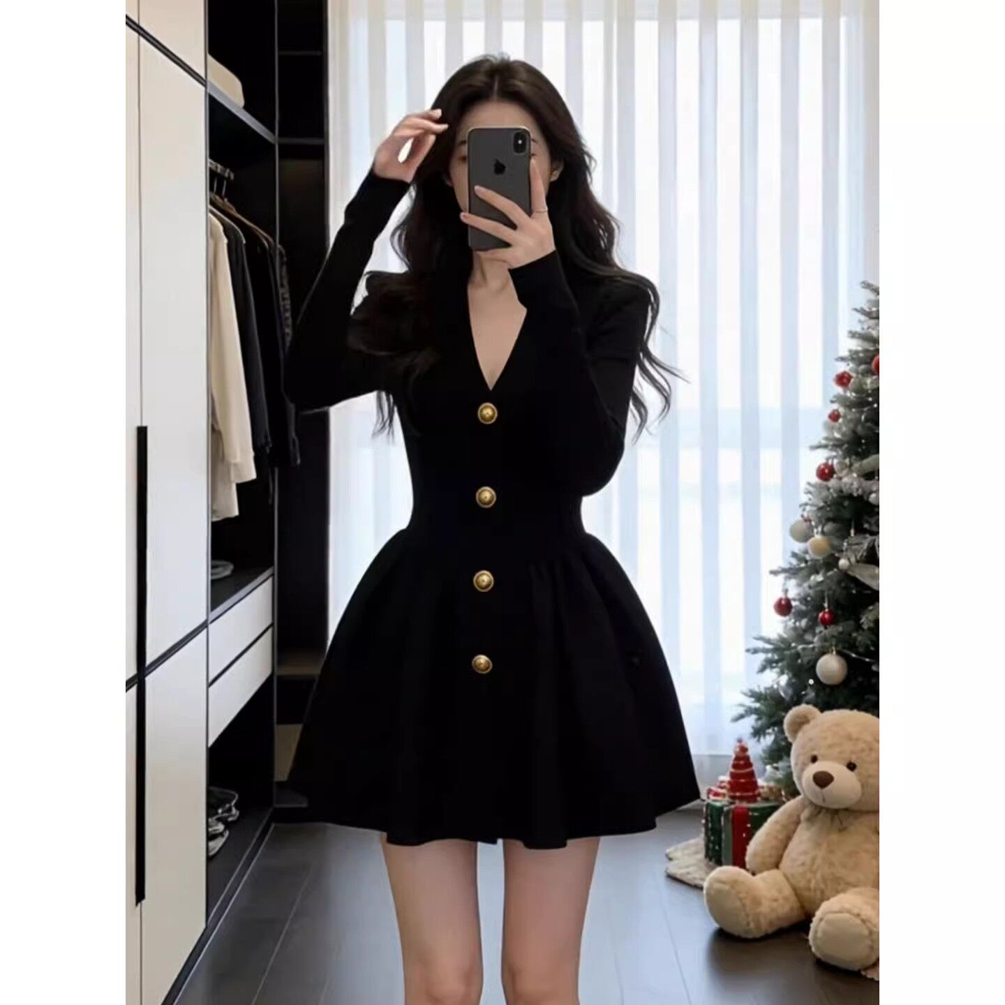 大码胖MM法式千金风黑色V领连衣裙女春季新款长袖收腰A字显瘦短裙