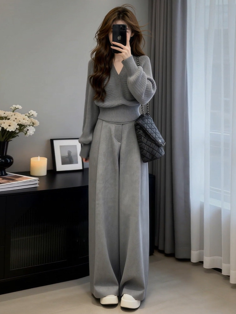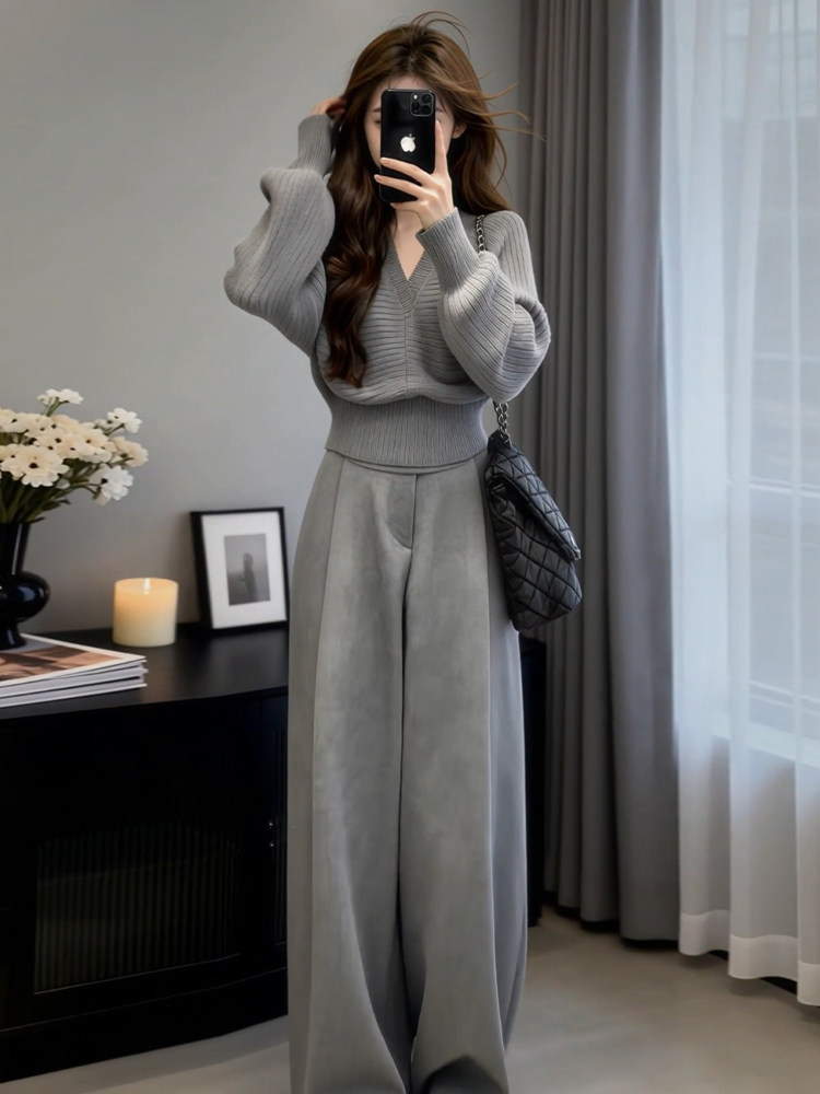 春2026御姐穿搭一整套休闲漂亮独特设计感炸街减龄毛衣阔腿裤套装