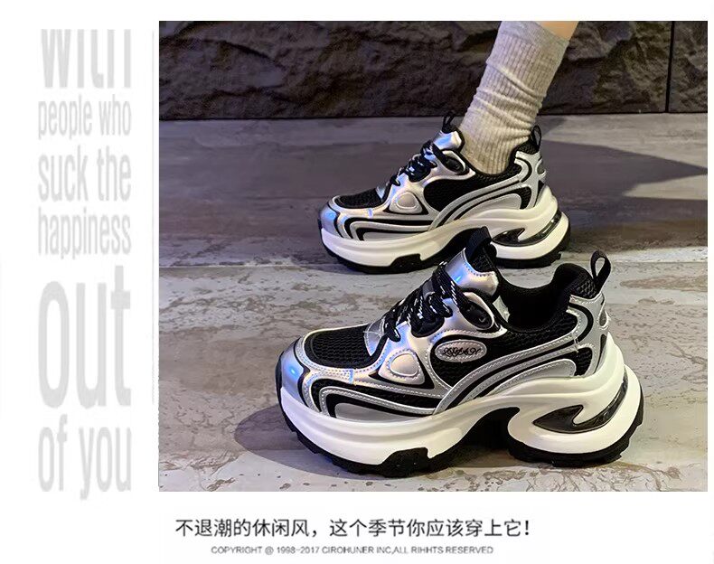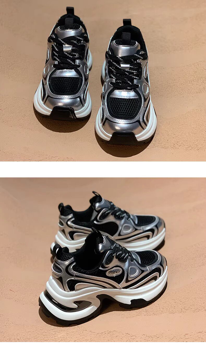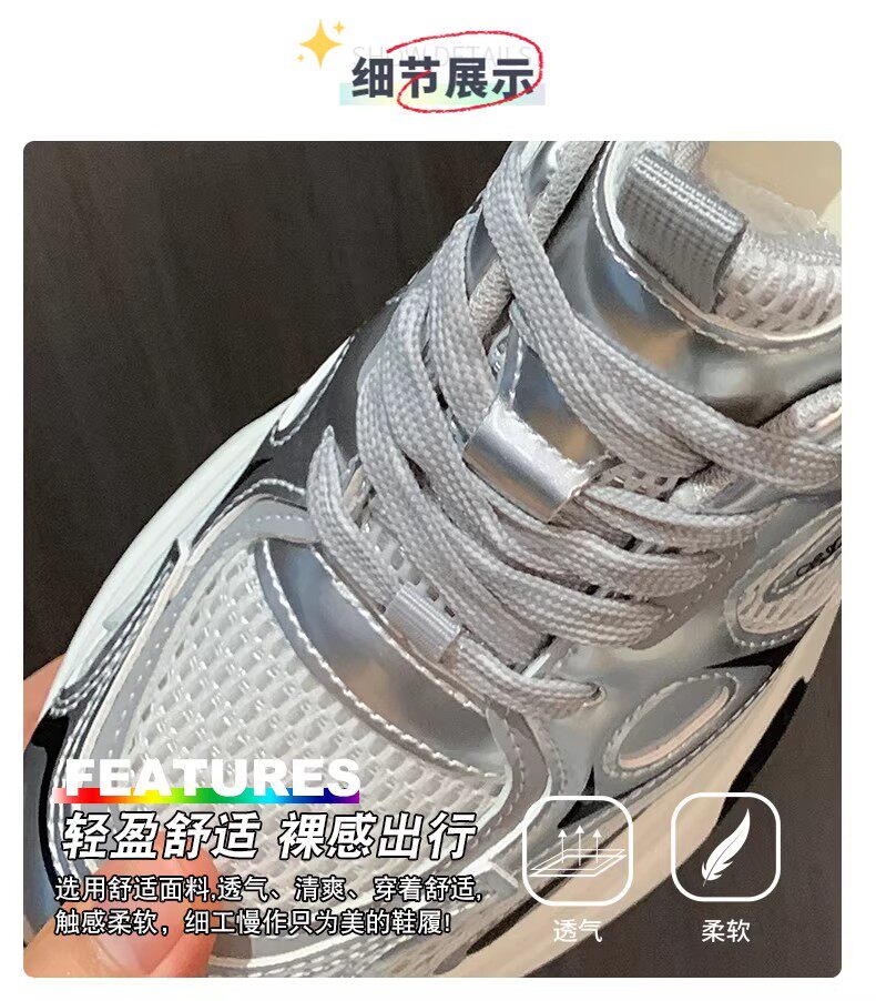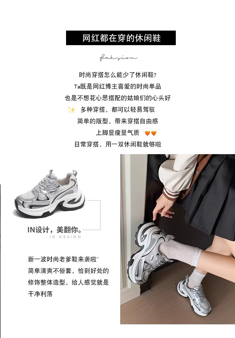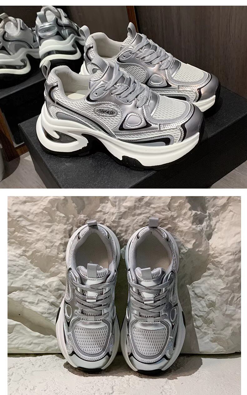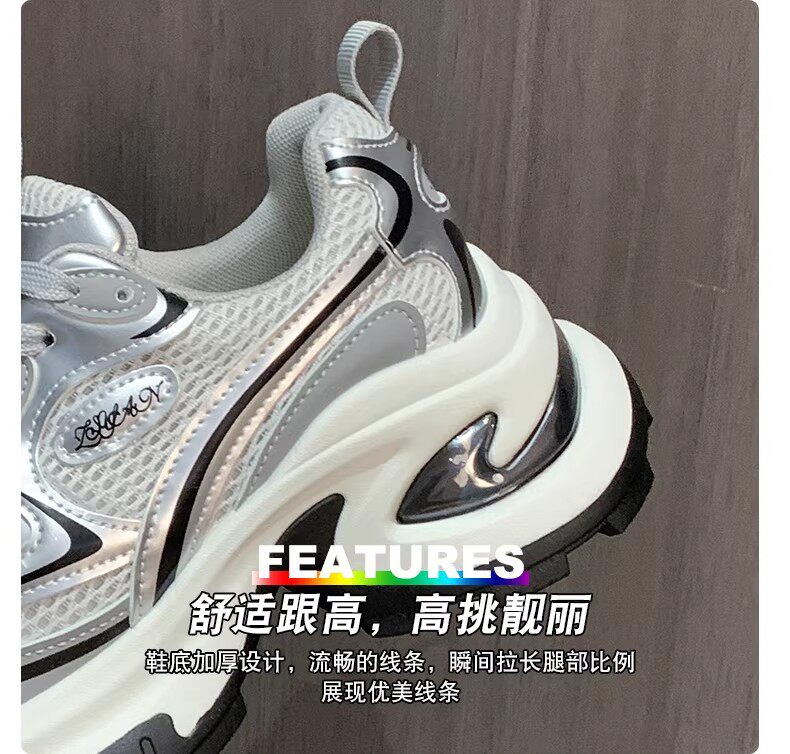 白鹿同款厚底老爹鞋女小个子增高2026春秋透气银色运动休闲鞋34码