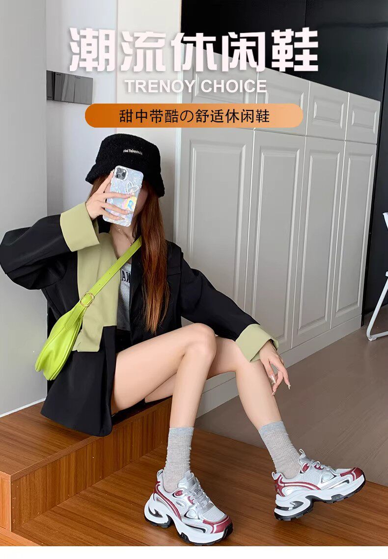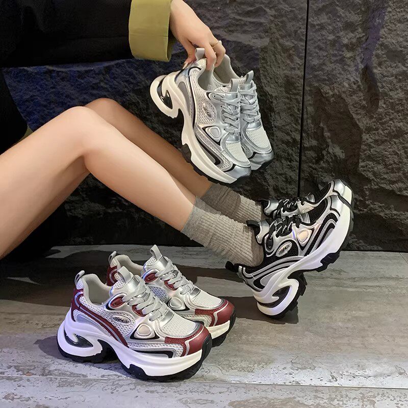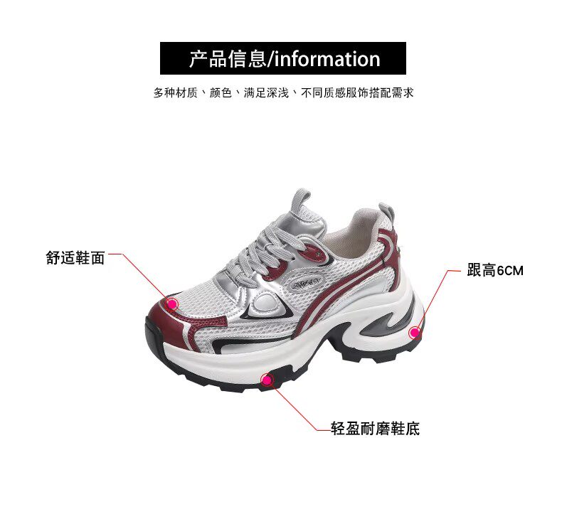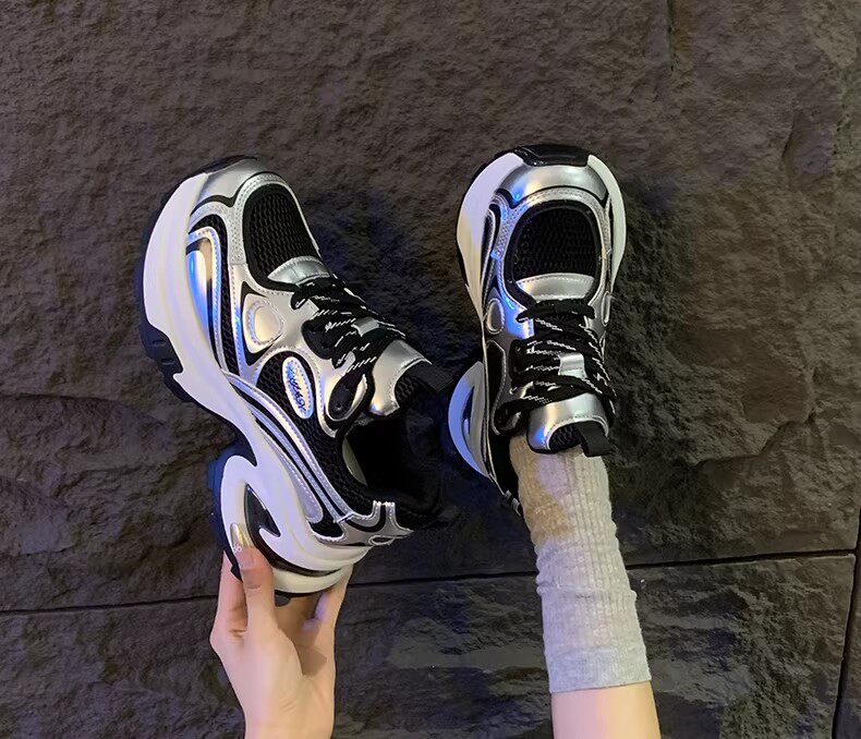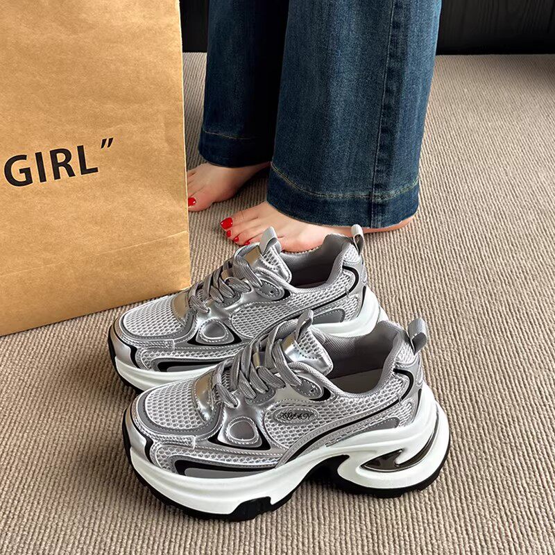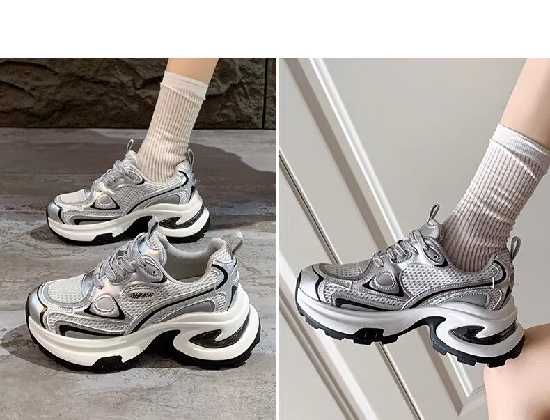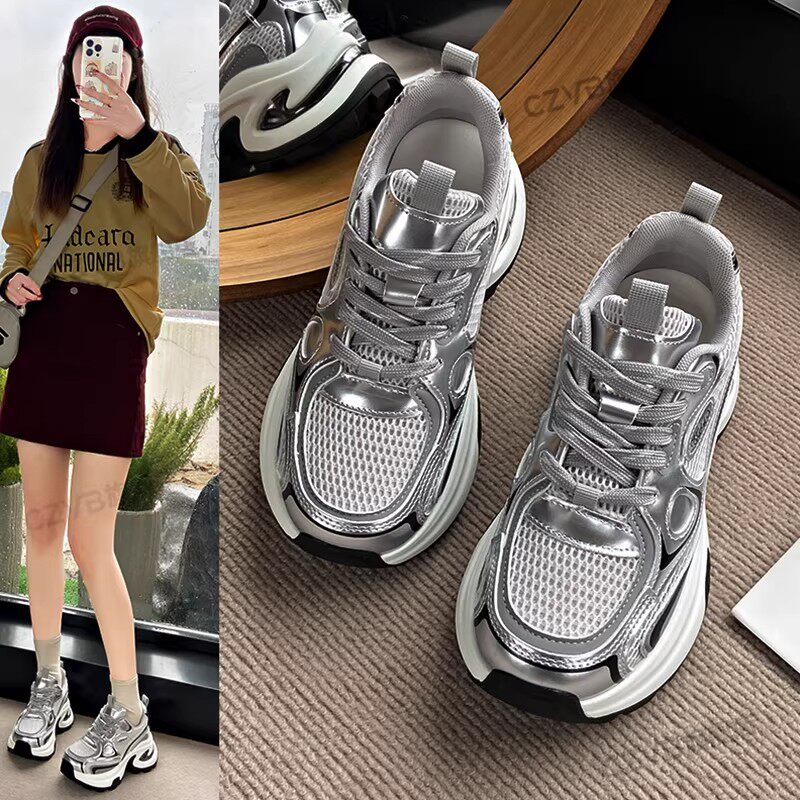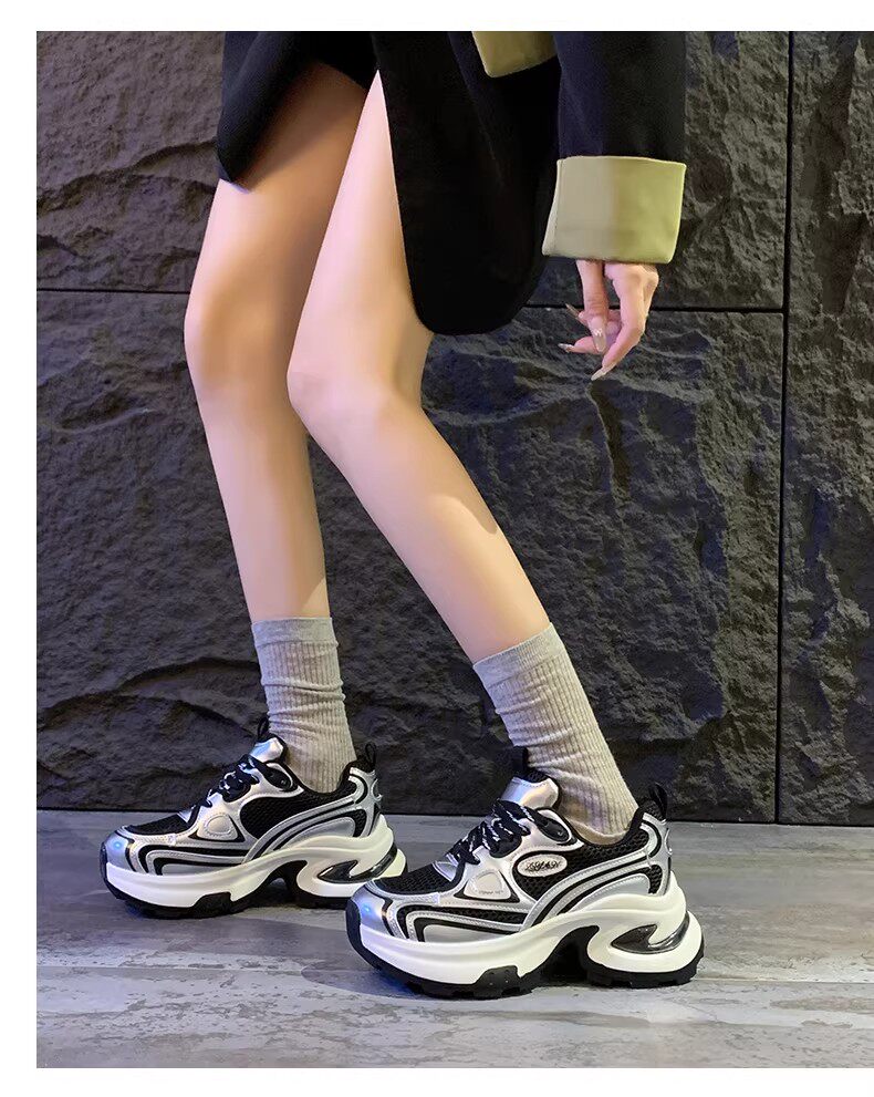 白鹿同款厚底老爹鞋女小个子增高2026春秋透气银色运动休闲鞋34码