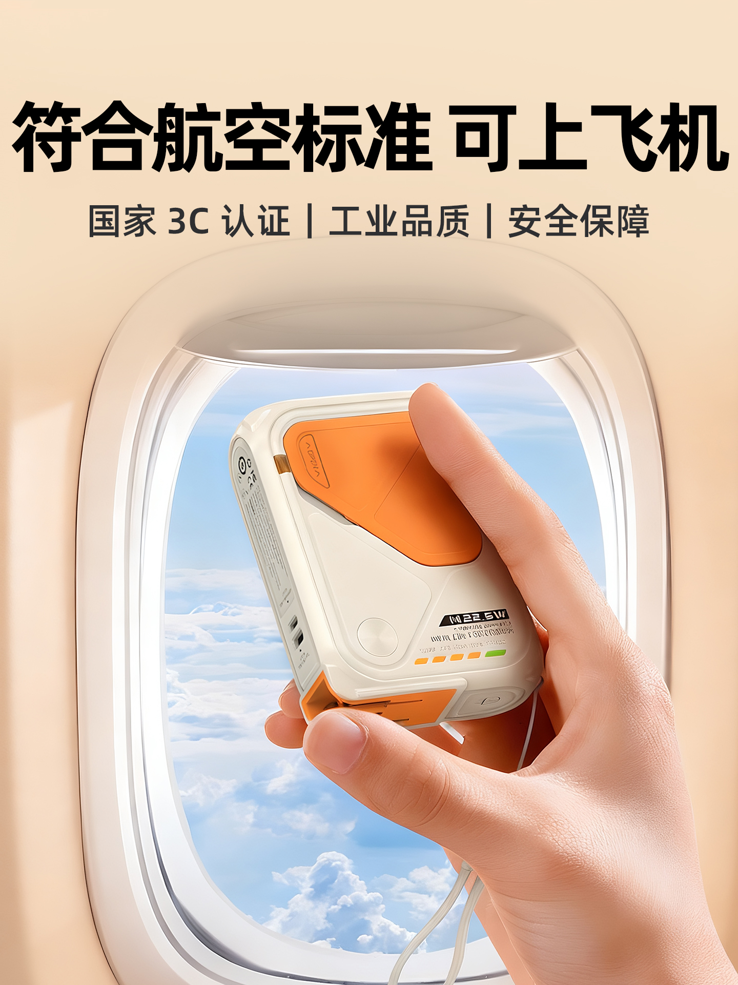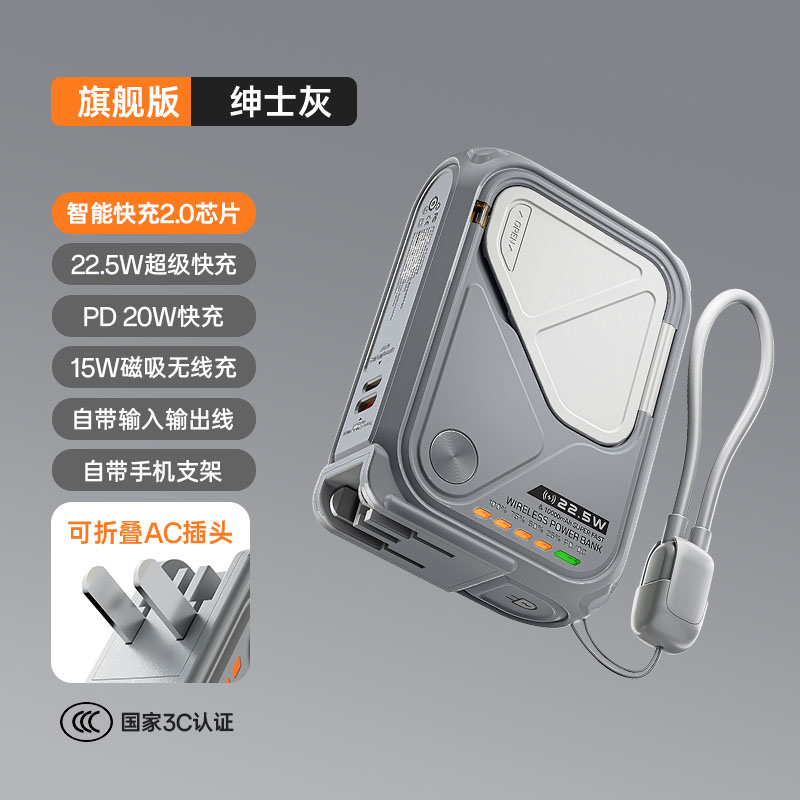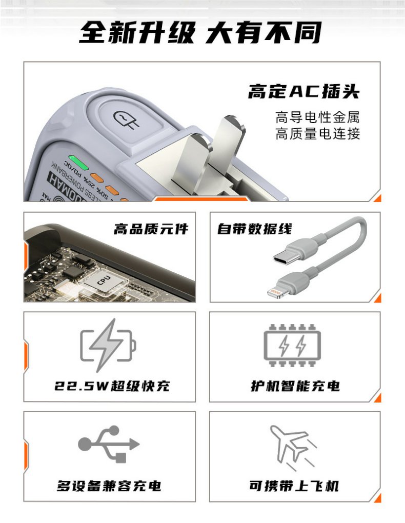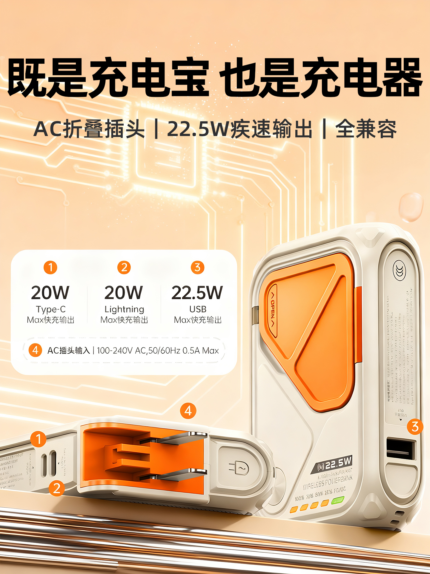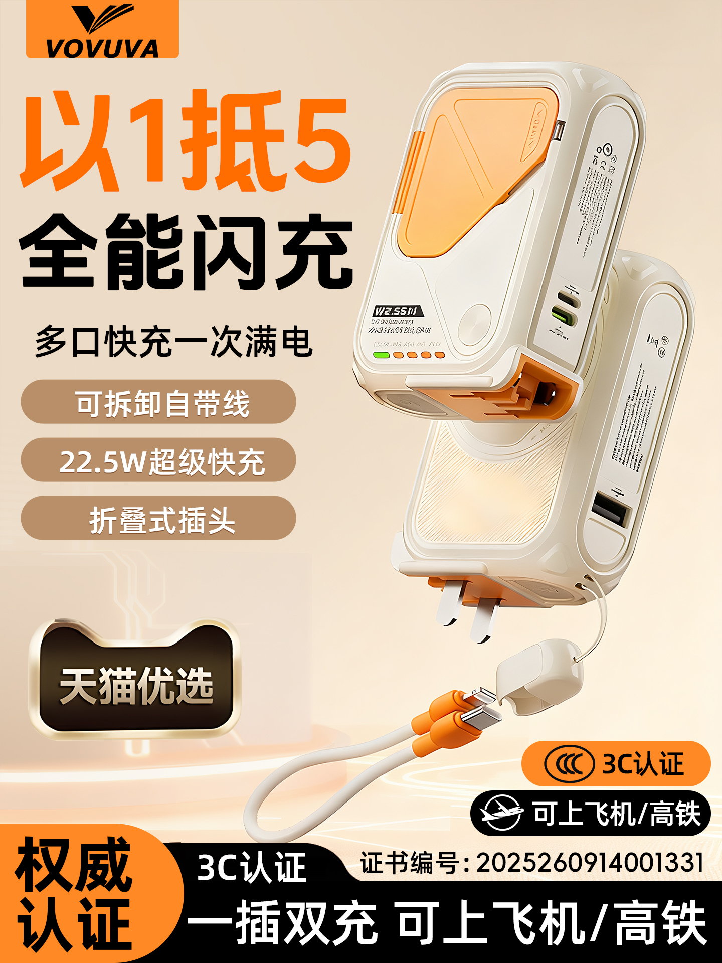 【3C认证充电宝】VOVUVA自带AC插头五合一20000毫安快充磁吸无线大容量充电宝苹果安卓通用移动电源可上飞机