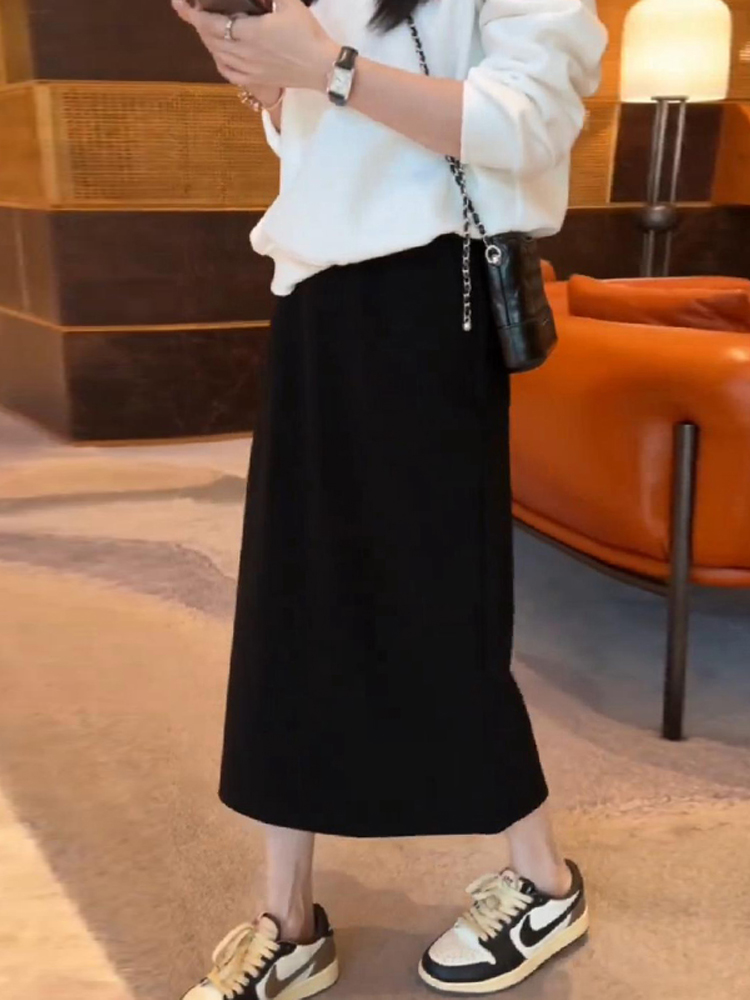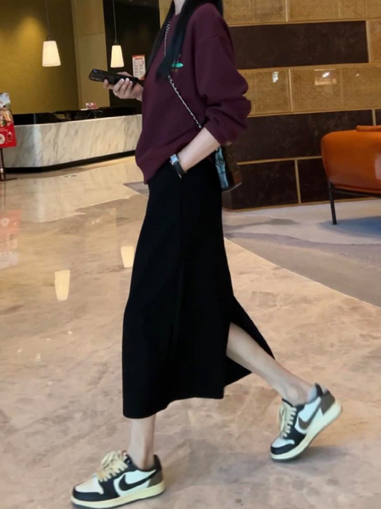 大码黑色中长款A字半身裙女秋冬小个子胖mm高腰显瘦后开叉直筒裙