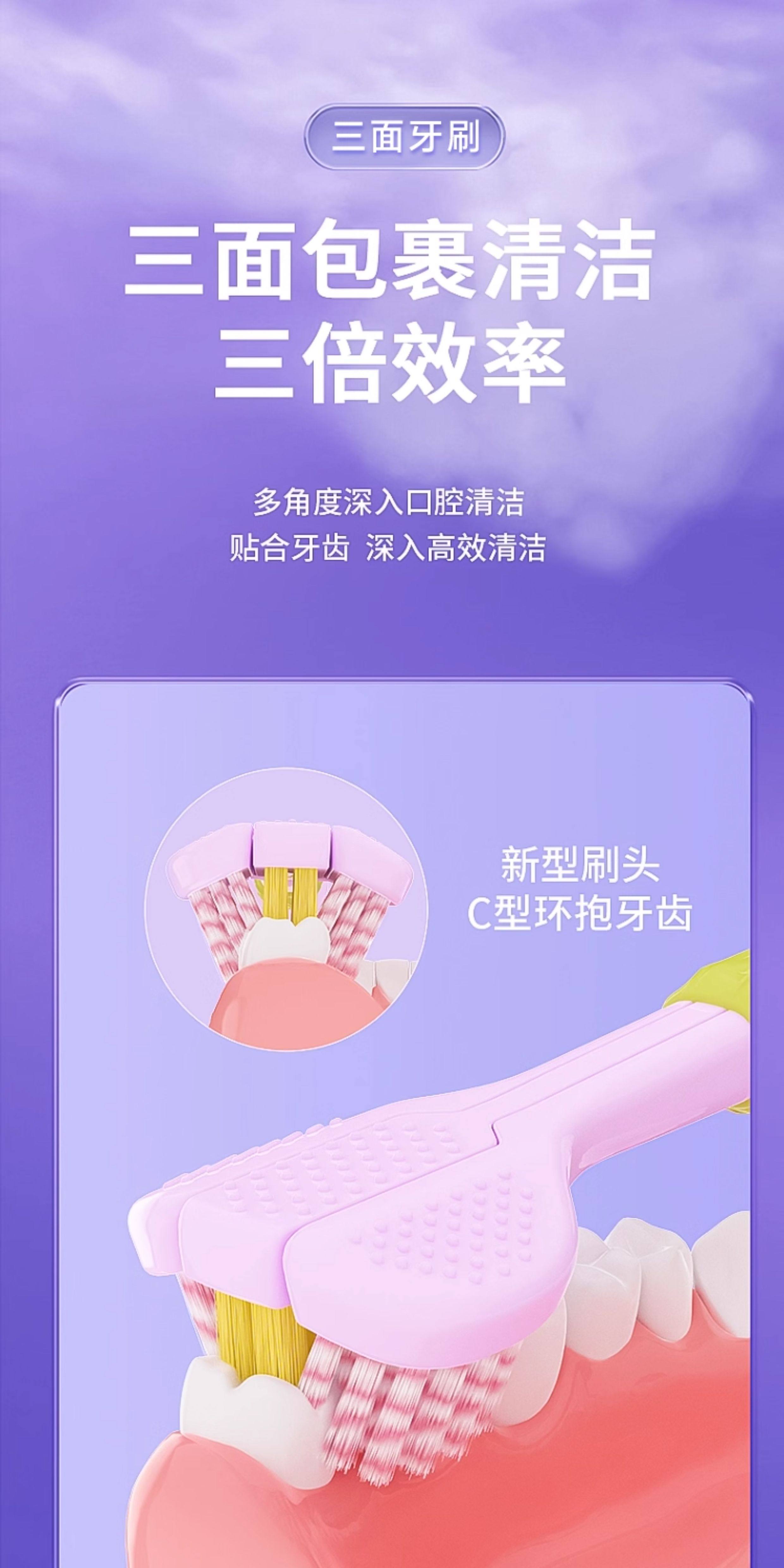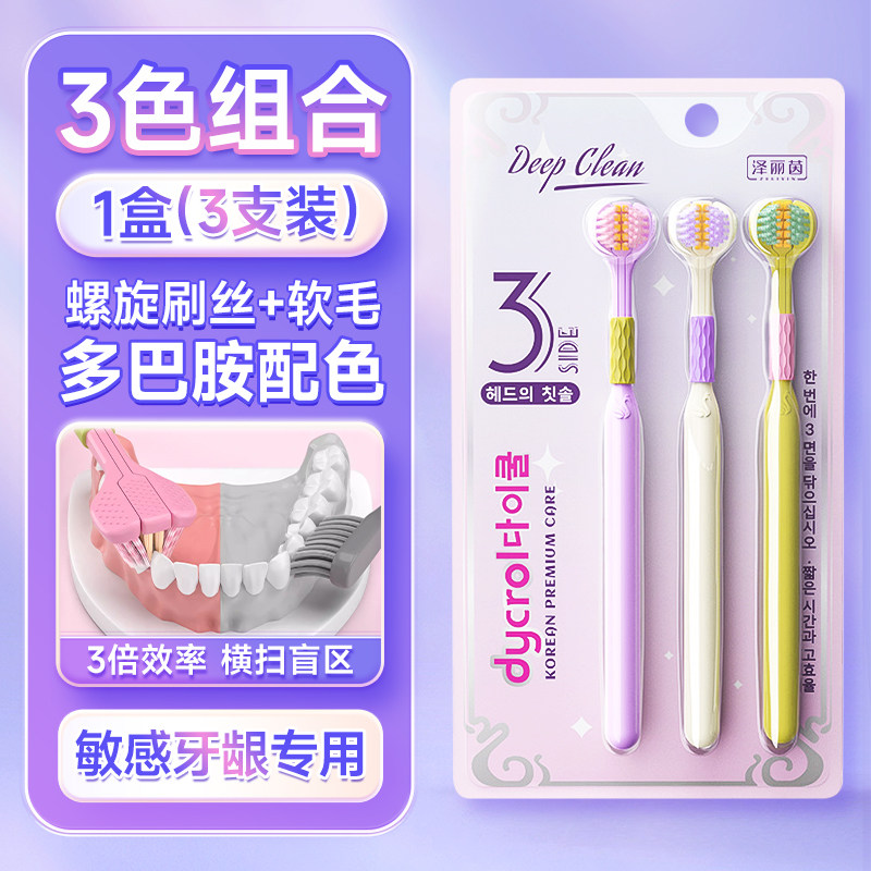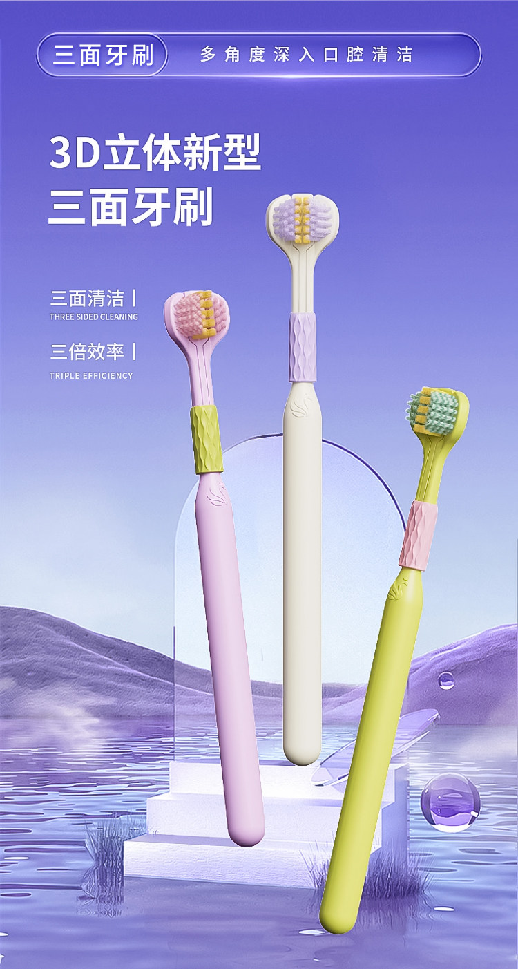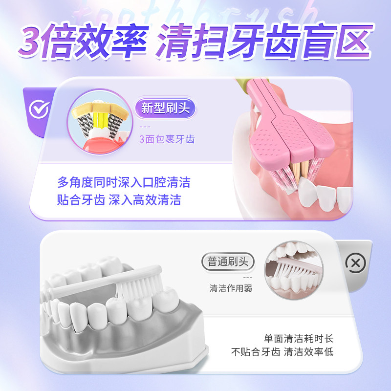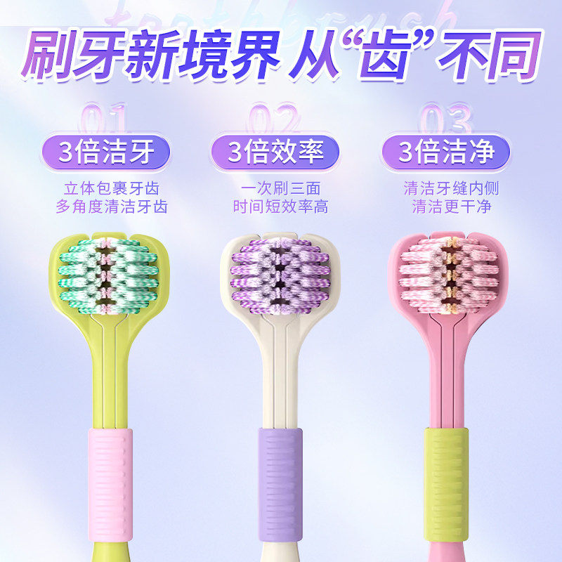 三面牙刷成人软毛男女专用可刮舌苔全面包裹清洁家庭装三色多巴胺