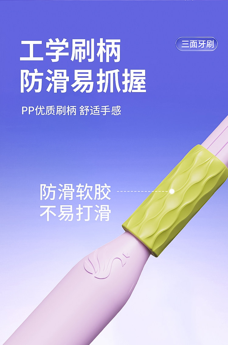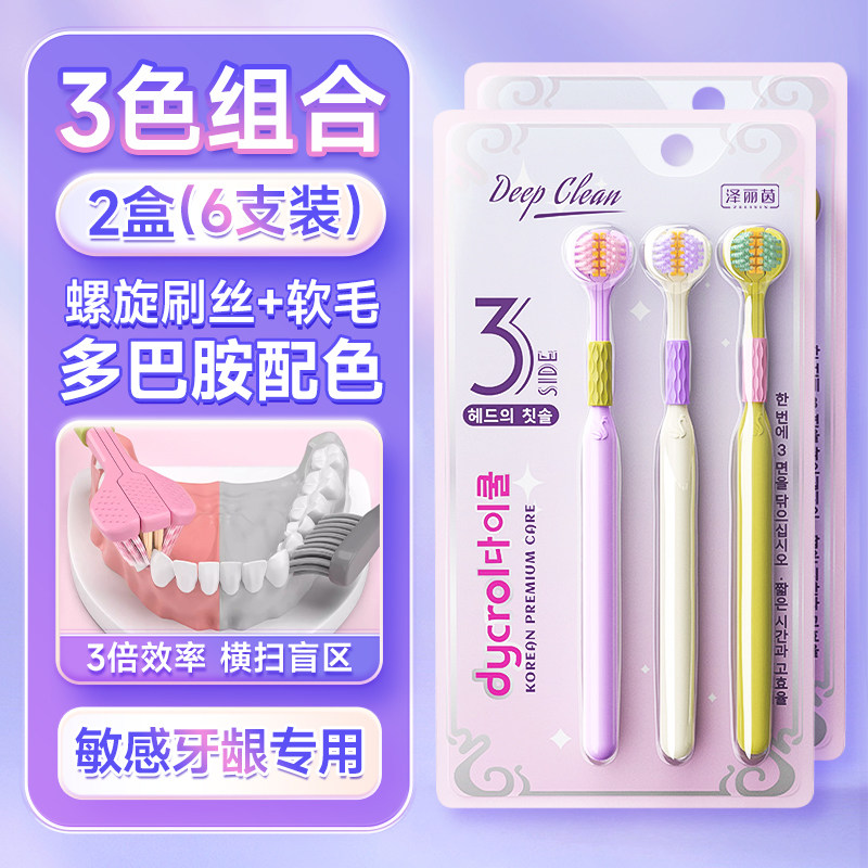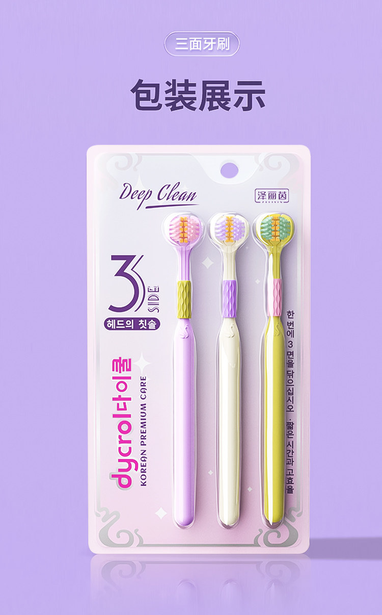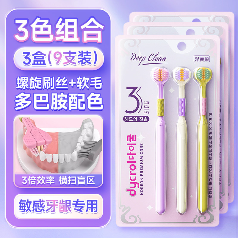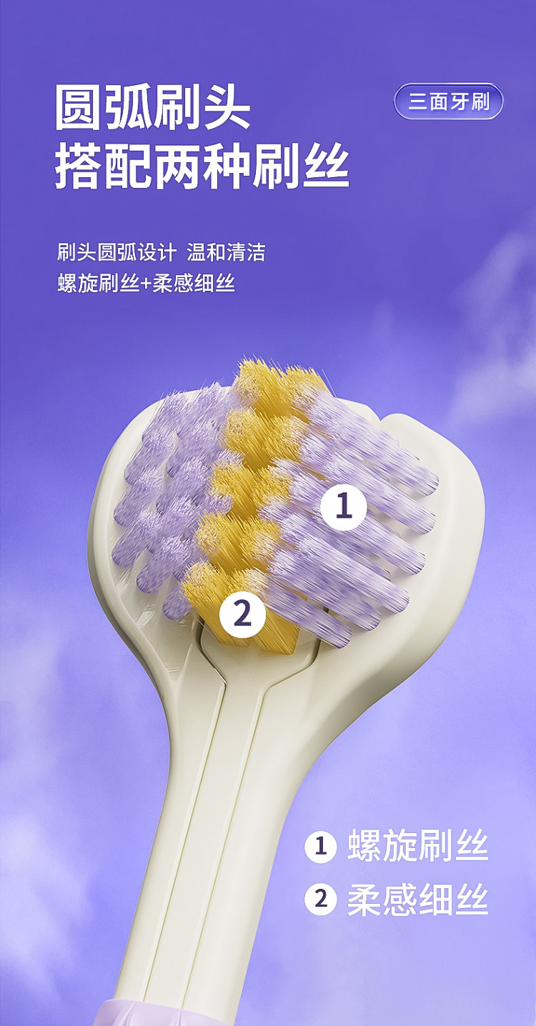 三面牙刷成人软毛男女专用可刮舌苔全面包裹清洁家庭装三色多巴胺