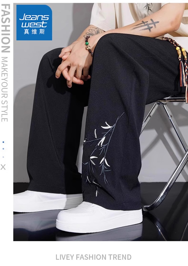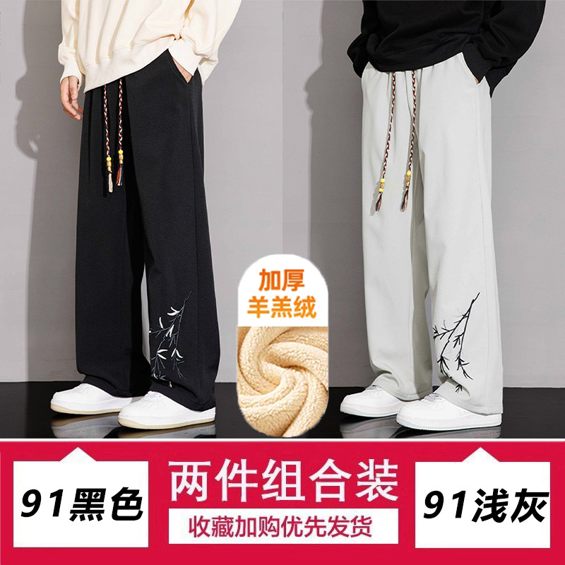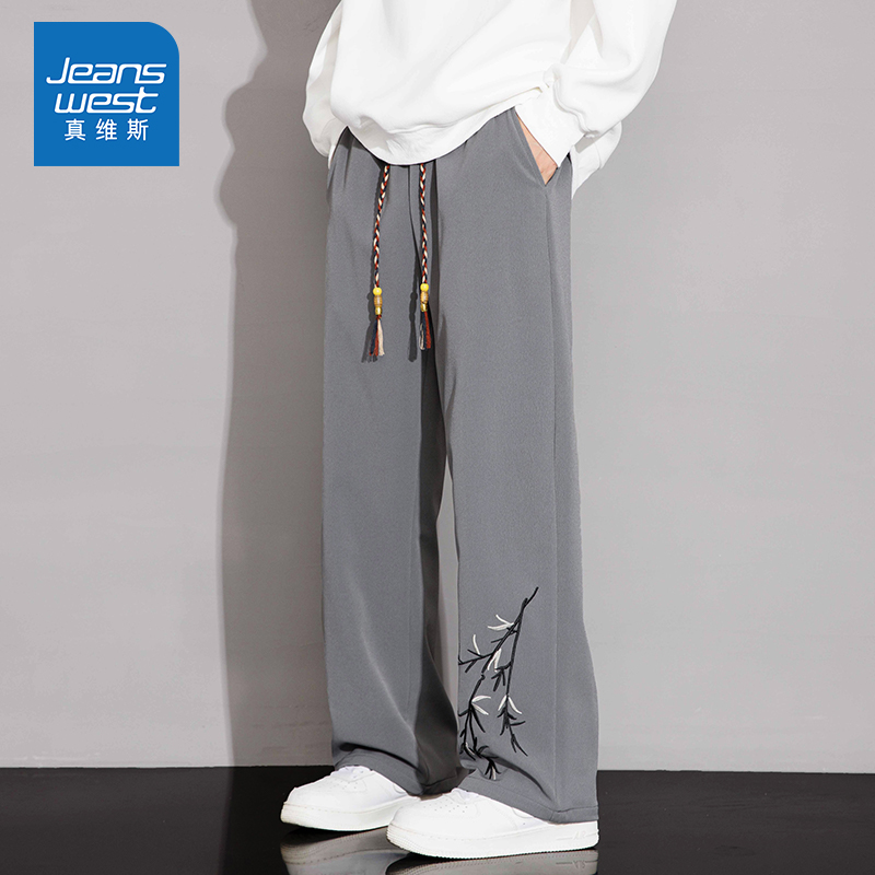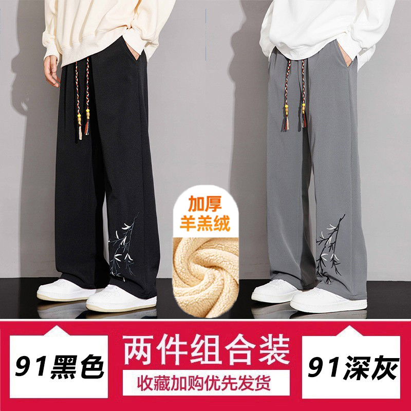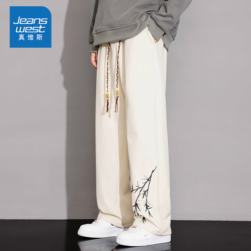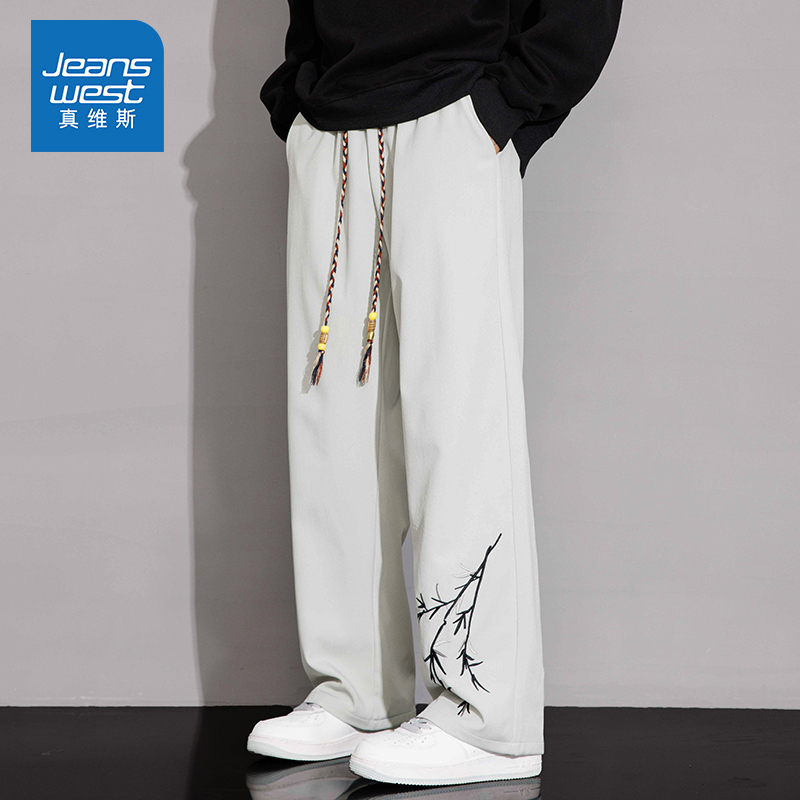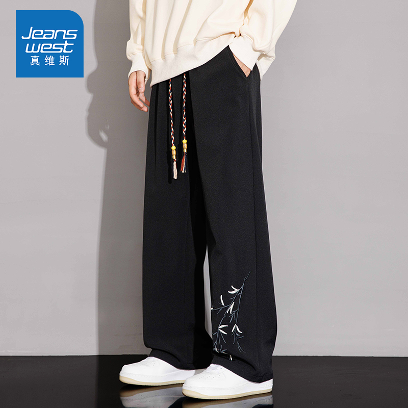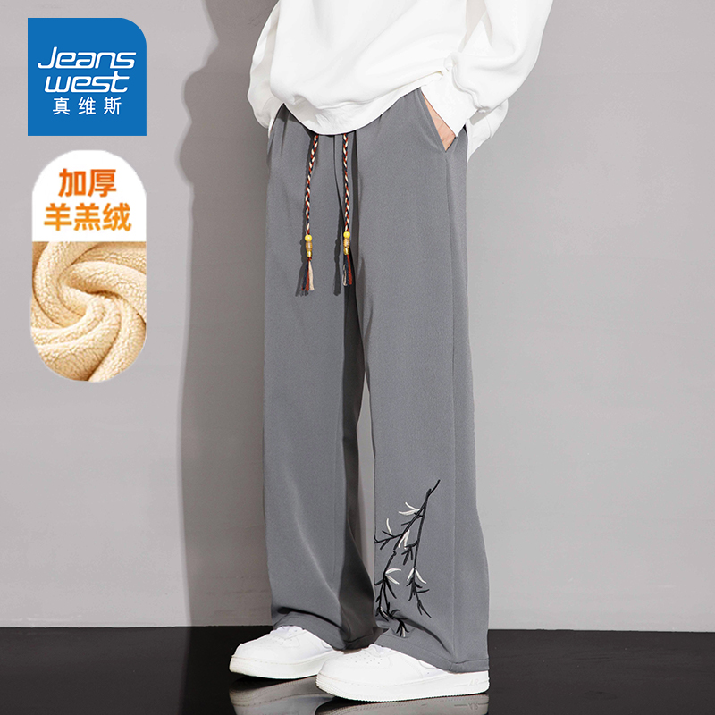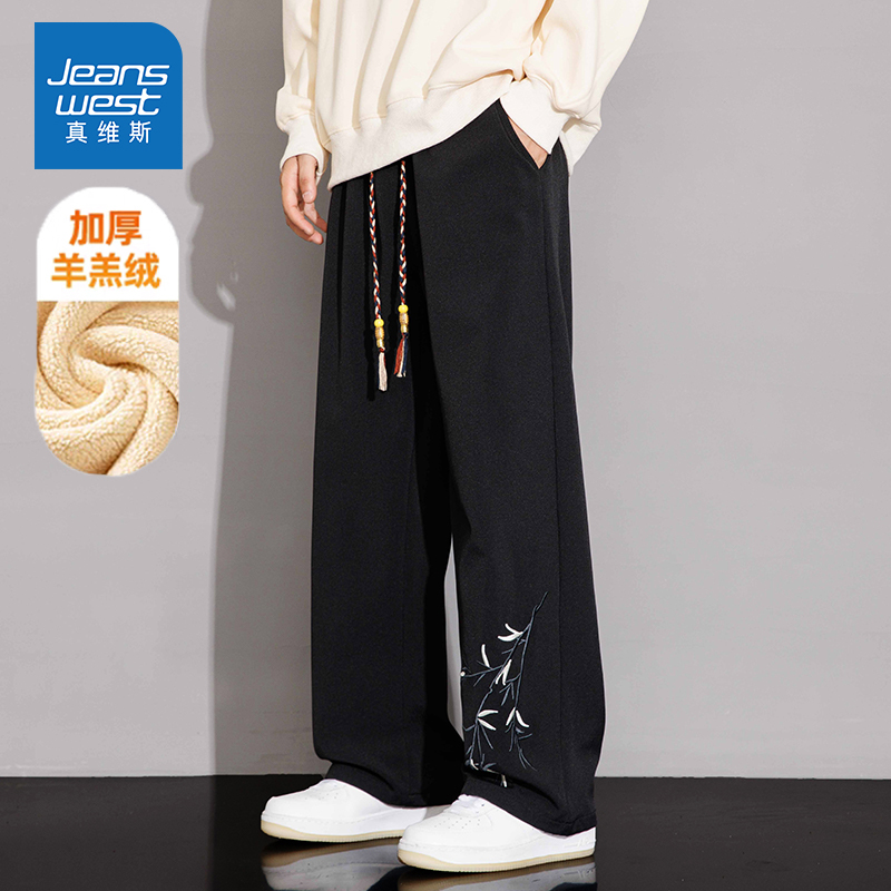真维斯秋冬新款新中式国风刺绣裤子男士青少年宽松垂感加绒直筒裤