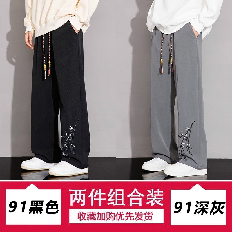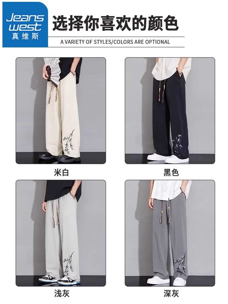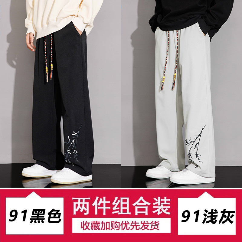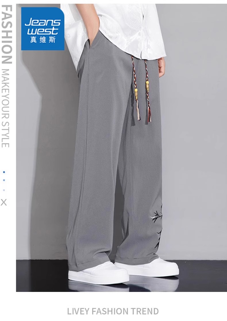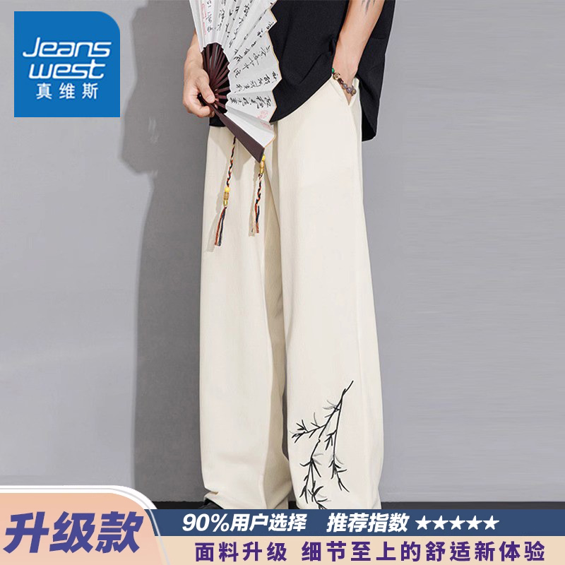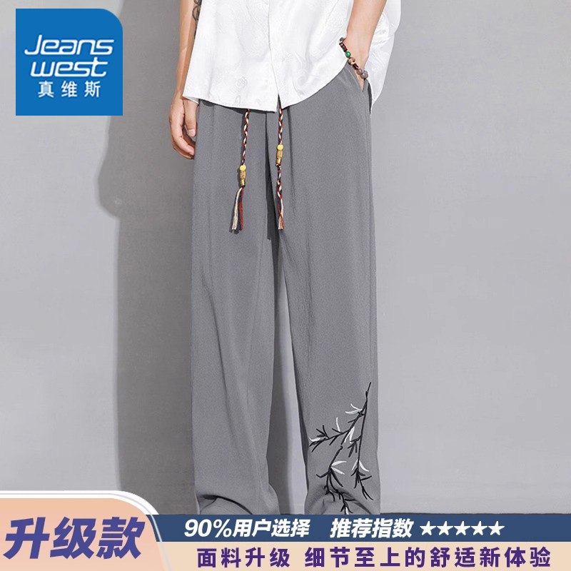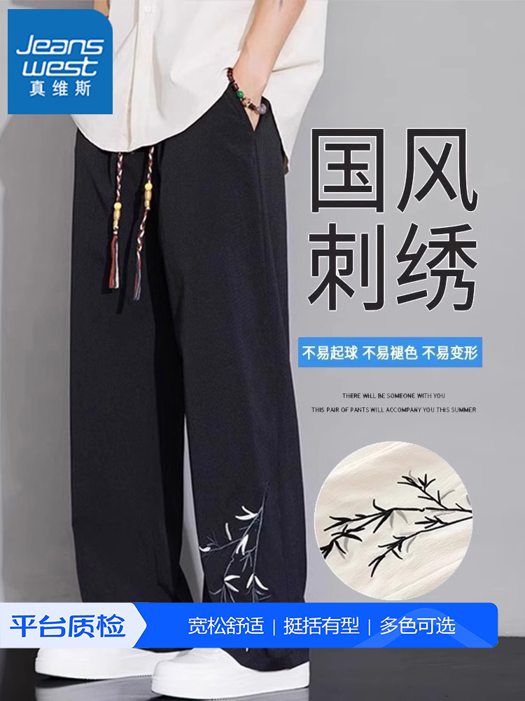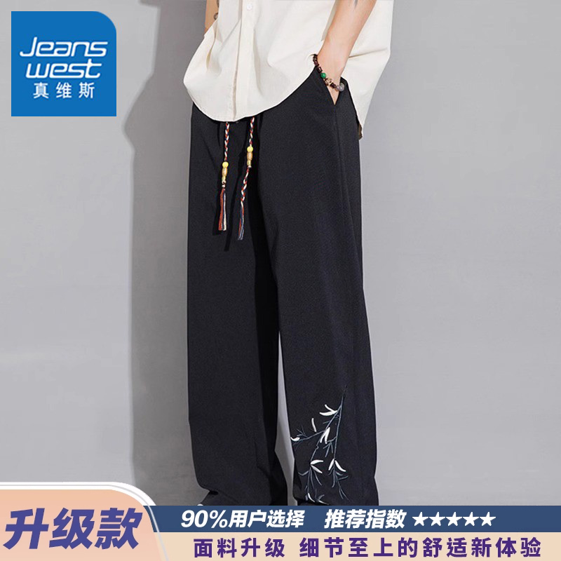 真维斯秋冬新款新中式国风刺绣裤子男士青少年宽松垂感加绒直筒裤