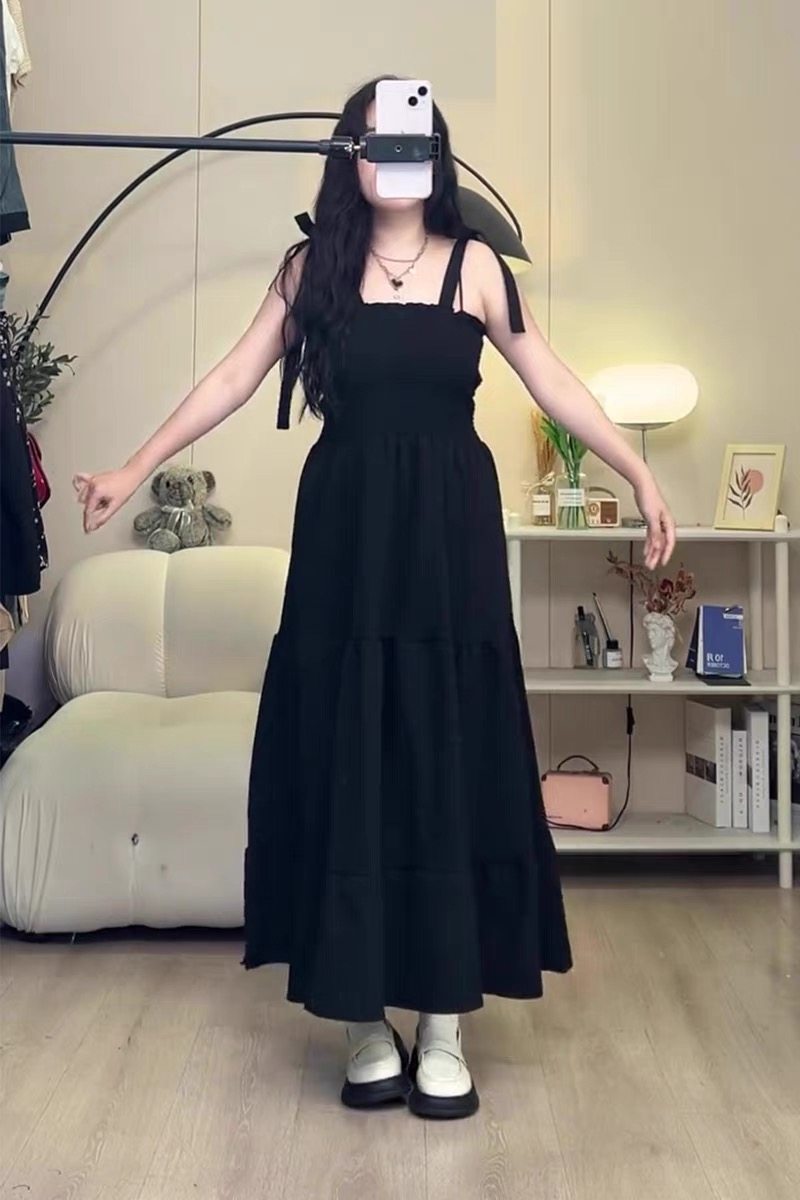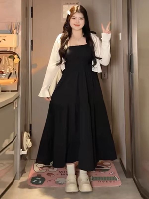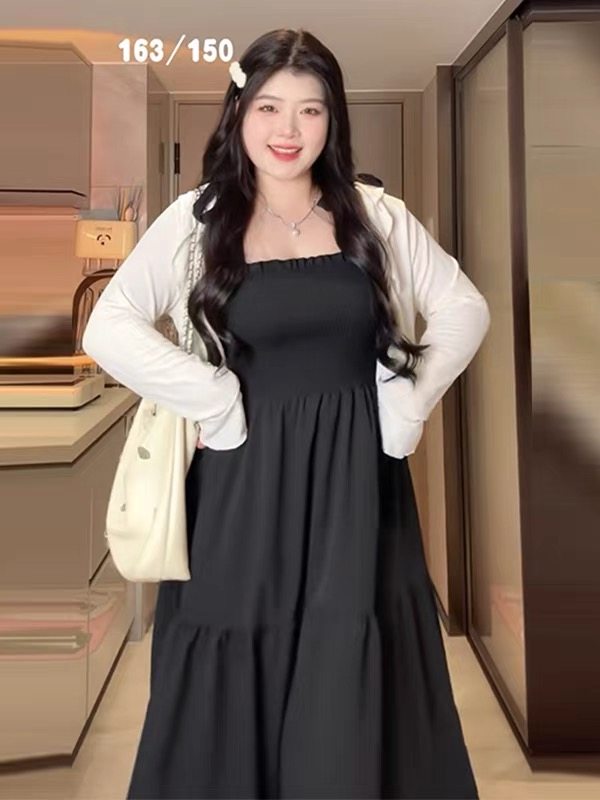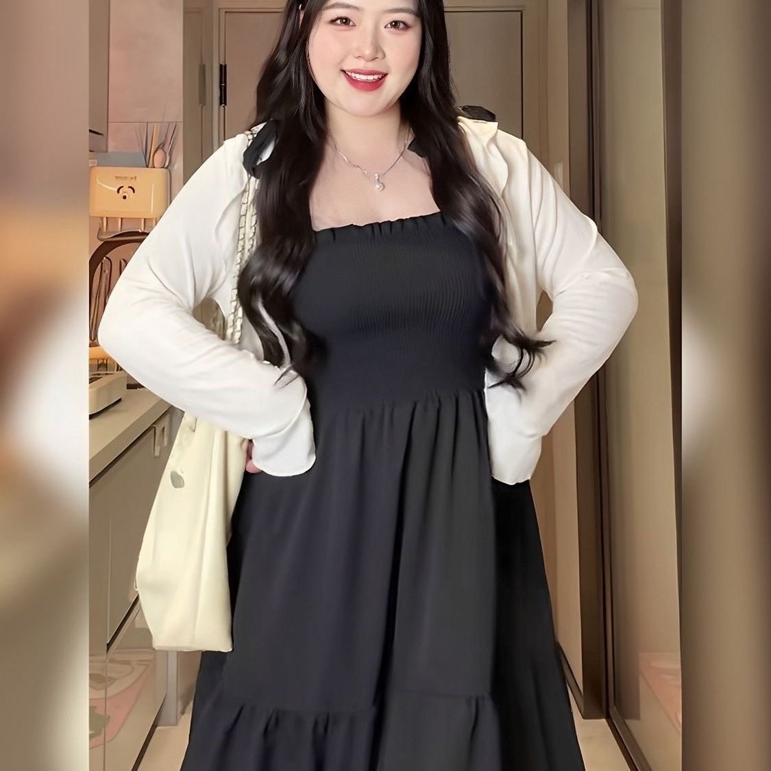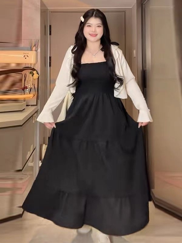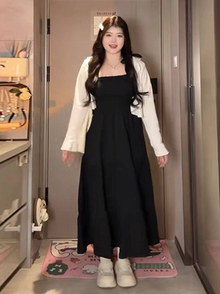 大码法式赫本风复古吊带连衣裙春夏季微胖mm显瘦高腰遮胯小黑裙子