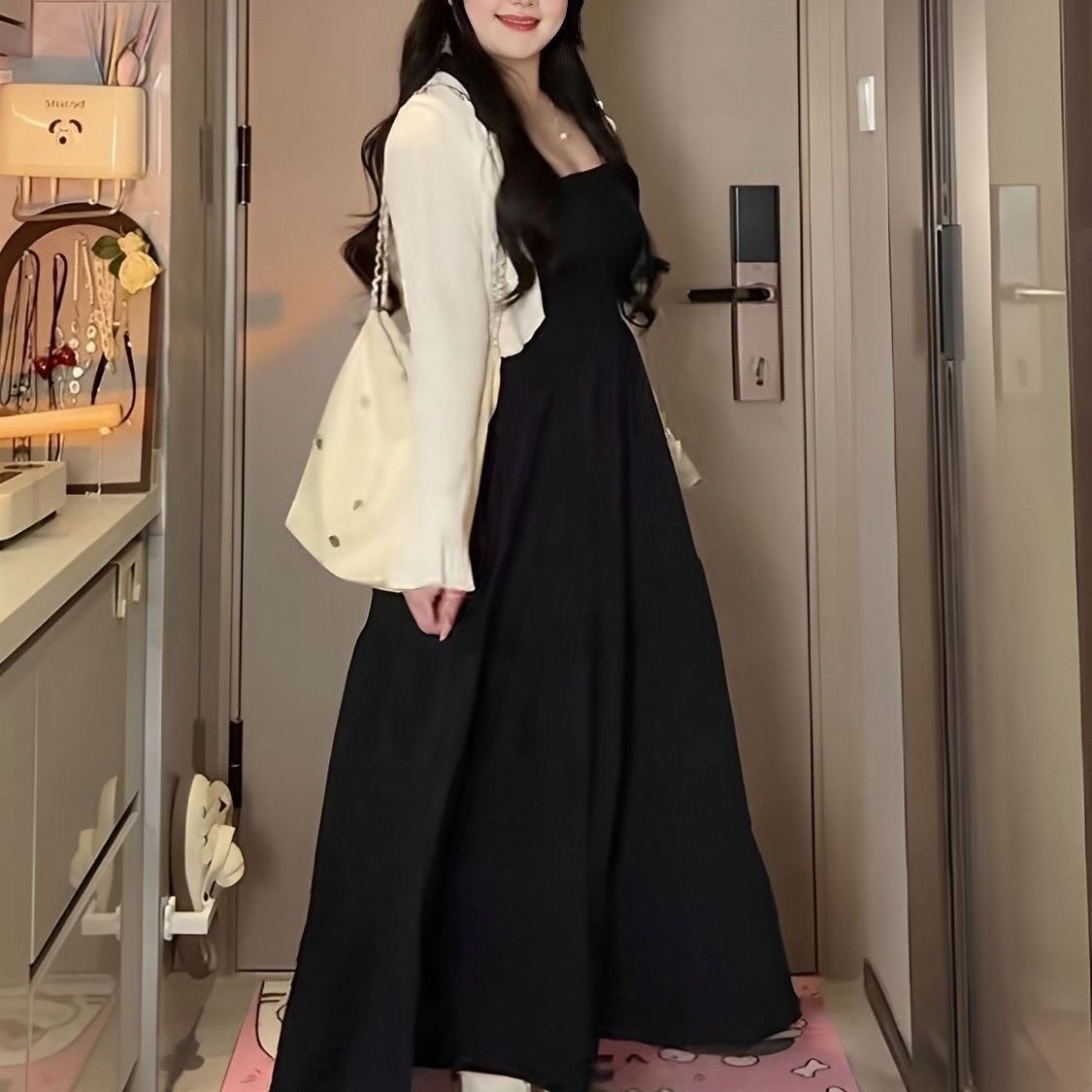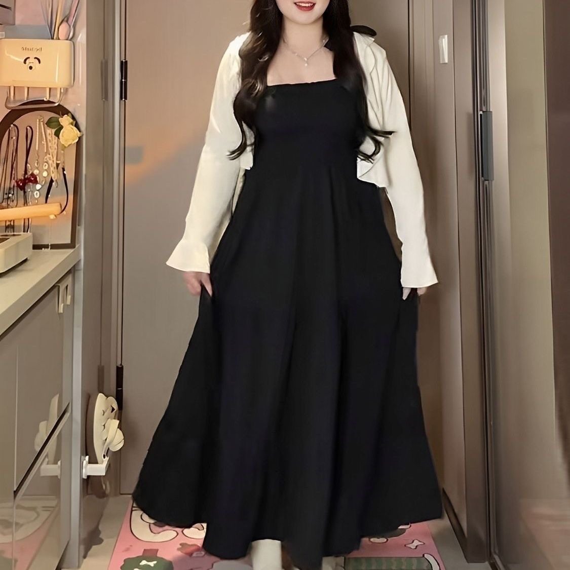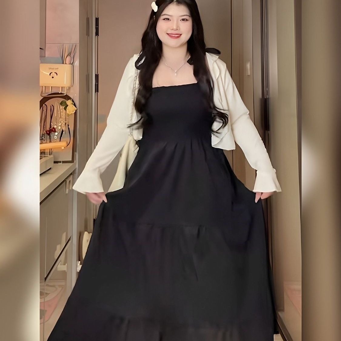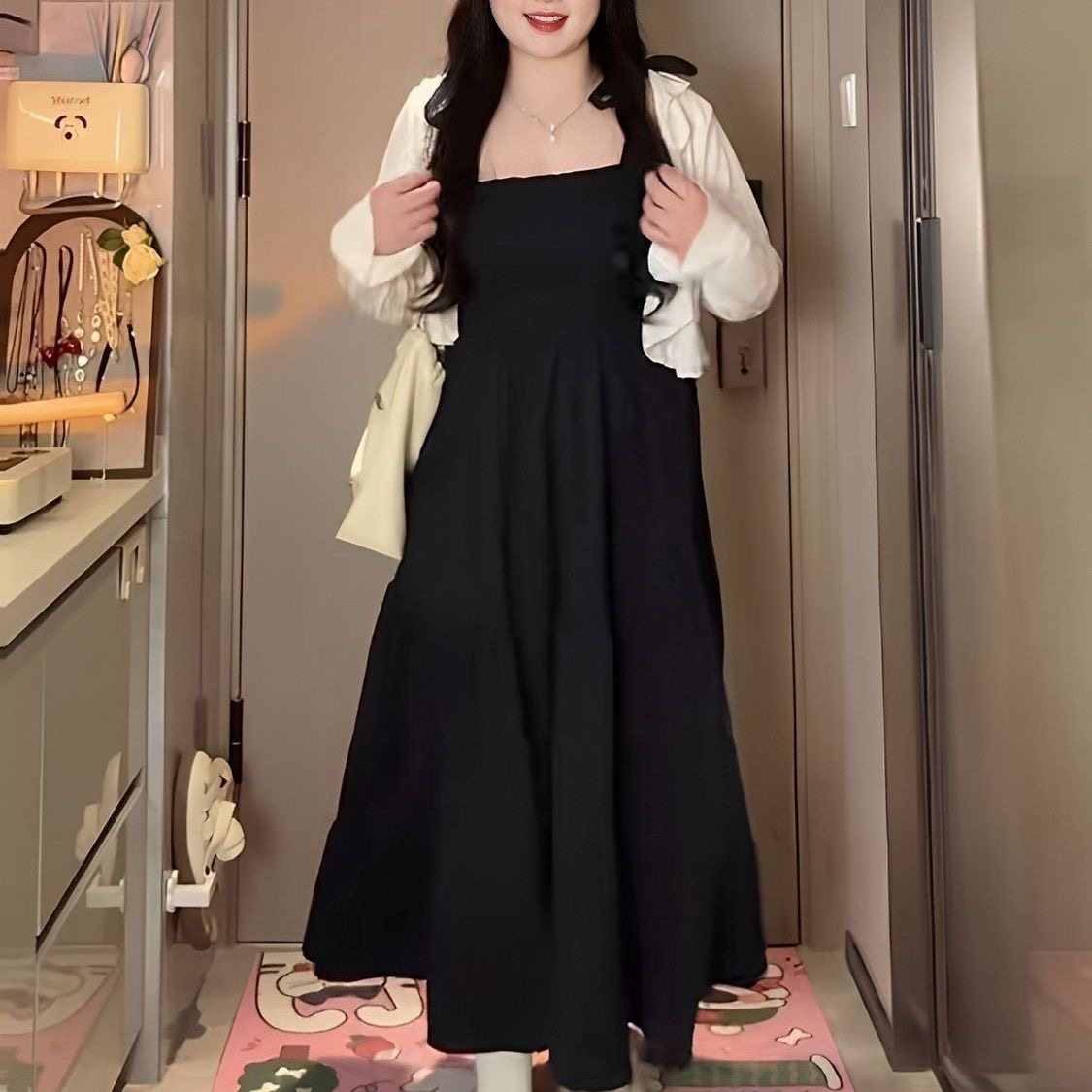 大码法式赫本风复古吊带连衣裙春夏季微胖mm显瘦高腰遮胯小黑裙子