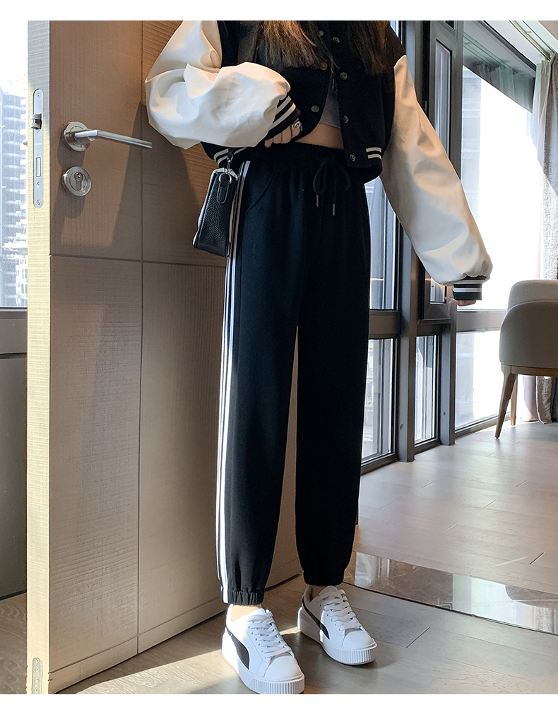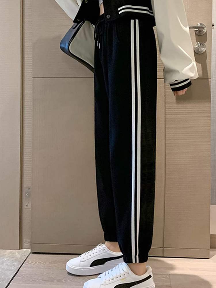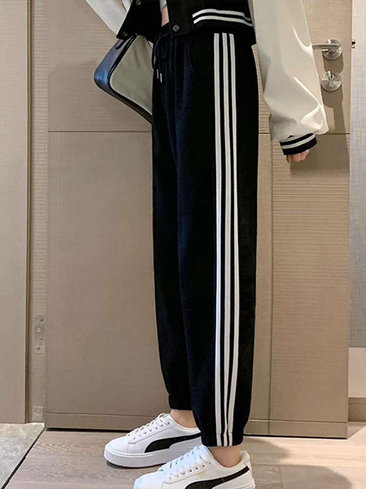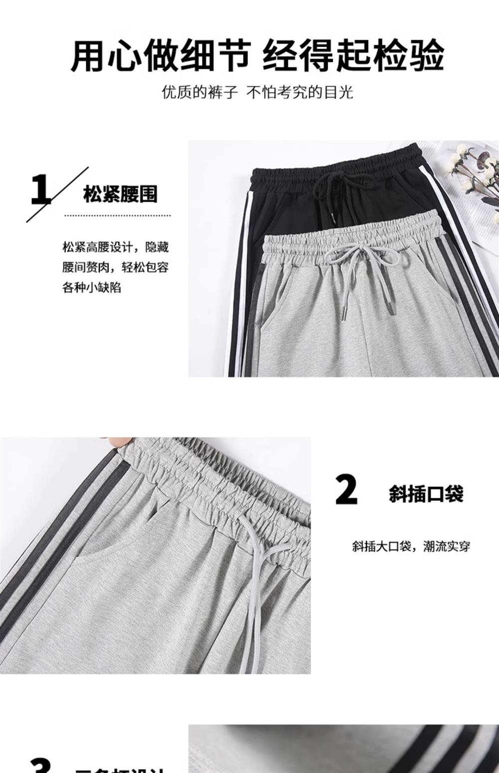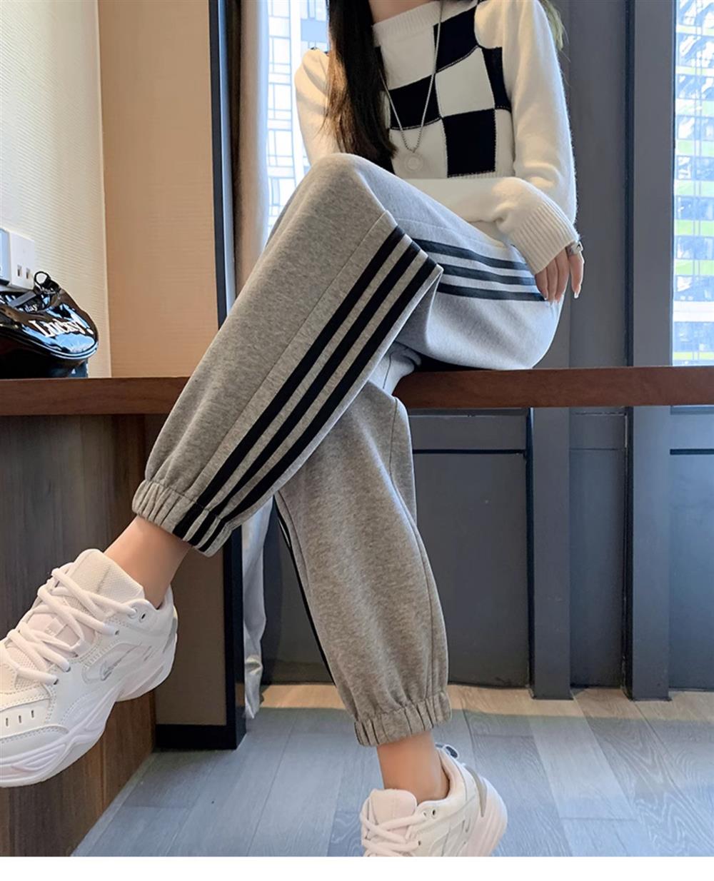 灰色美式运动裤男女士新款春秋季二三杠条纹休闲宽松阔腿束脚卫裤