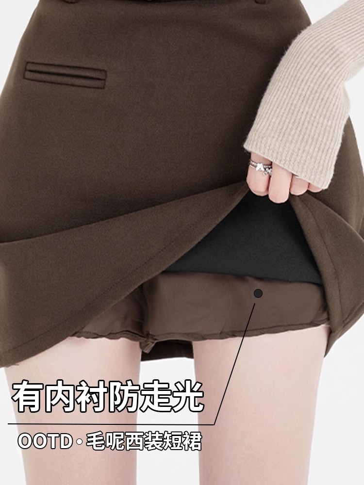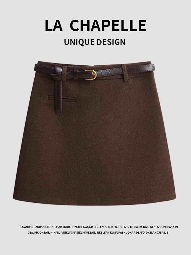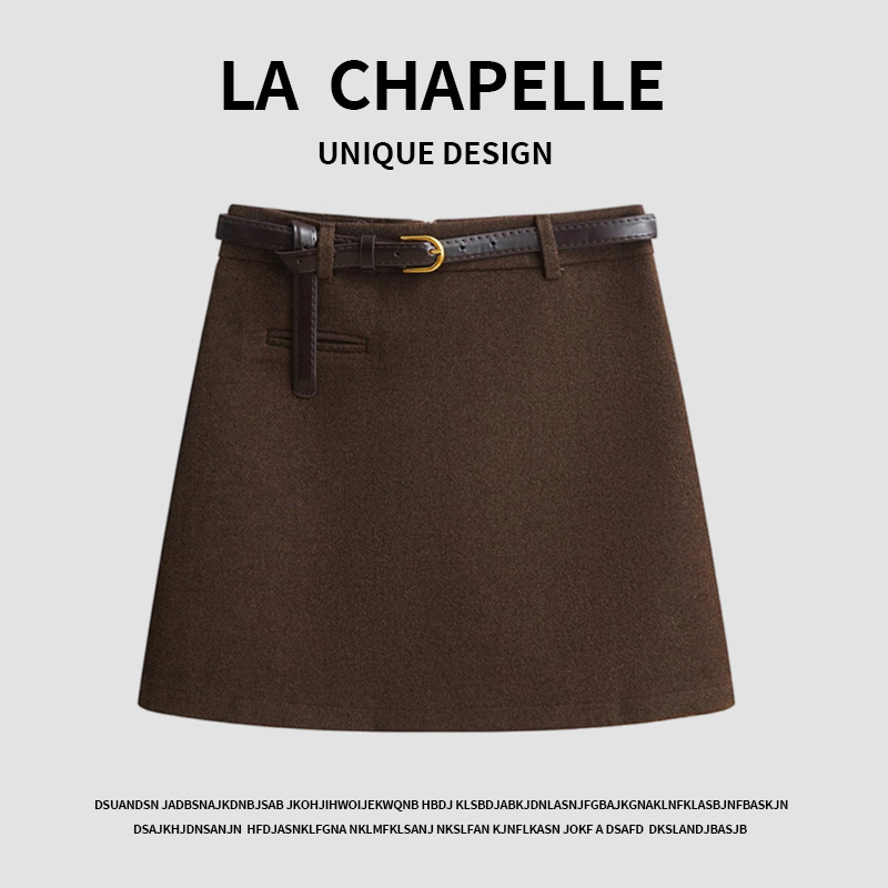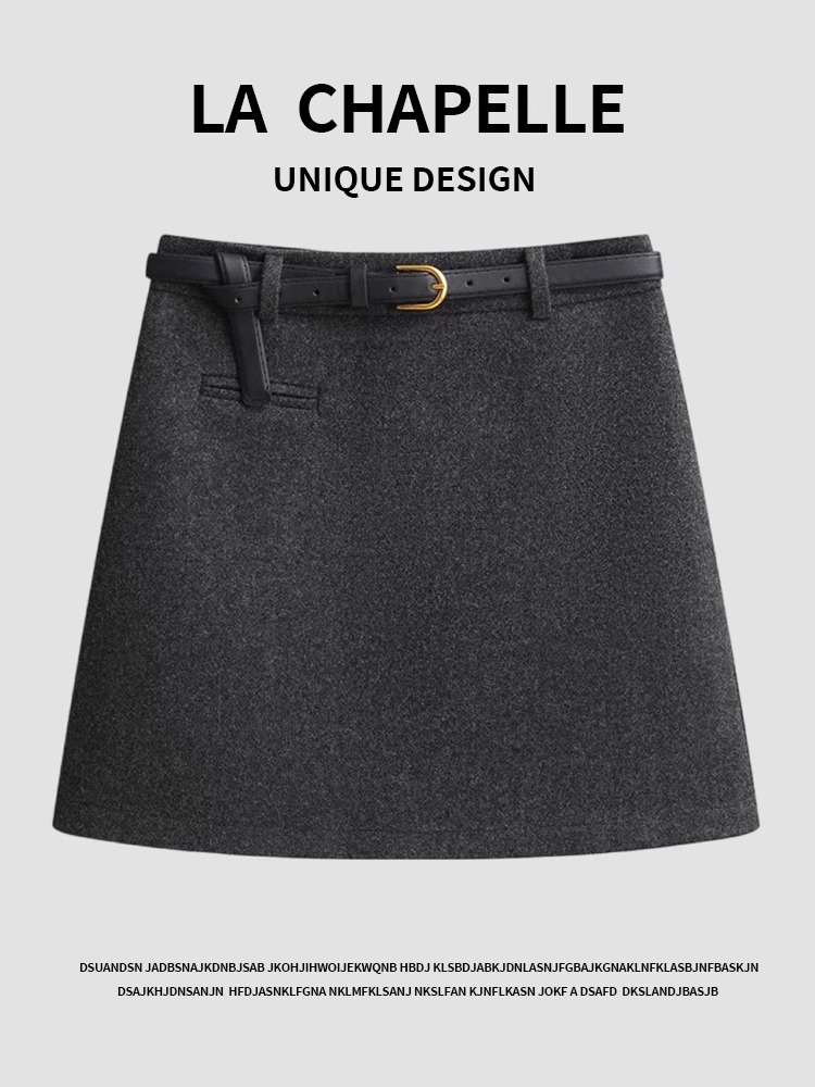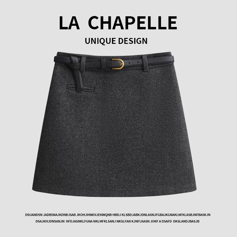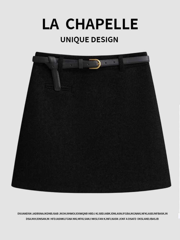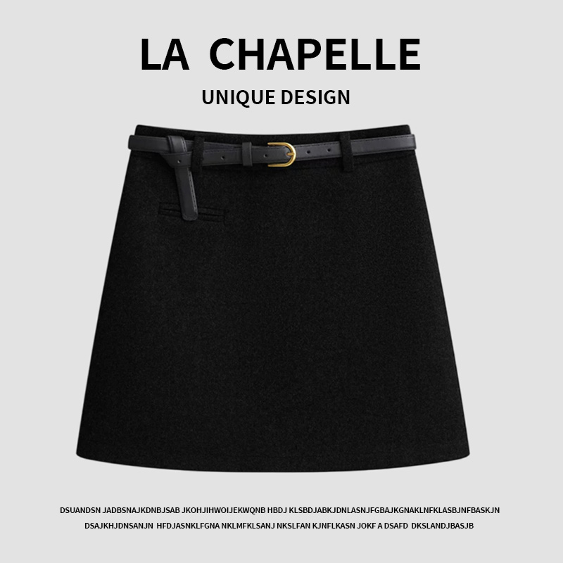 拉夏贝尔黑色毛呢半身裙女2025新款秋冬高腰a字小个子包臀短裙子
