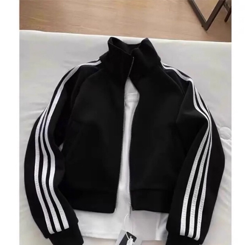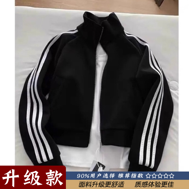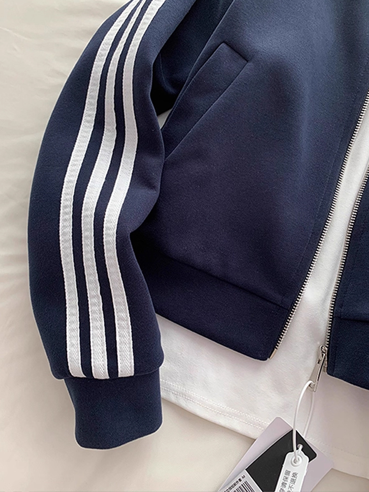 藏青色三杠条纹卫衣外套男女短款秋季立领情侣校服棒球服运动夹克