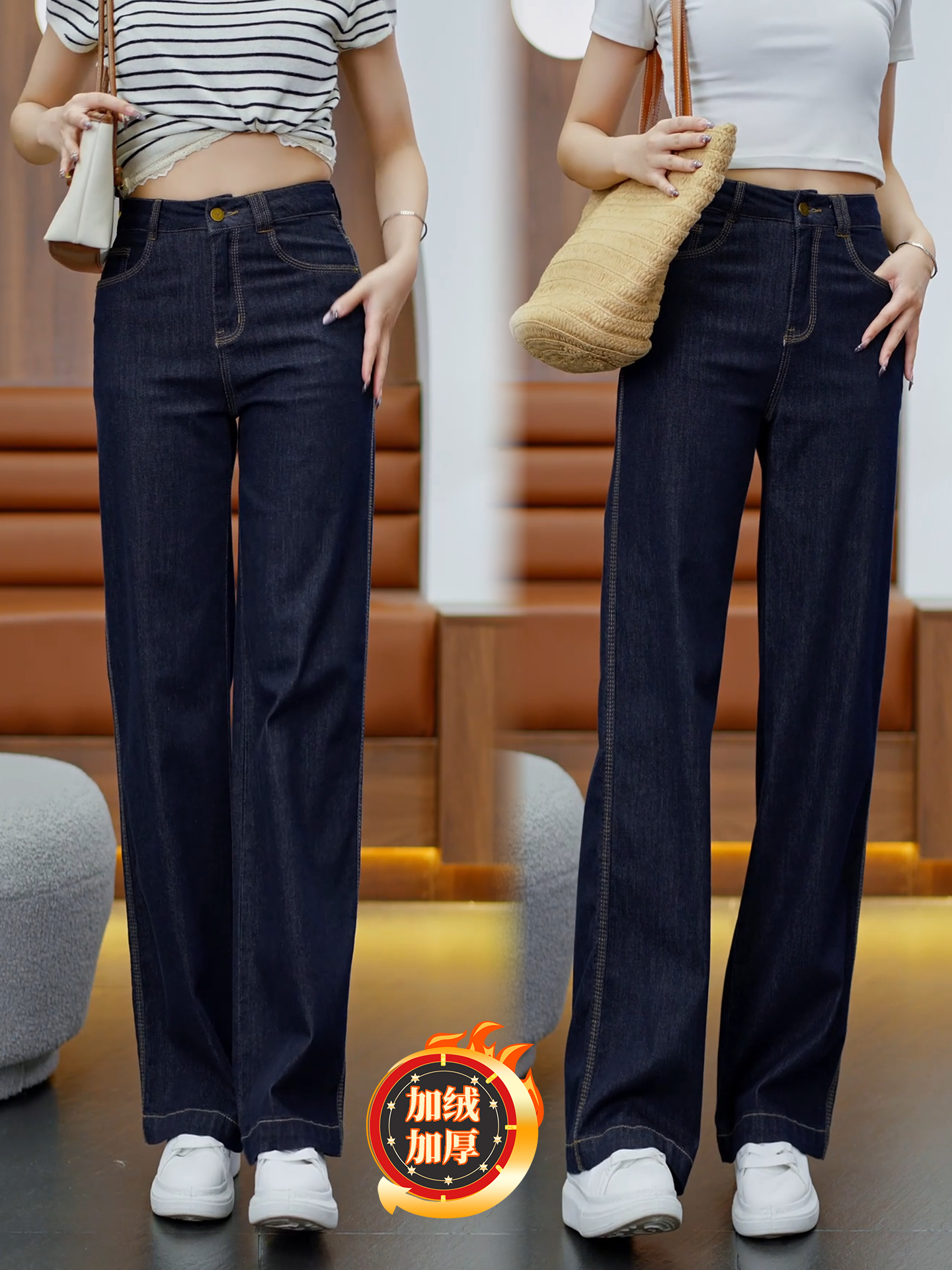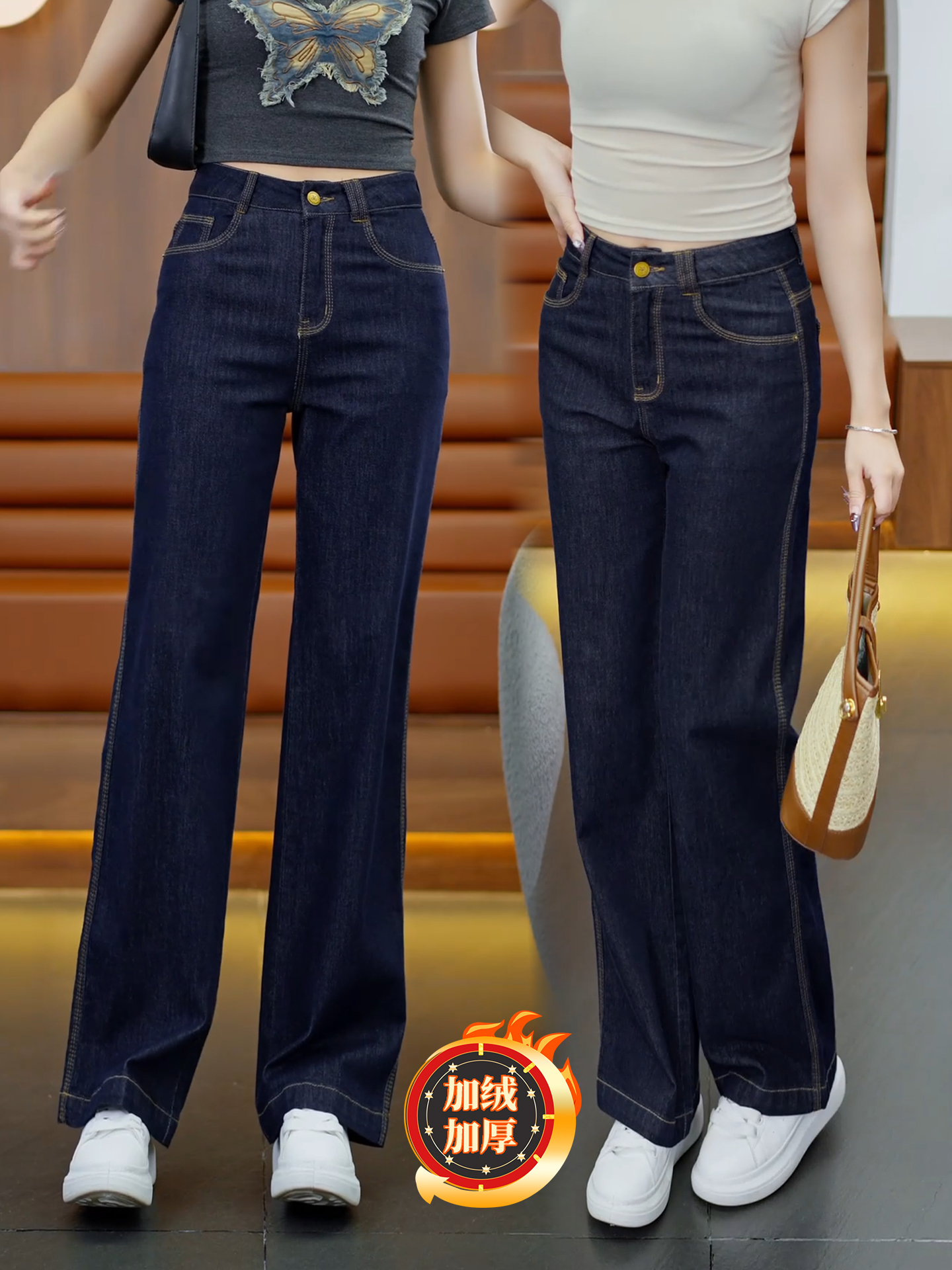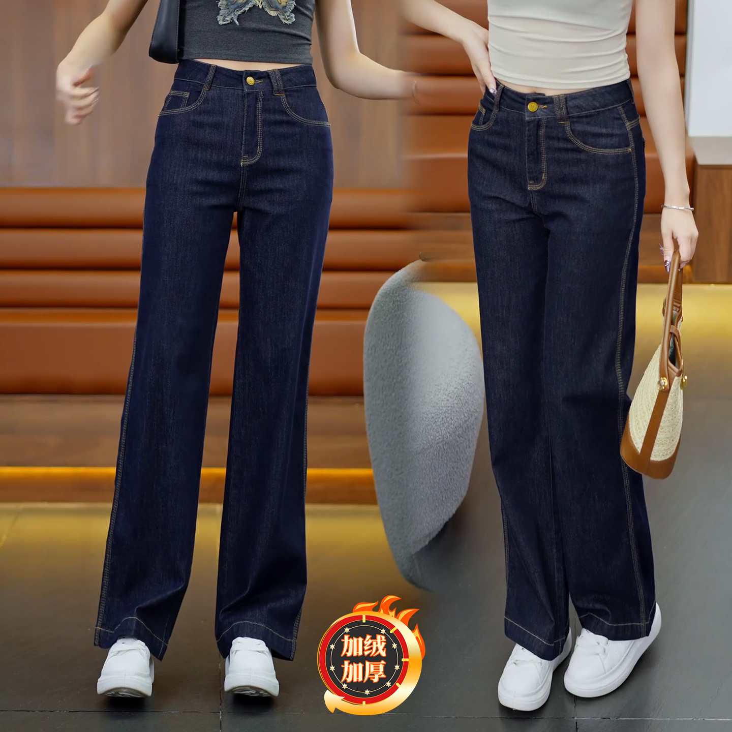 丹宁蓝窄版阔腿牛仔裤女2025年秋冬季保暖高腰宽松加绒加厚直筒裤