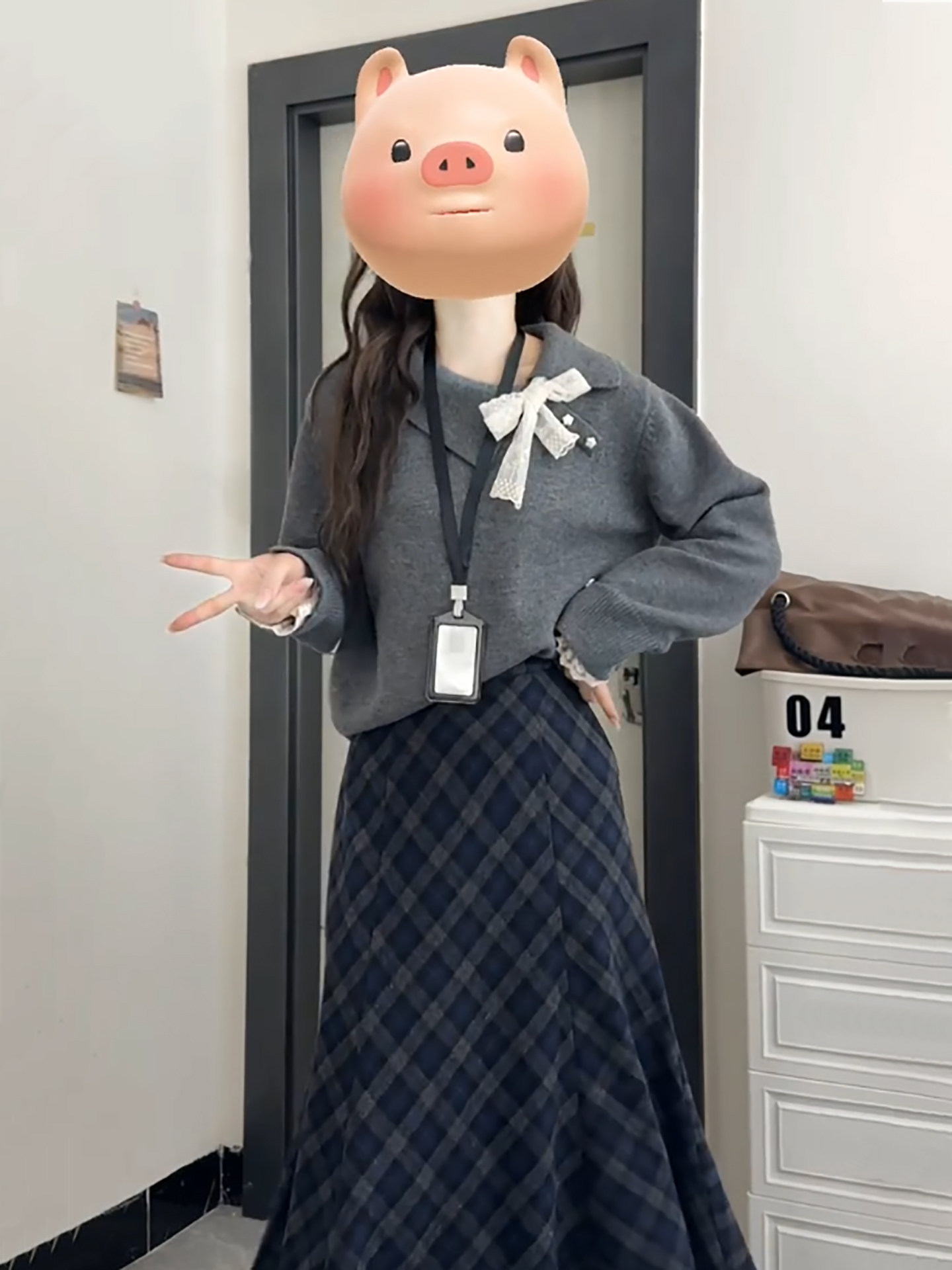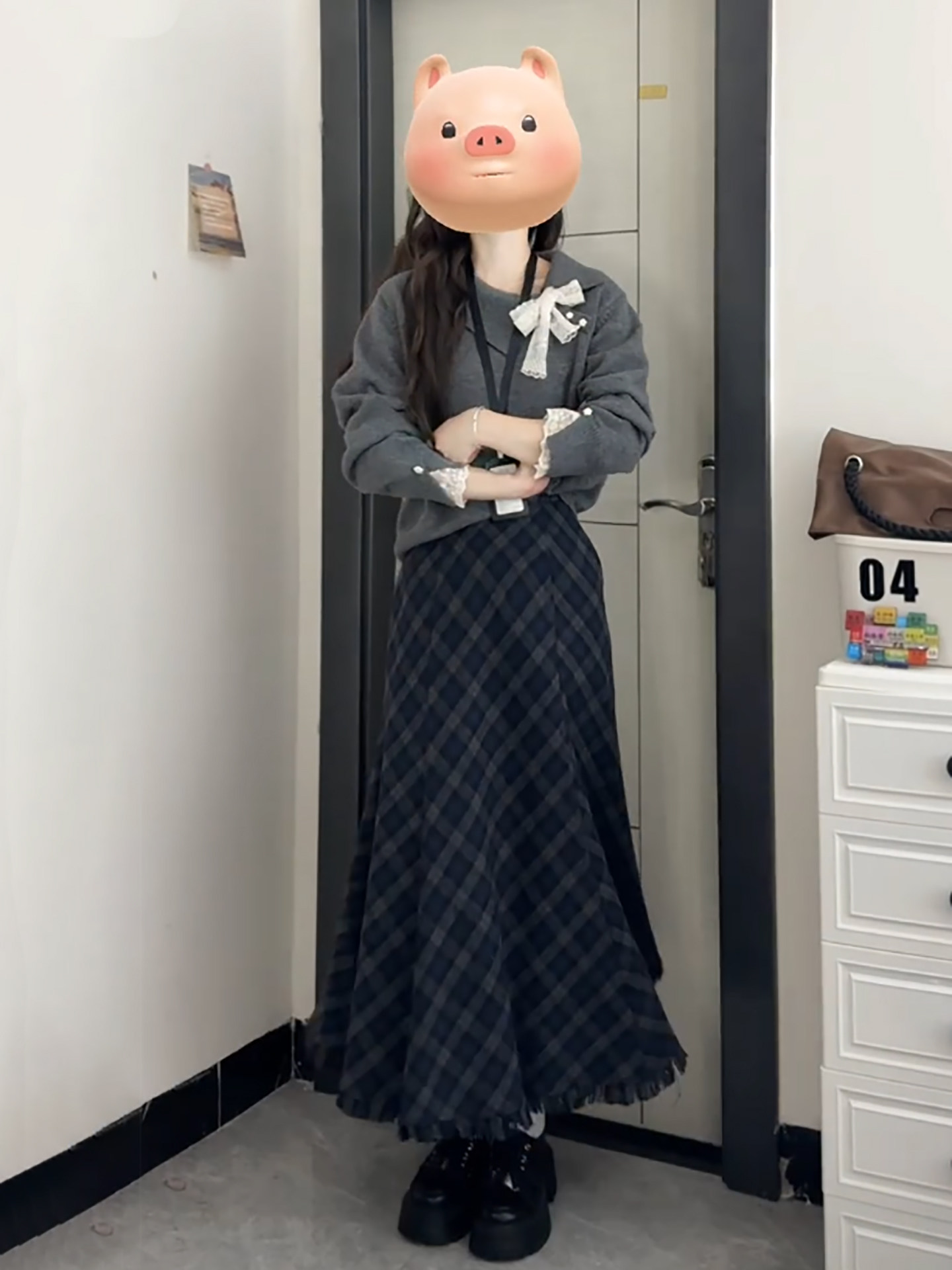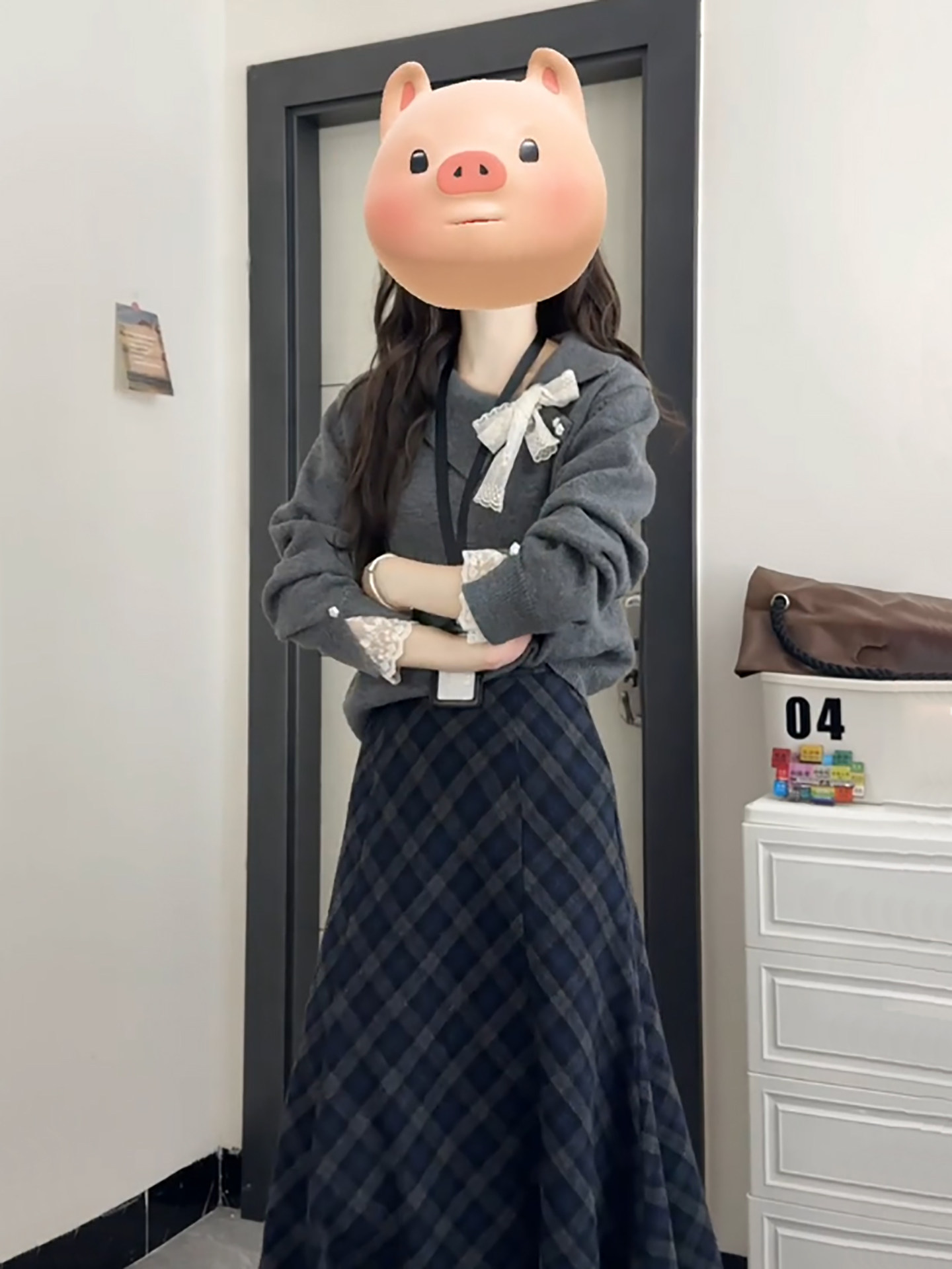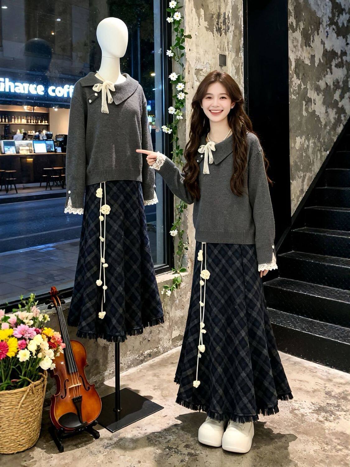 巨好看的两件套冬装女韩系气质蕾丝拼接翻领针织毛衣格纹半身长裙