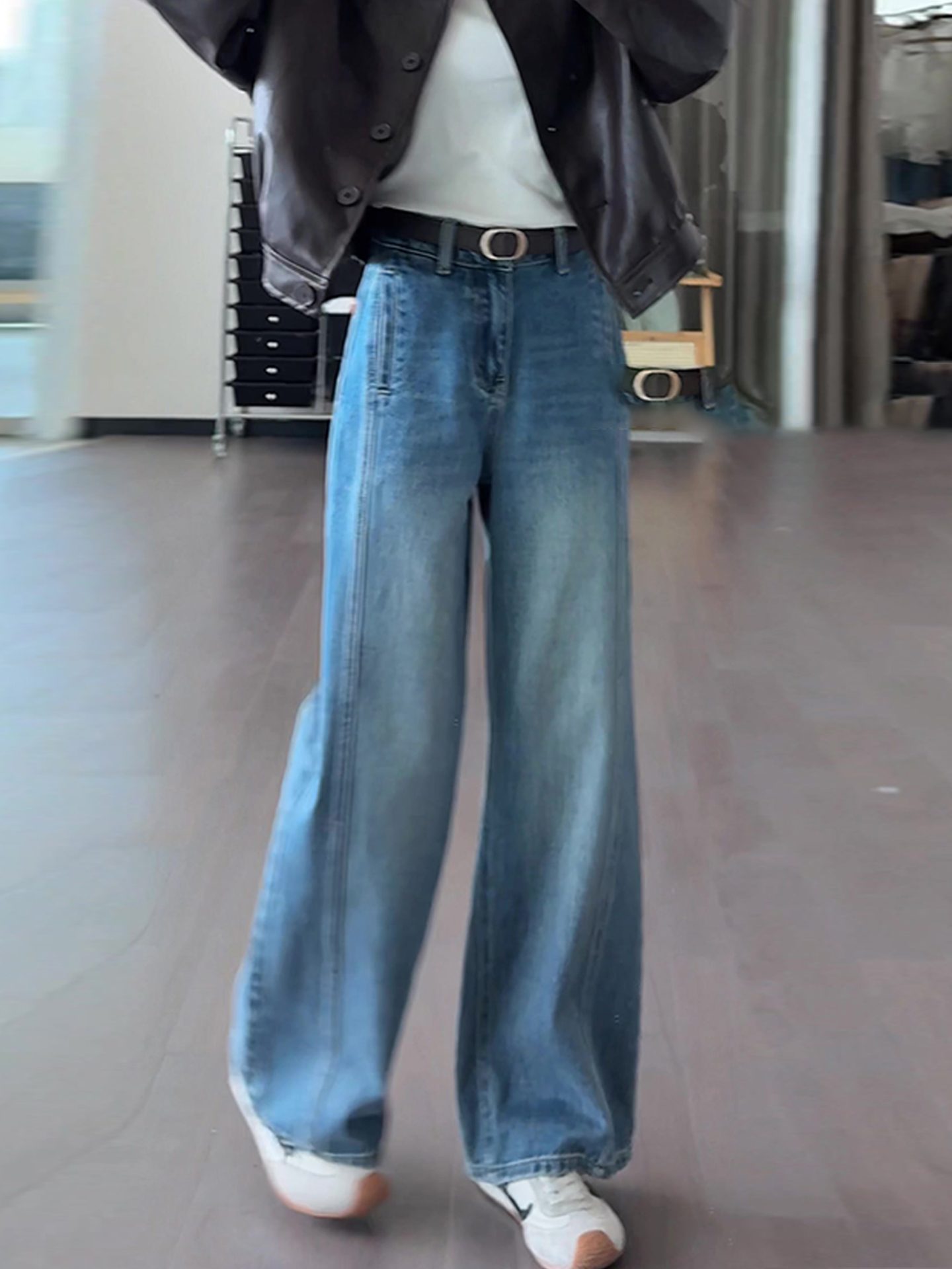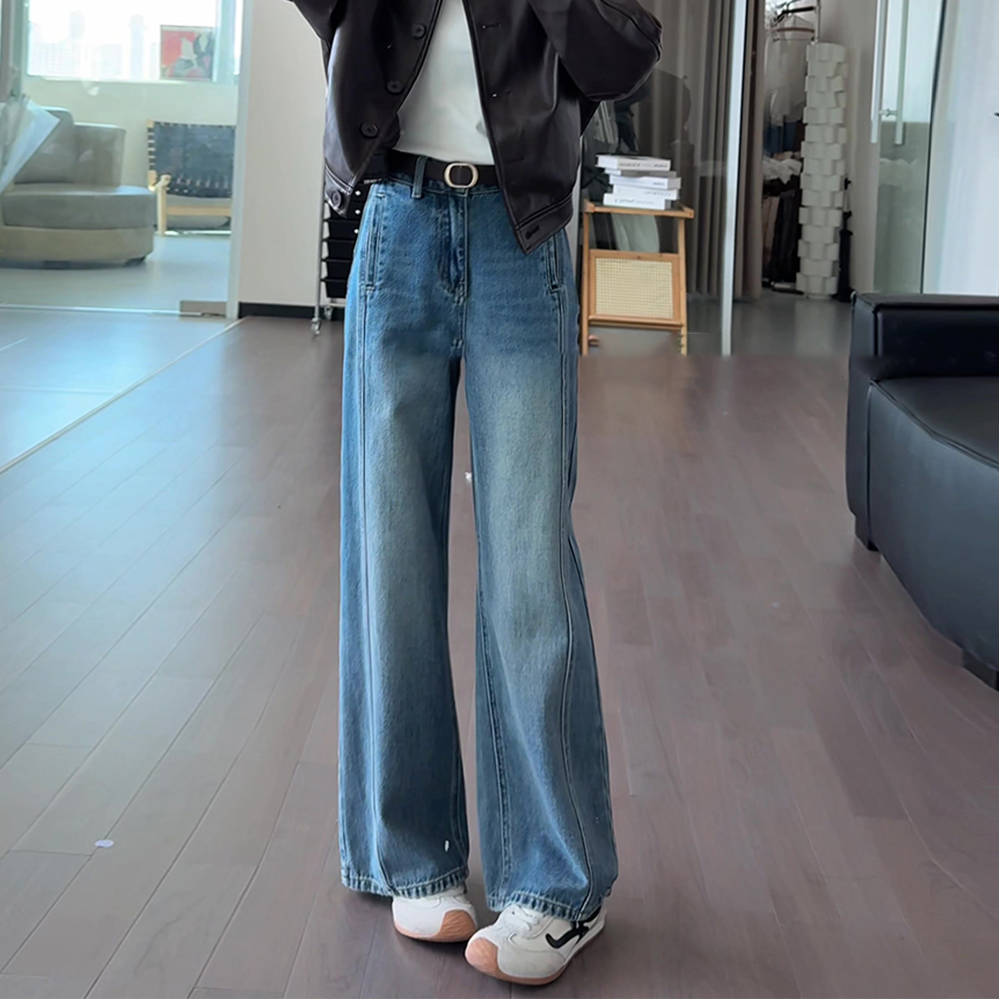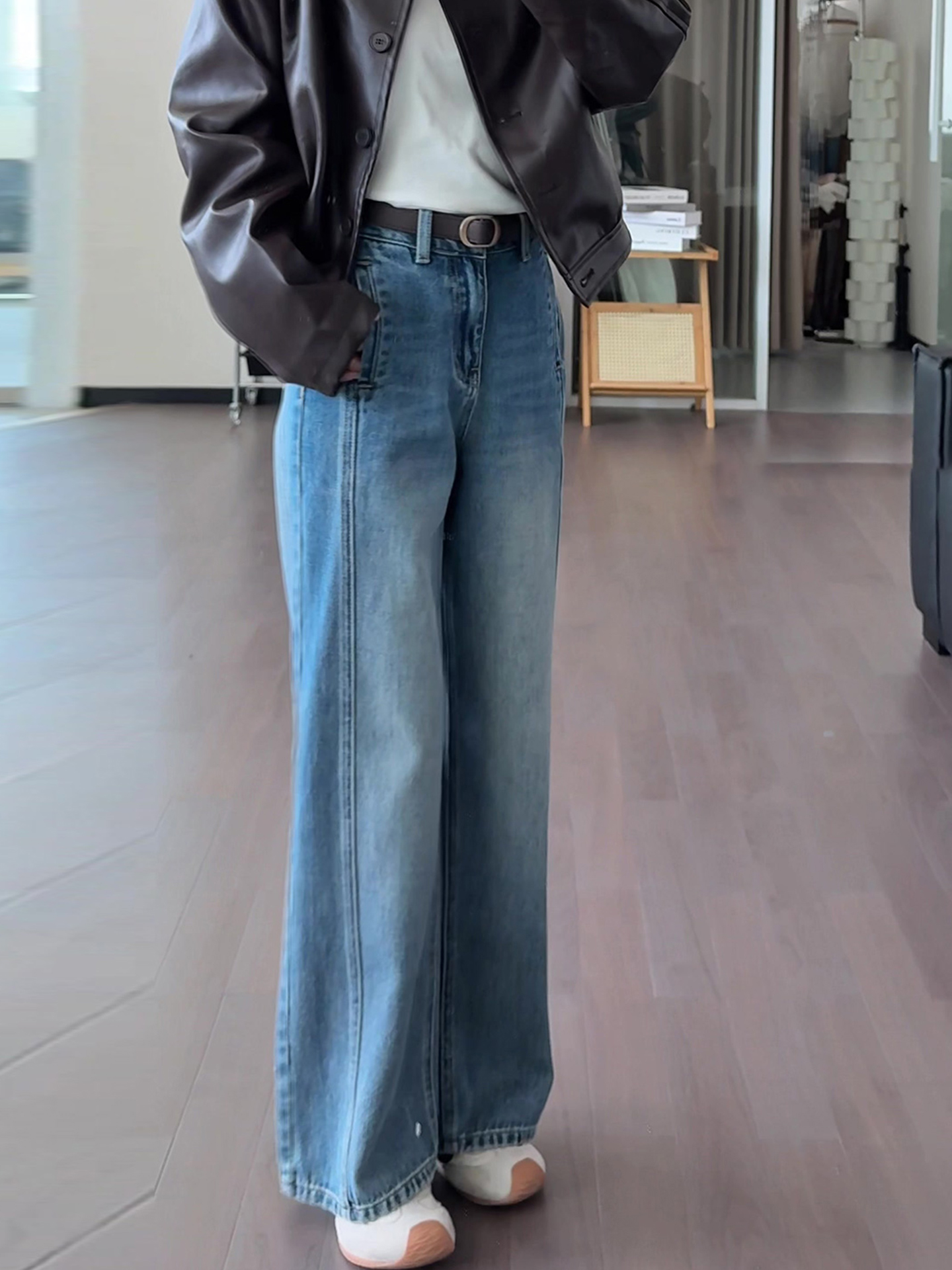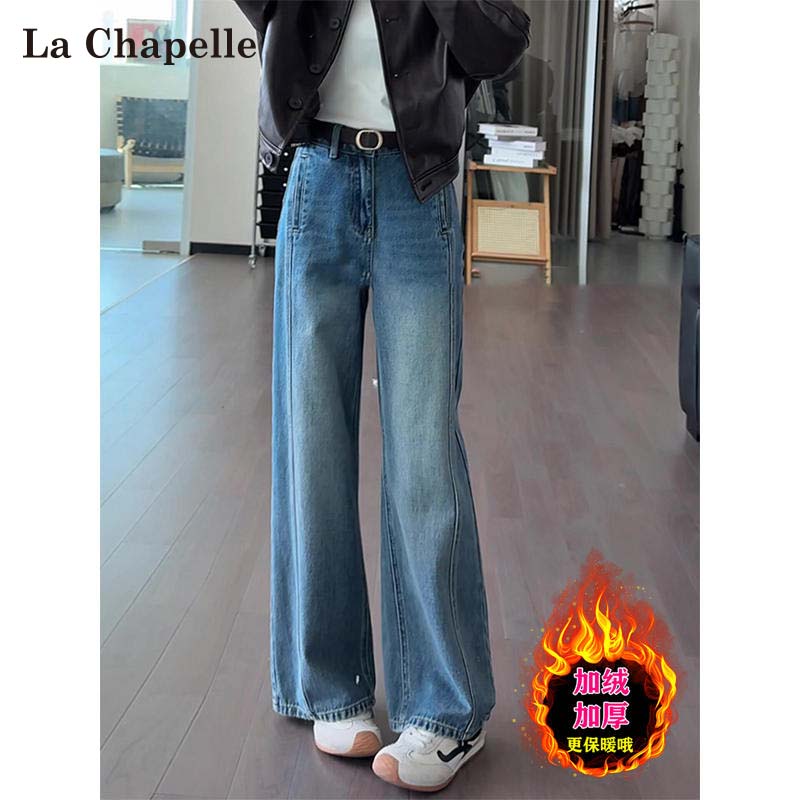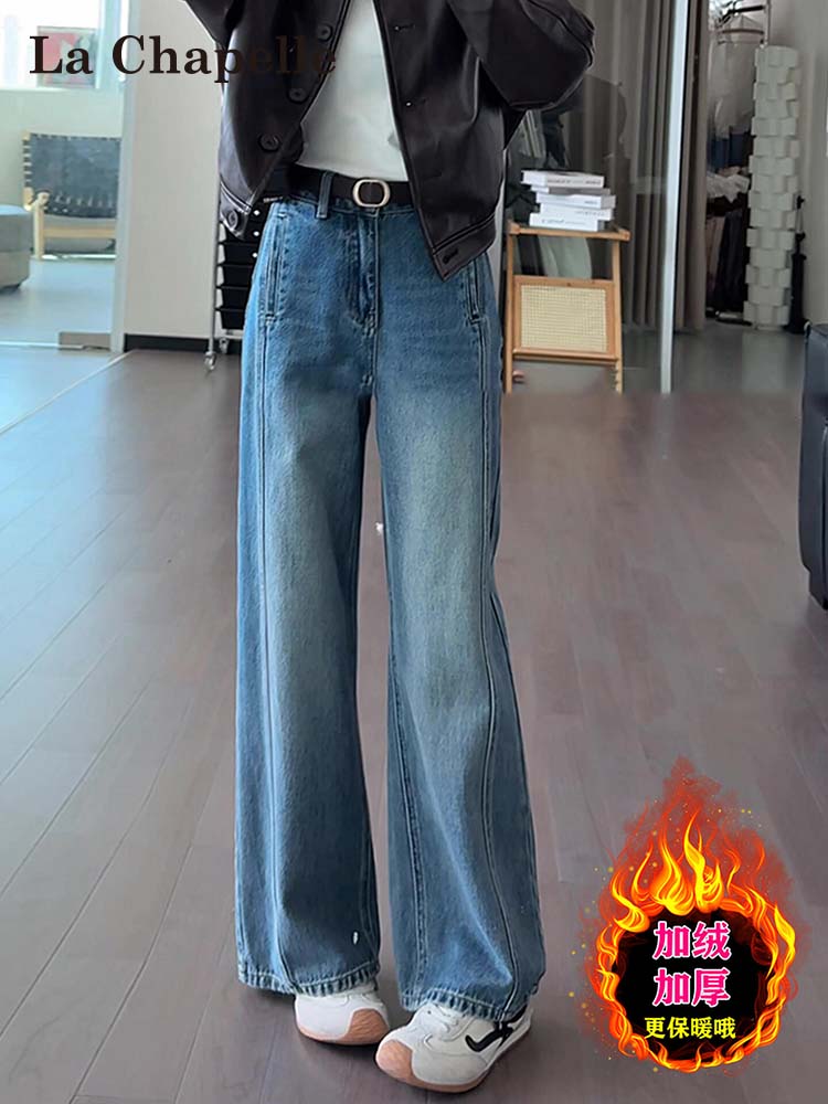拉夏贝尔加绒阔腿牛仔裤女秋冬2025新款梨形小个子窄版加厚直筒裤