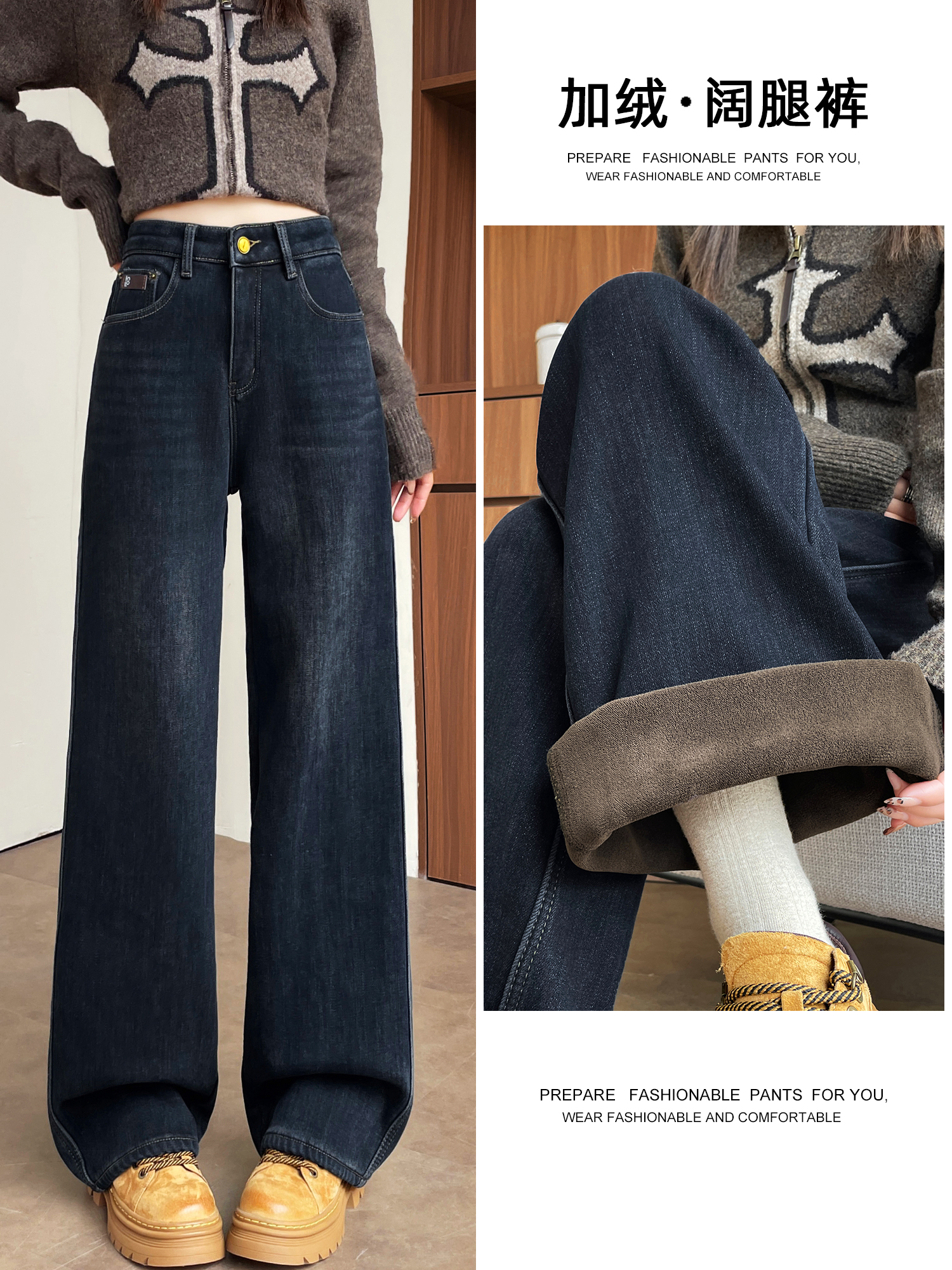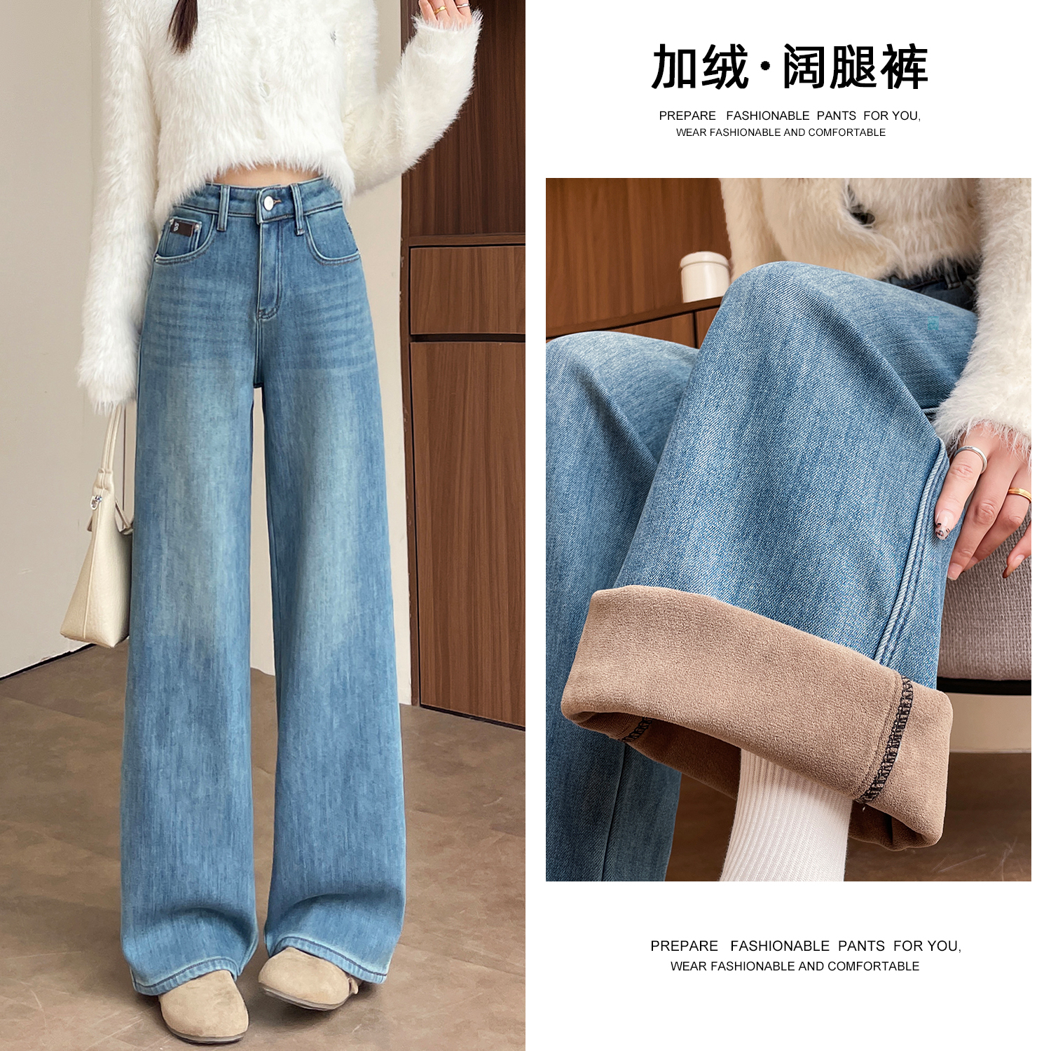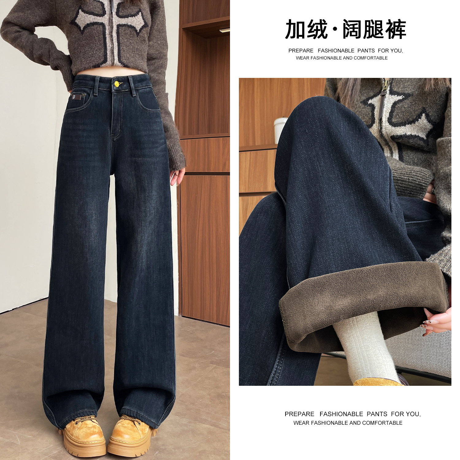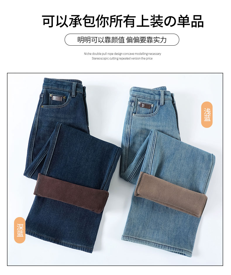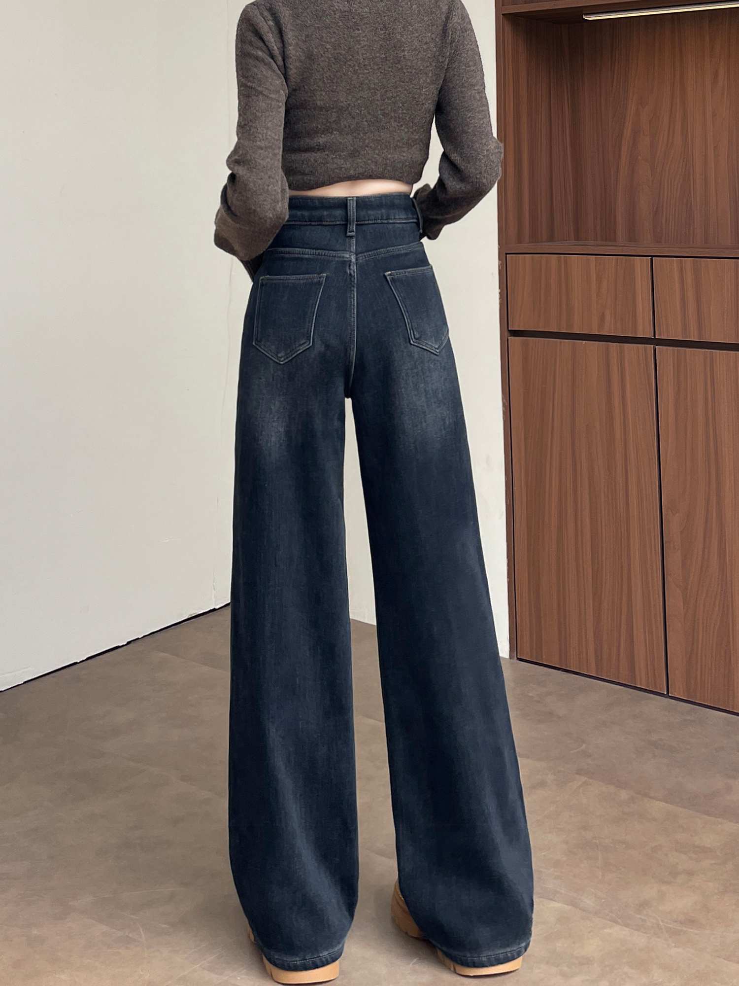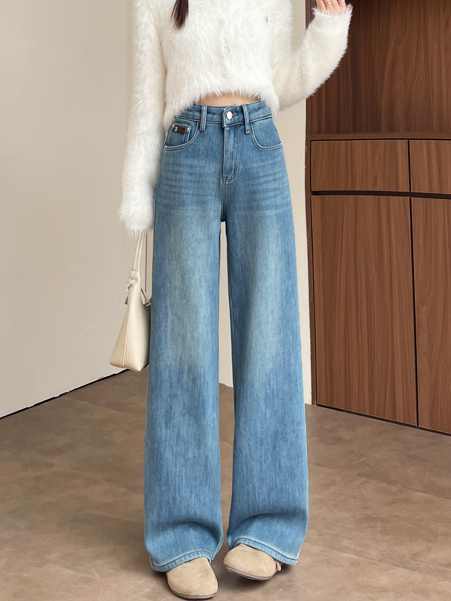 复古加绒加厚阔腿牛仔裤女小个子2025新款冬季高腰显瘦垂感直筒裤
