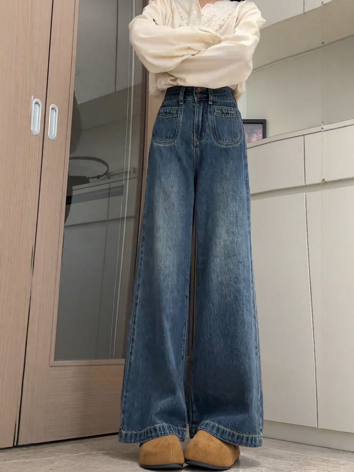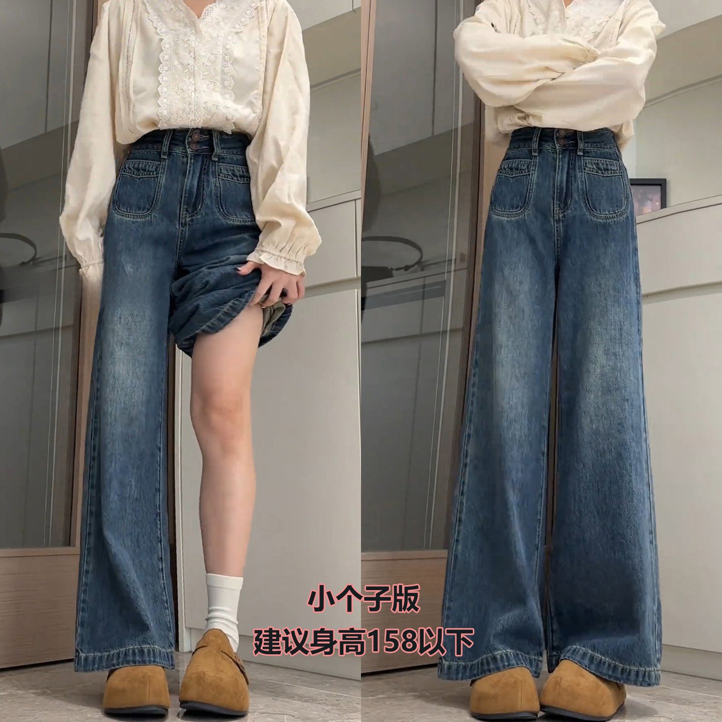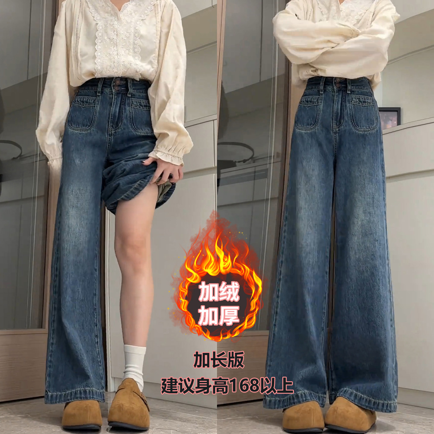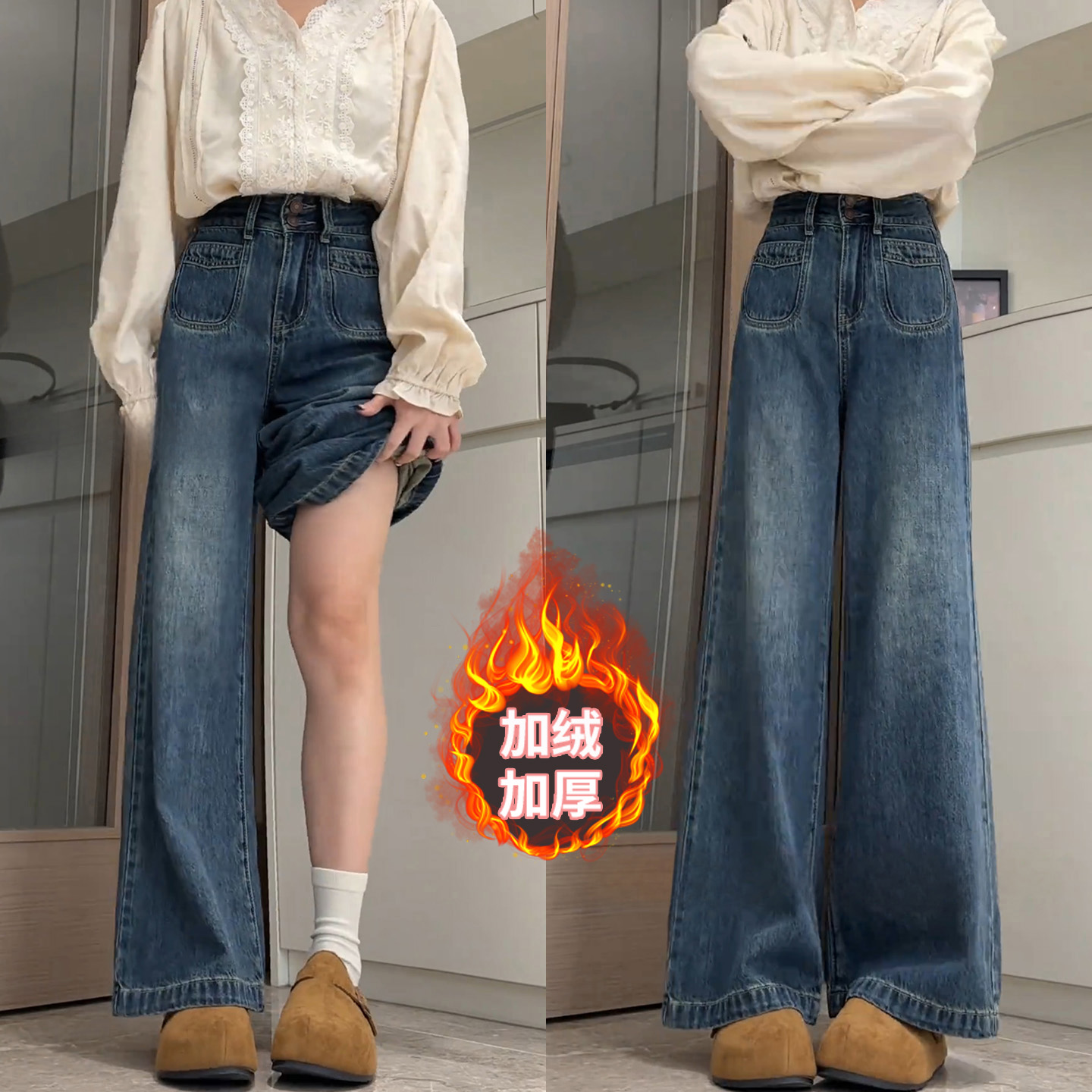 复古蓝阔腿牛仔裤女秋冬加绒大码胖mm高腰显瘦宽松直筒拖地长裤子