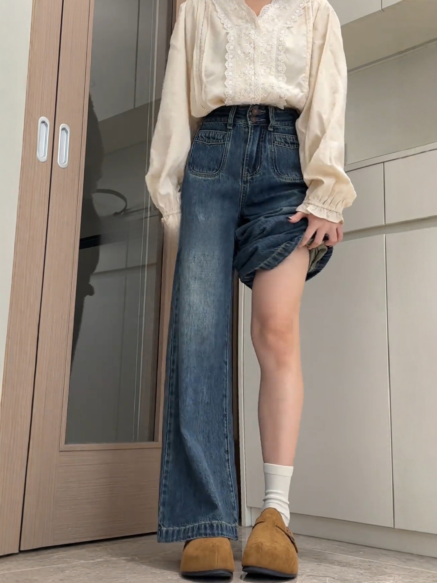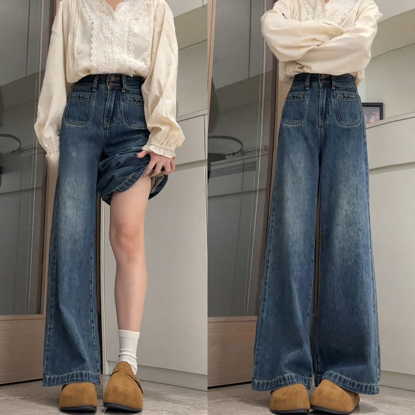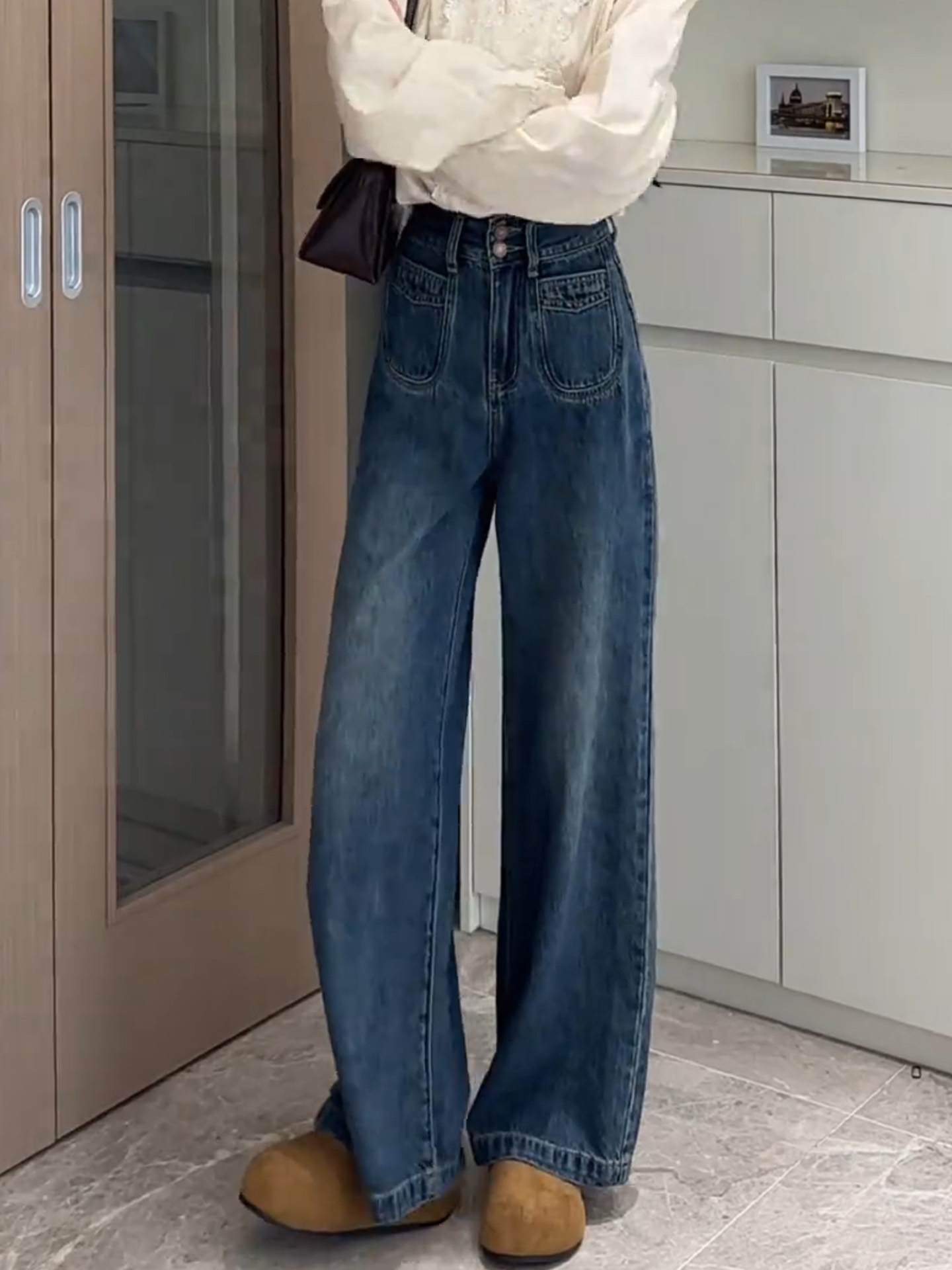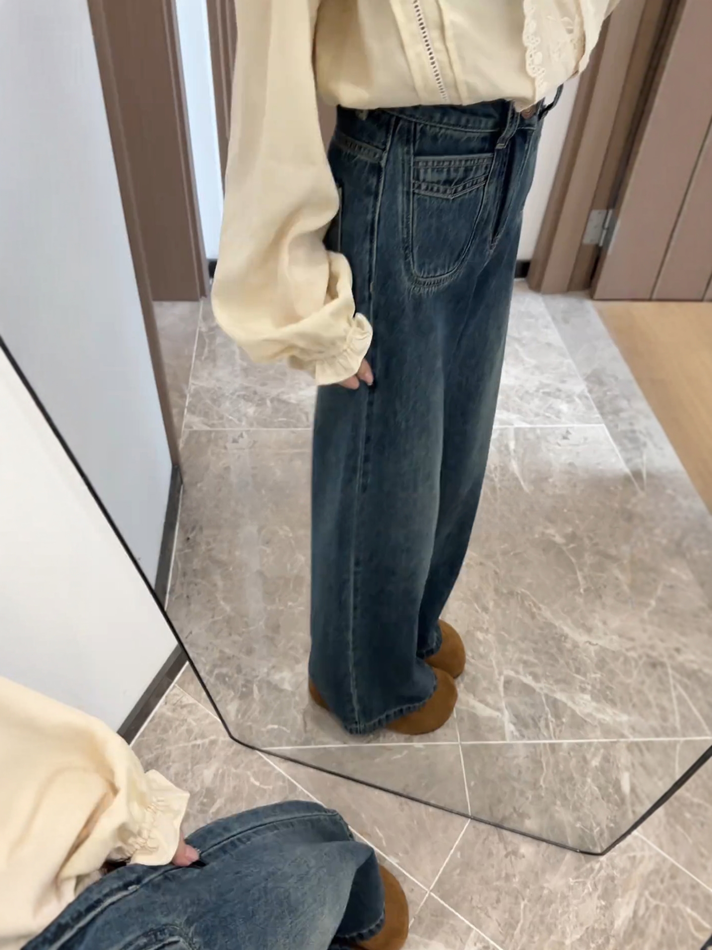 复古蓝阔腿牛仔裤女秋冬加绒大码胖mm高腰显瘦宽松直筒拖地长裤子