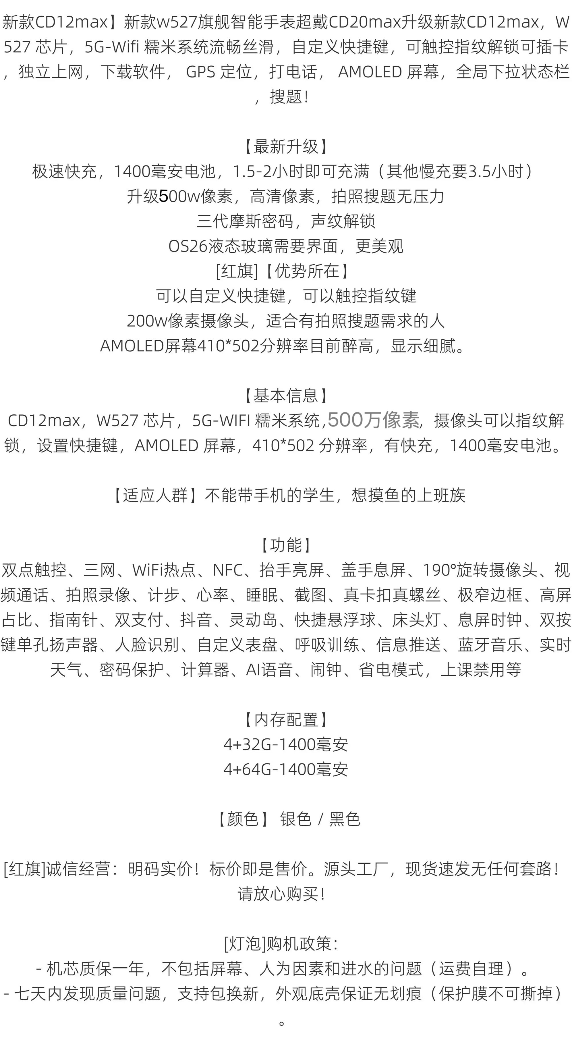 华强北W527芯片CD12max智能手表1400毫安蜂窝版5G全网通插卡手表