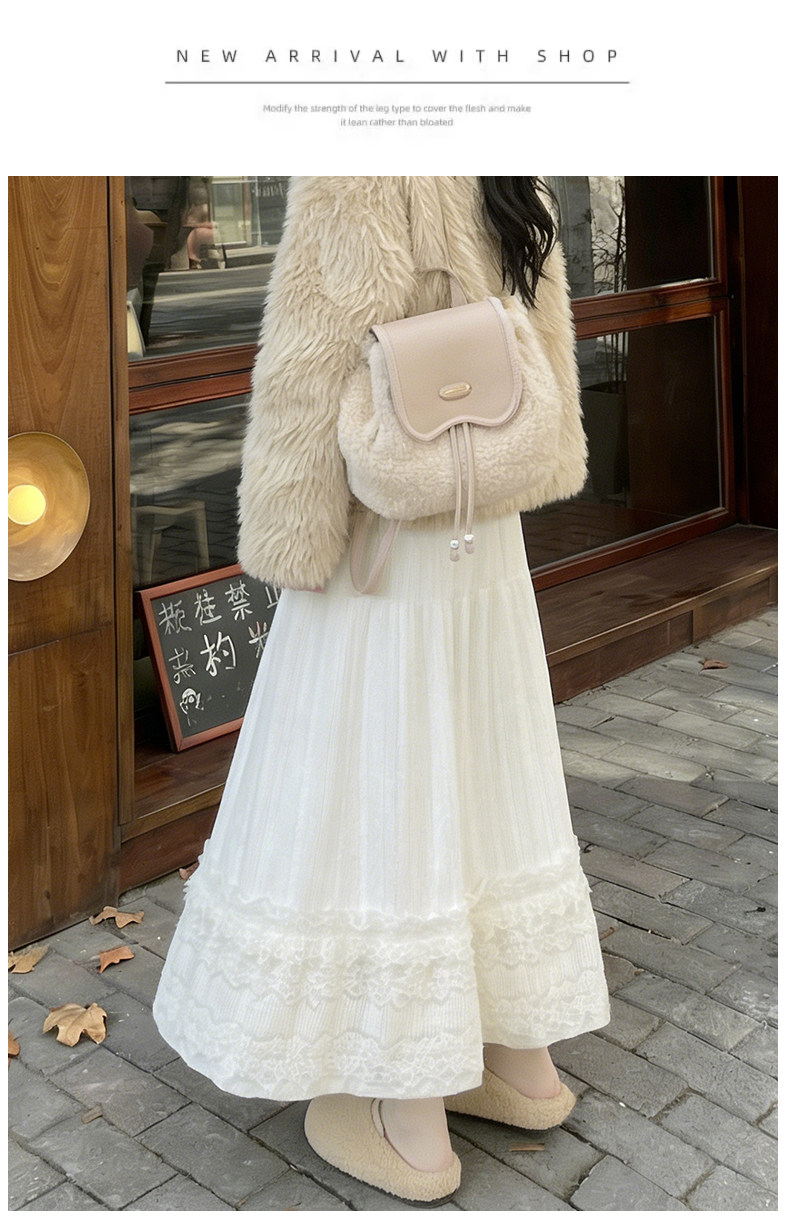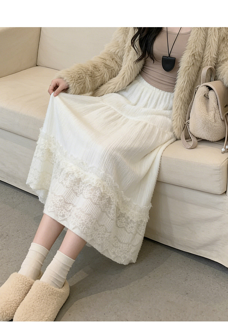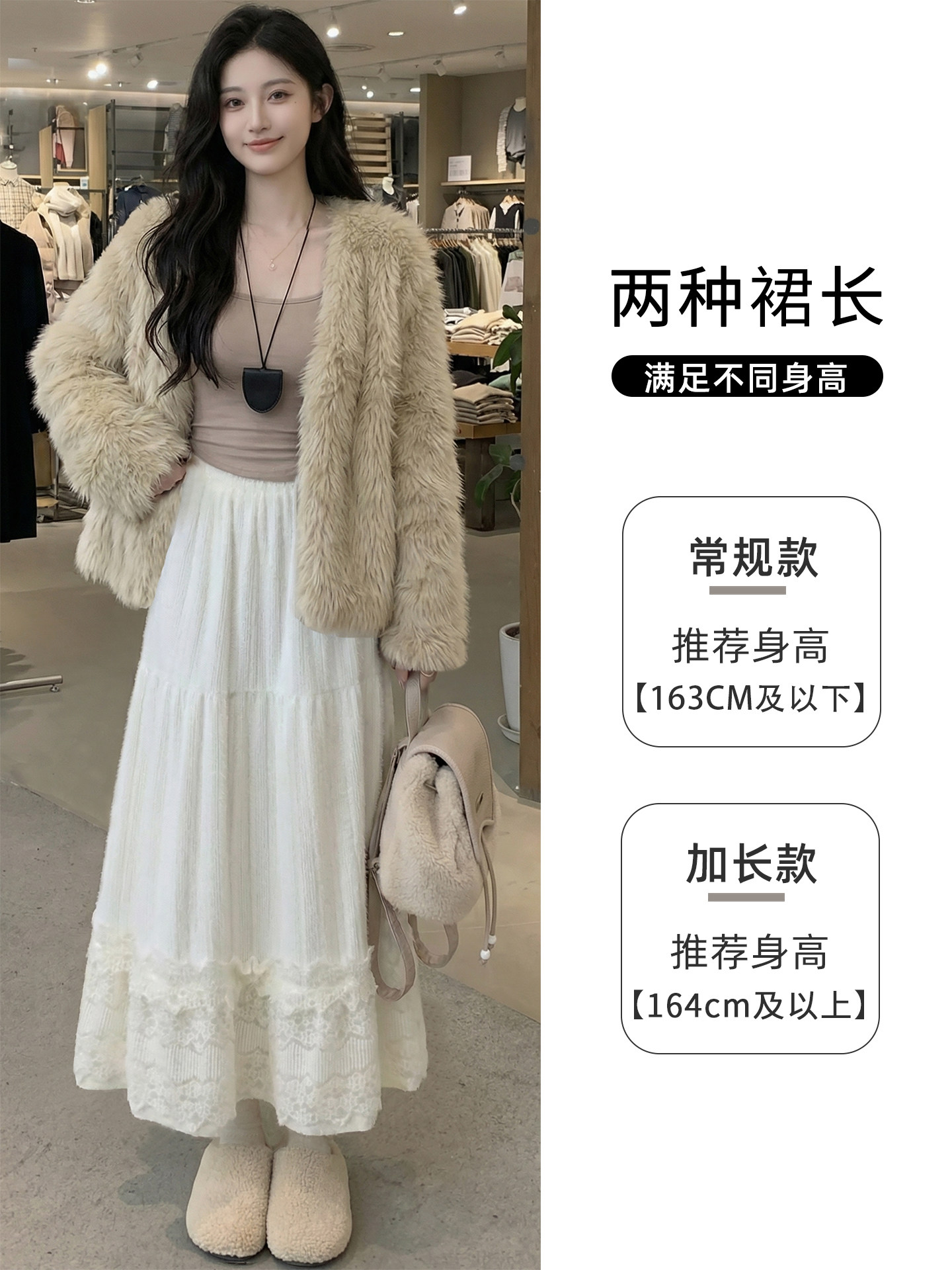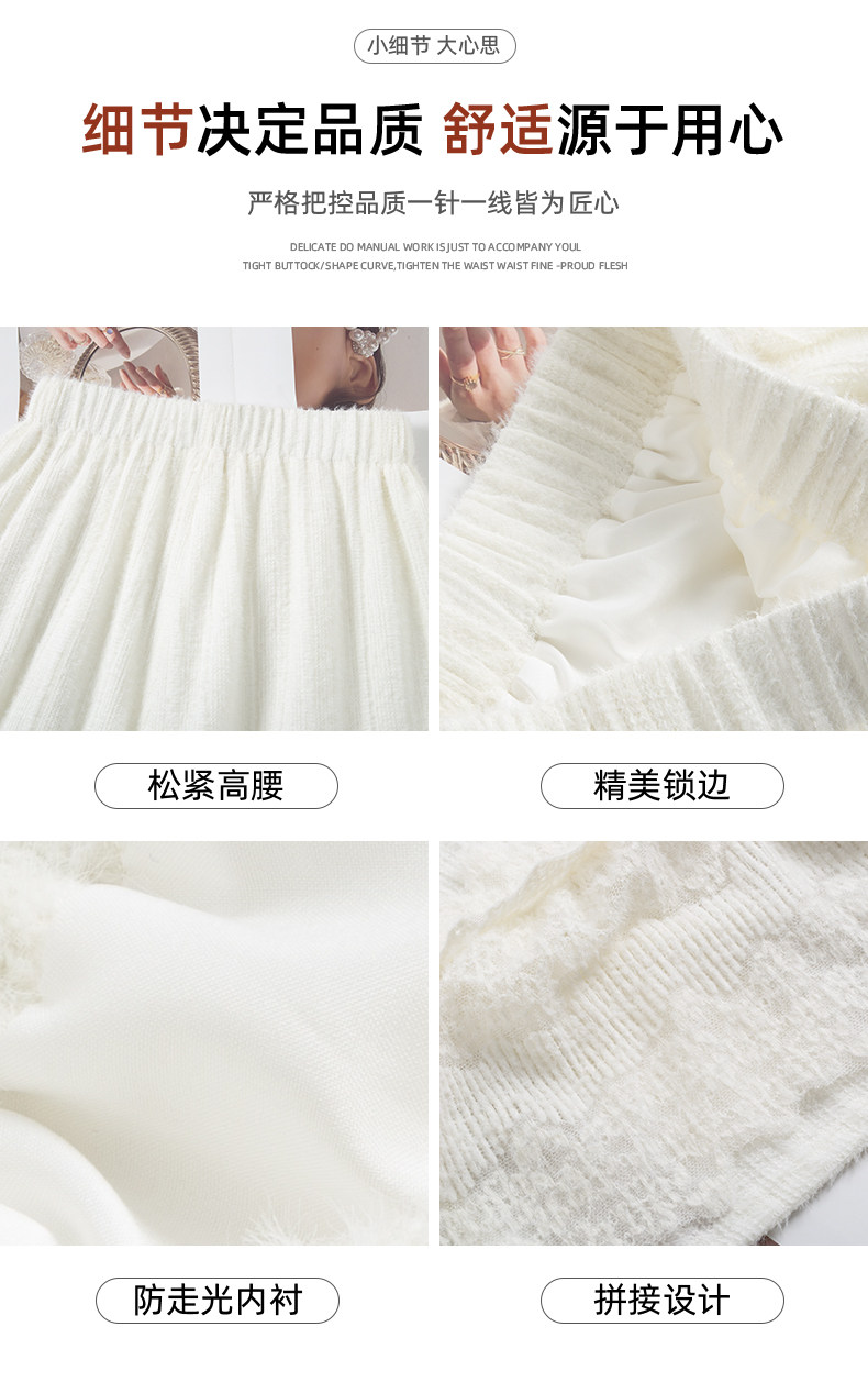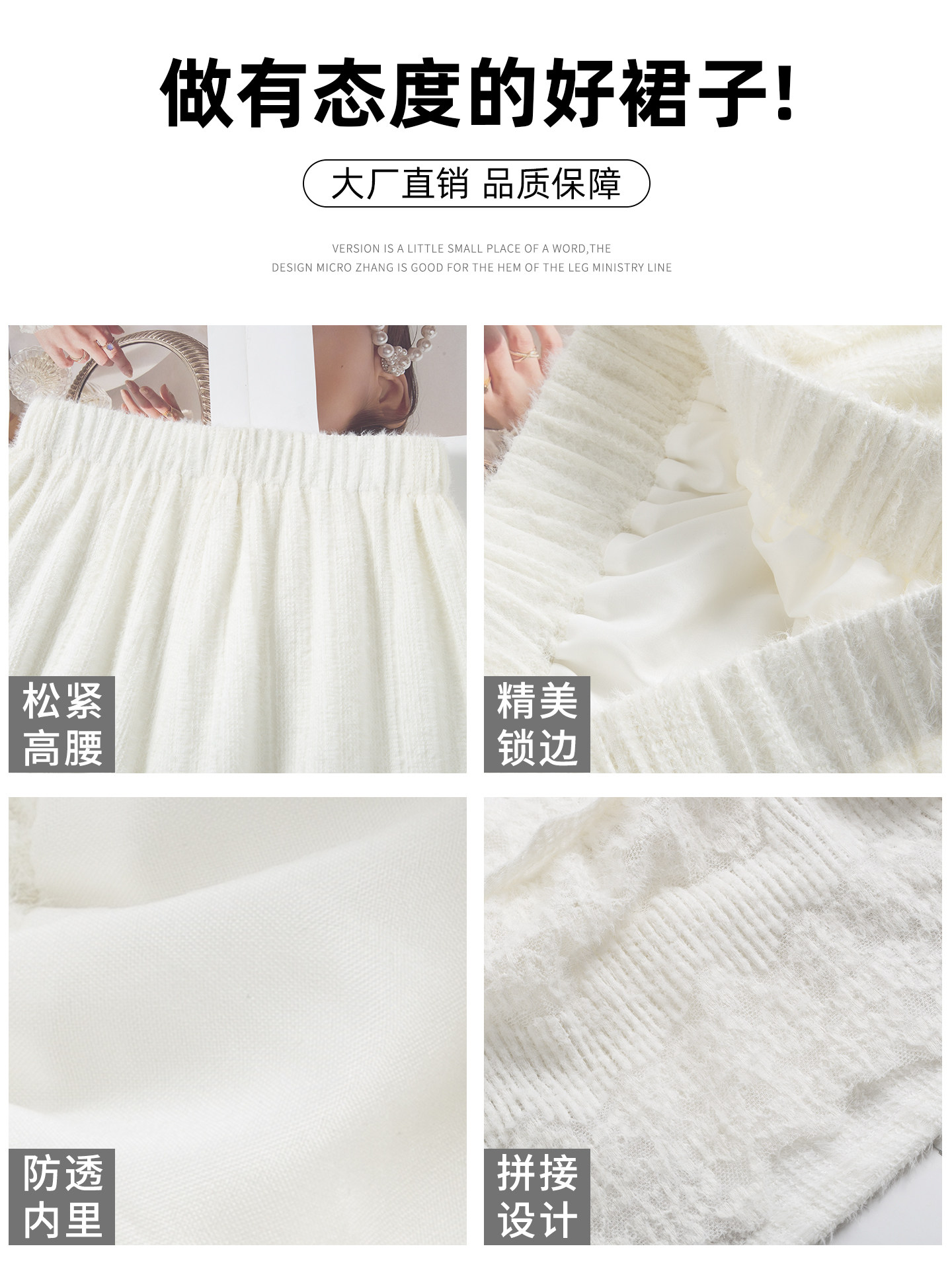 白色毛绒针织半身裙女秋冬季高腰a字长裙子超好看冬装蕾丝蛋糕裙