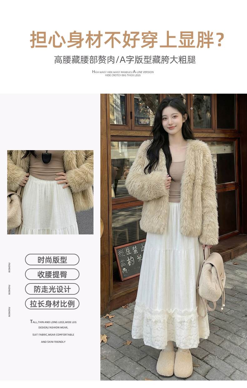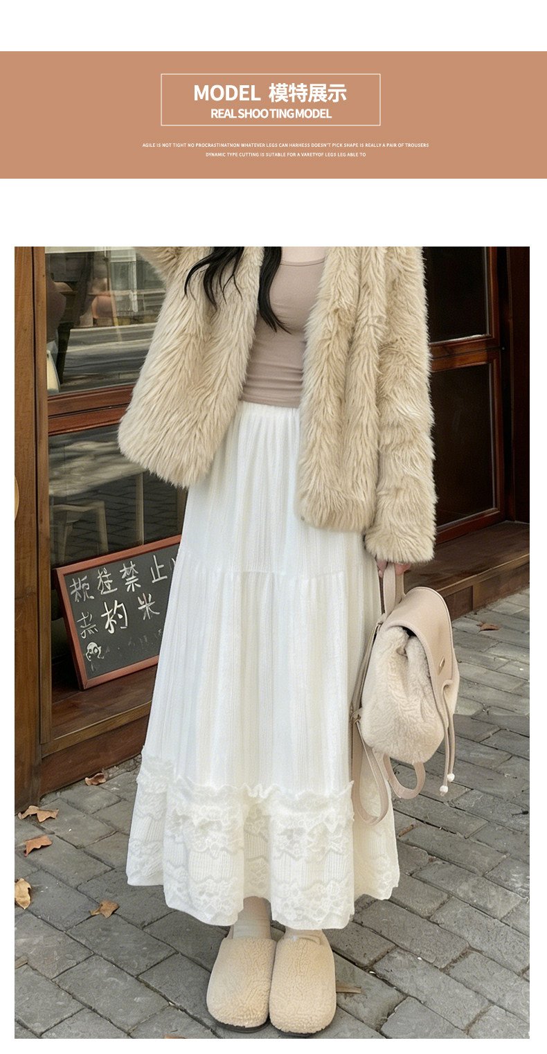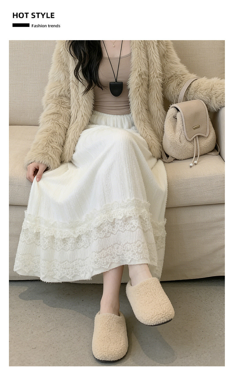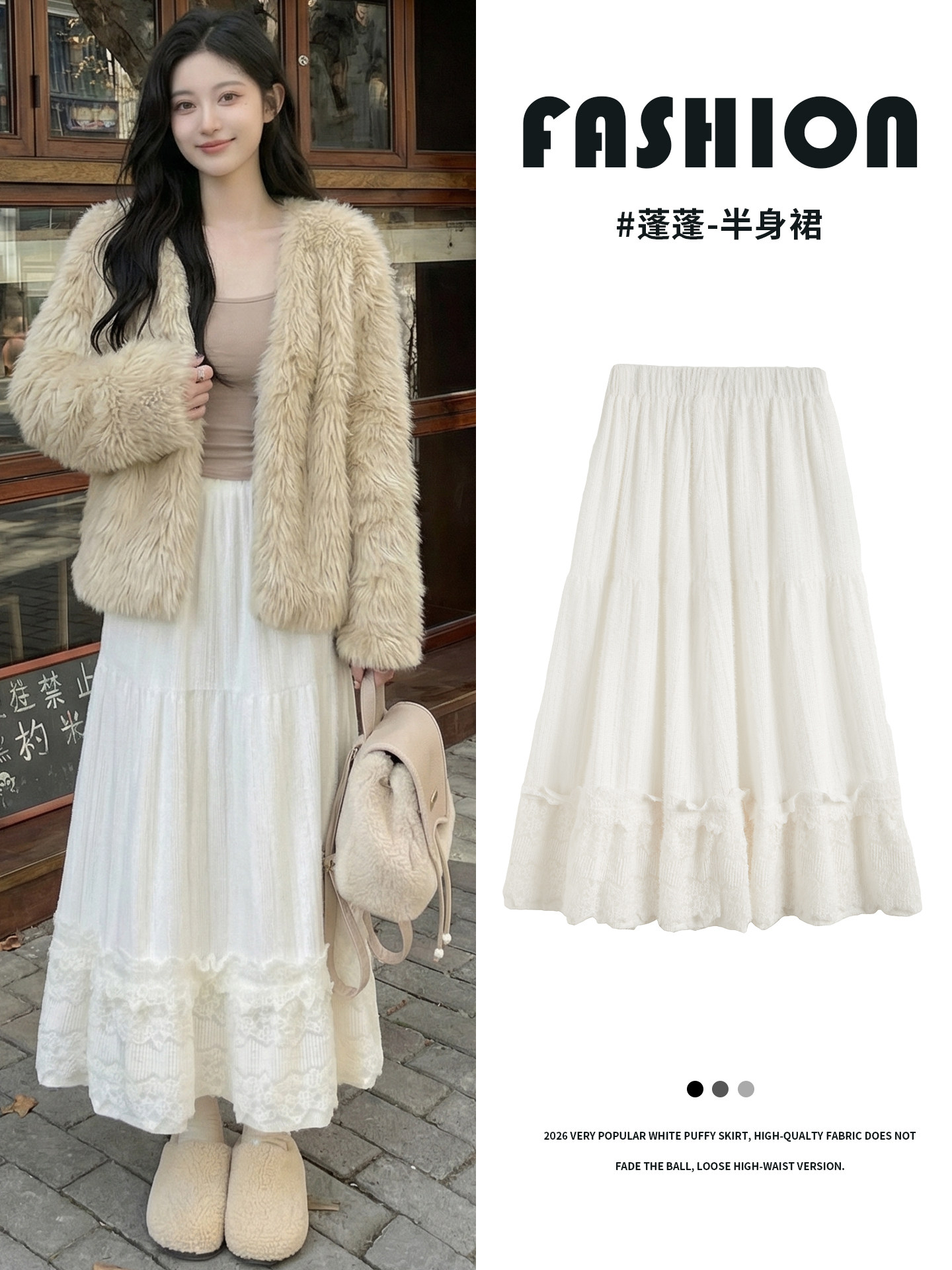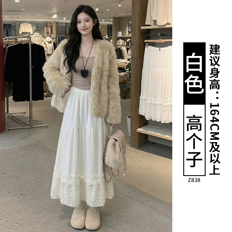 白色毛绒针织半身裙女秋冬季高腰a字长裙子超好看冬装蕾丝蛋糕裙