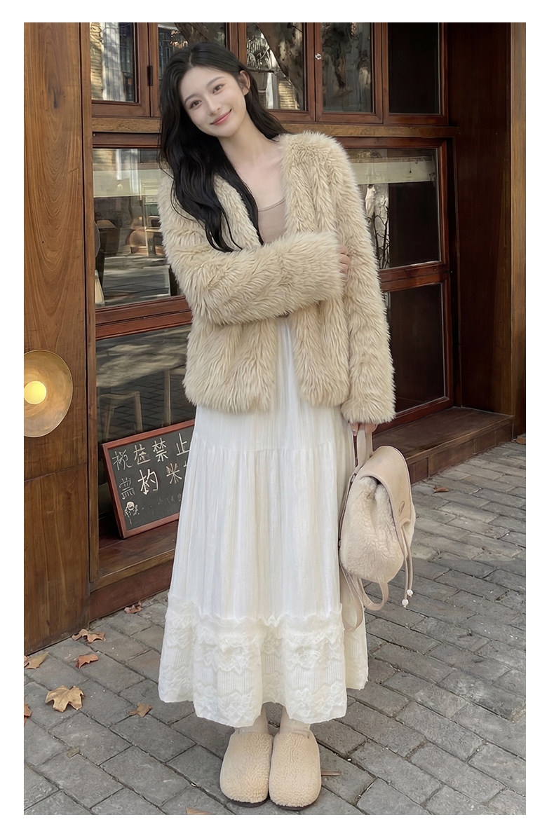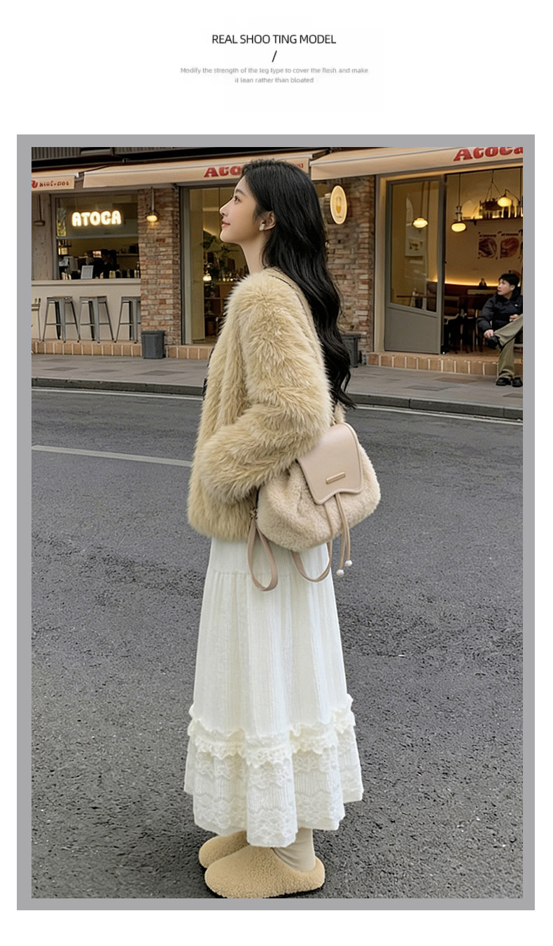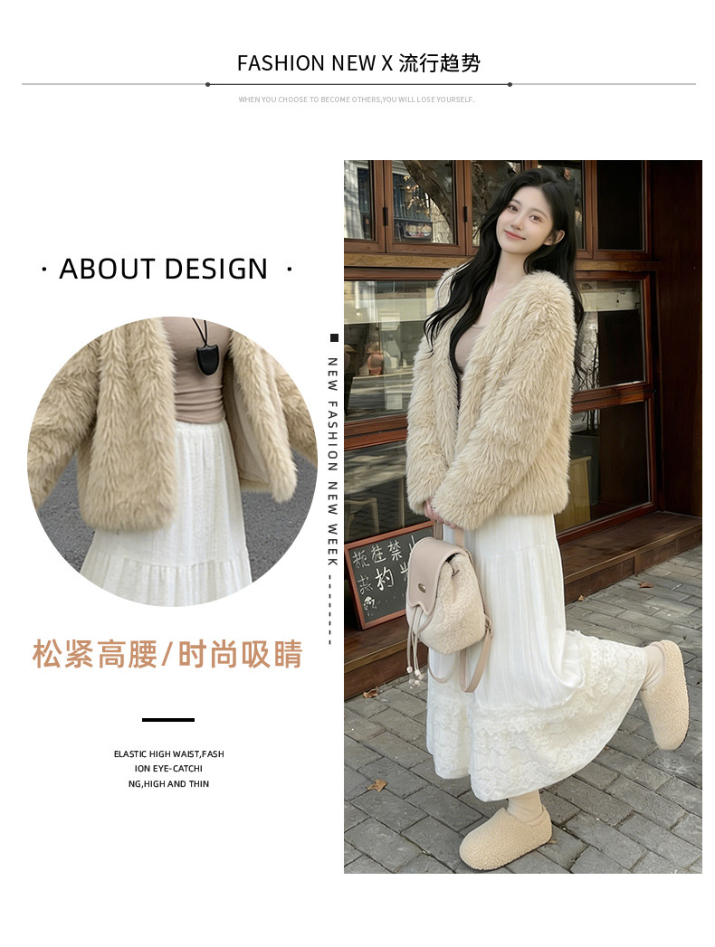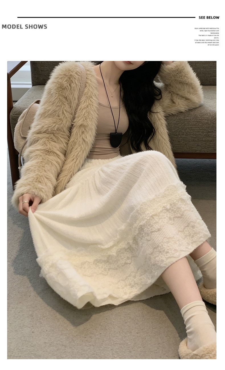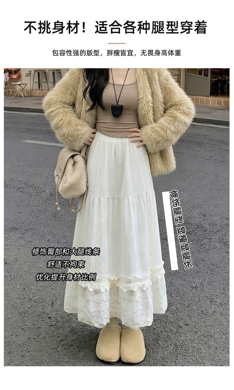 白色毛绒针织半身裙女秋冬季高腰a字长裙子超好看冬装蕾丝蛋糕裙