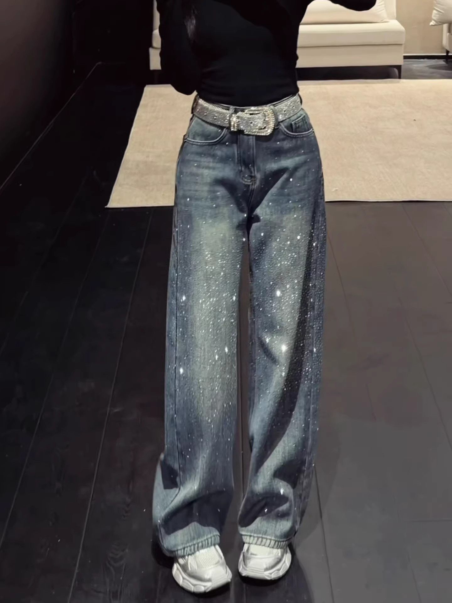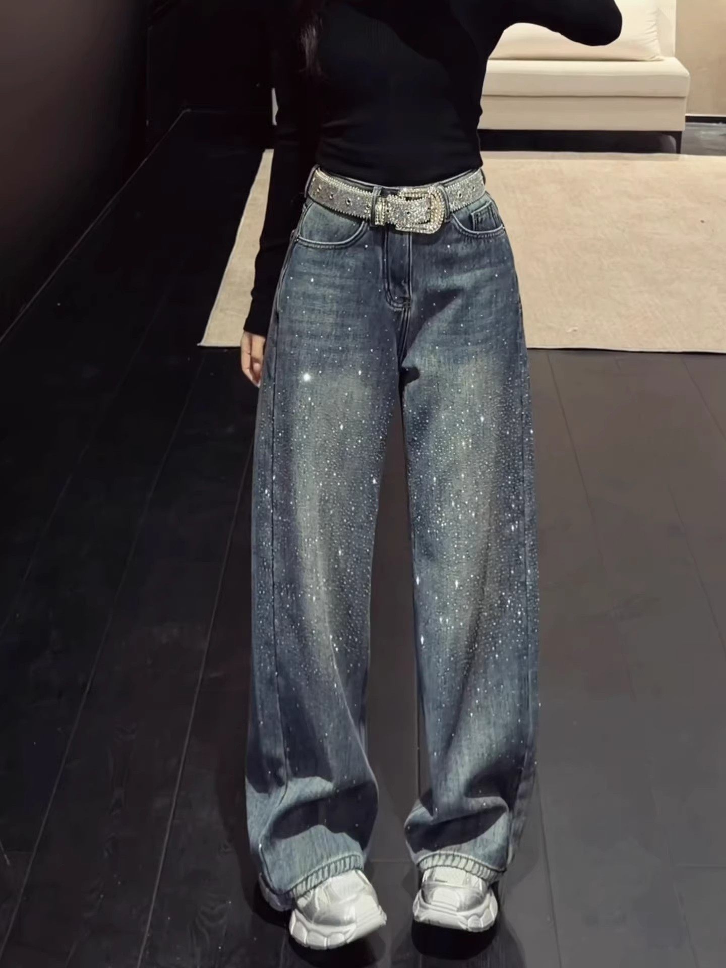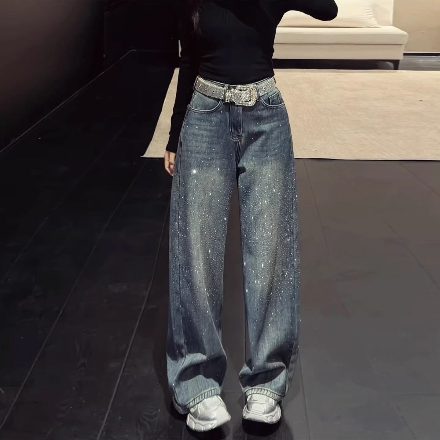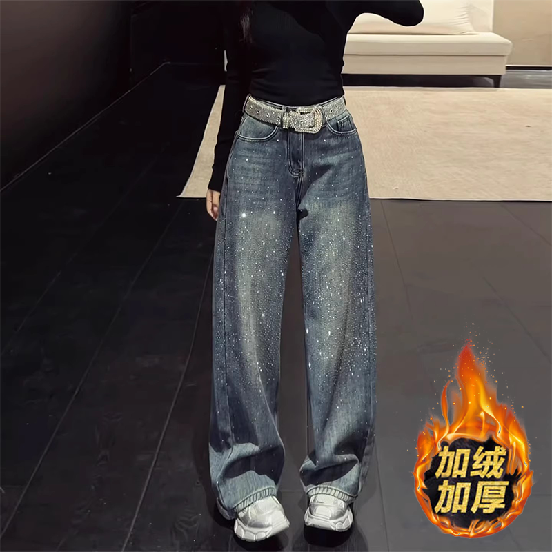 复古重工满天星烫钻阔腿牛仔裤女2026春季新款加绒高腰宽松直筒裤