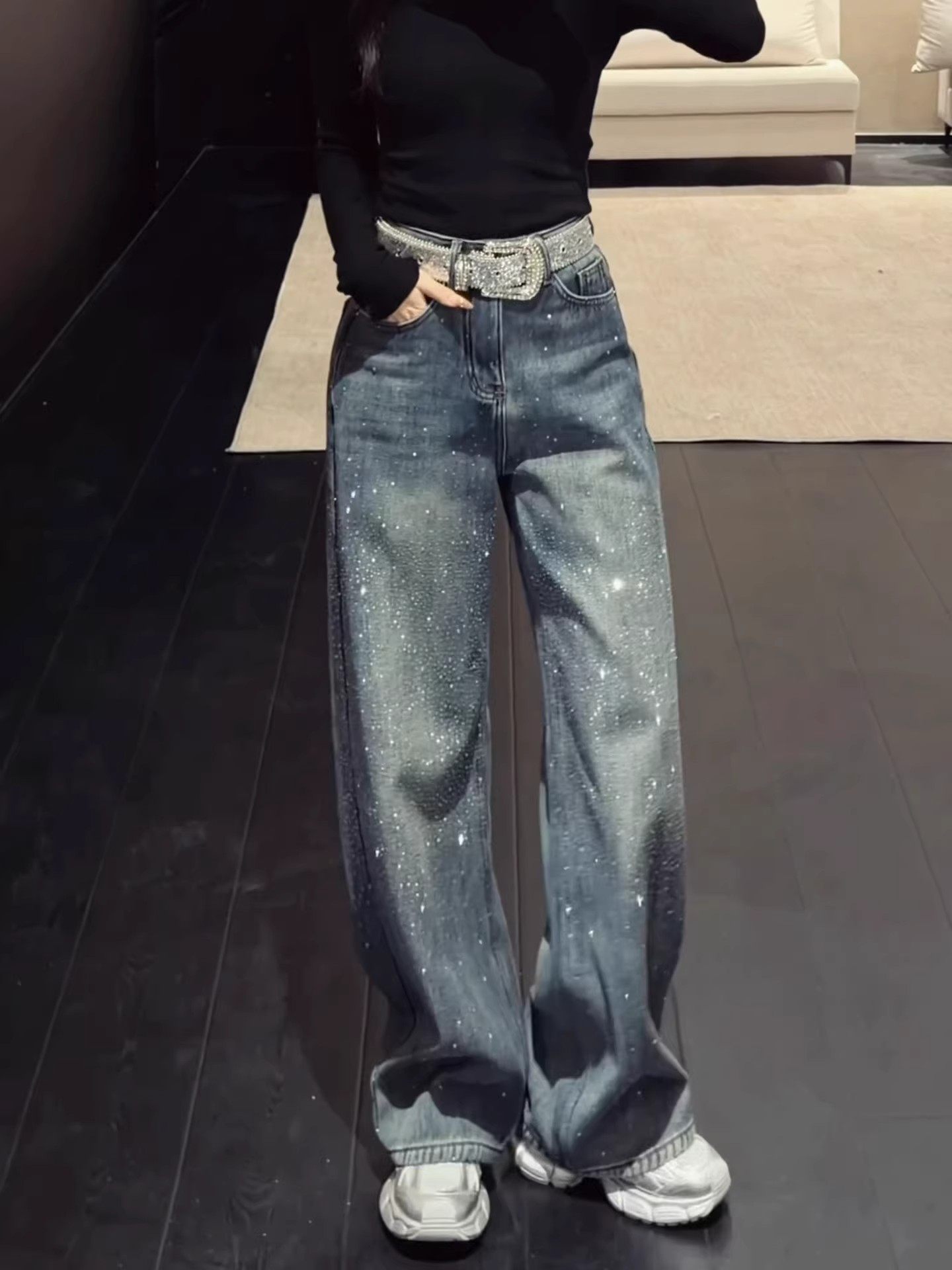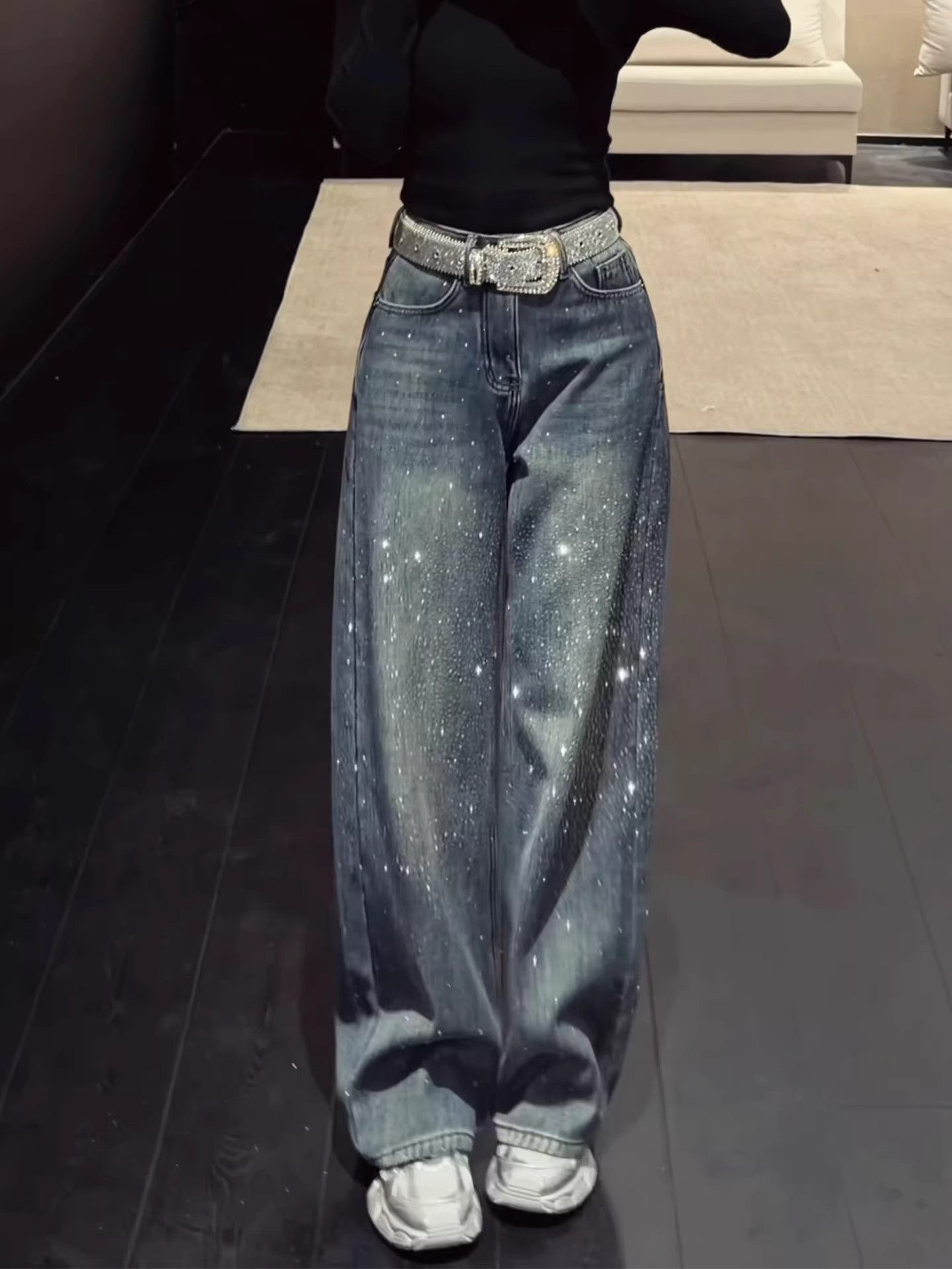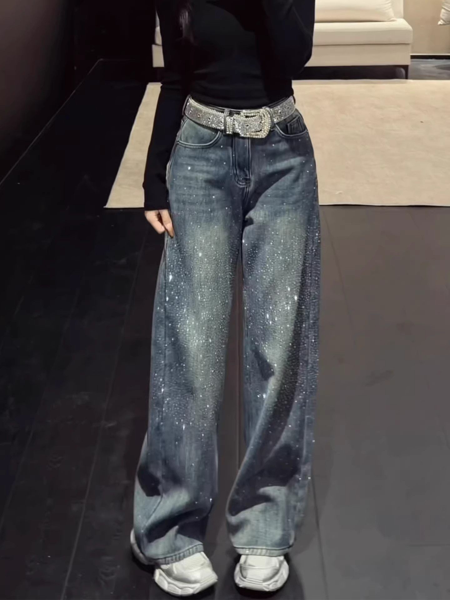 复古重工满天星烫钻阔腿牛仔裤女2026春季新款加绒高腰宽松直筒裤