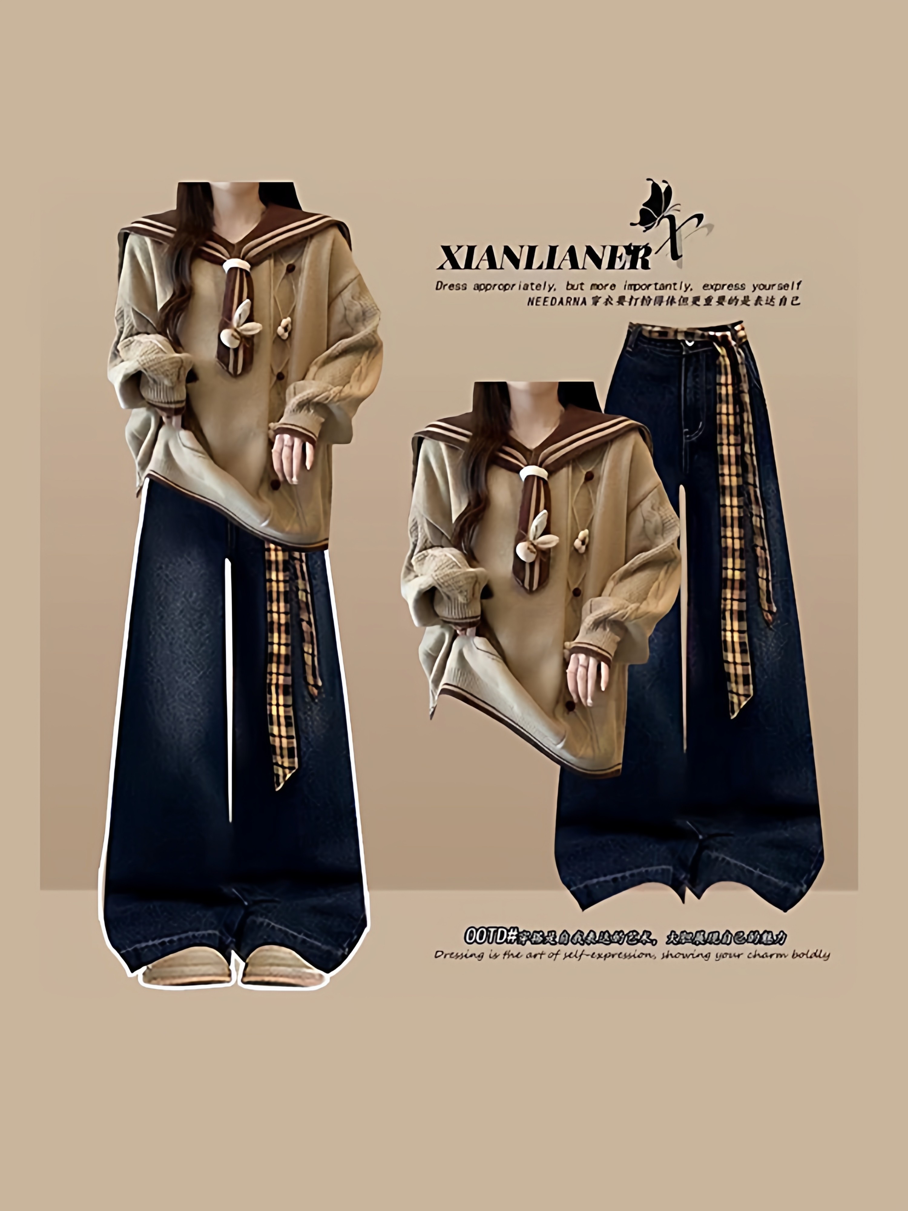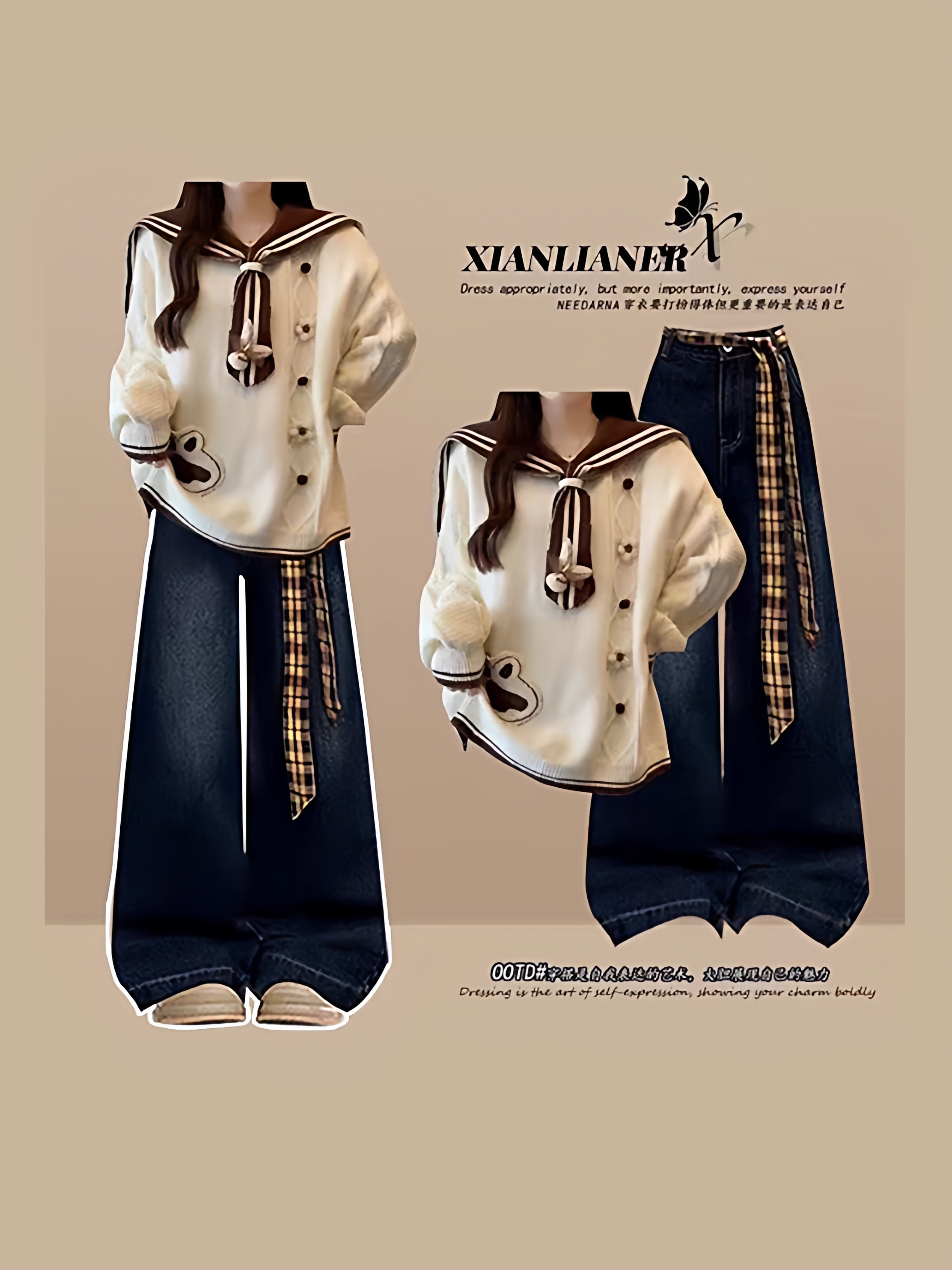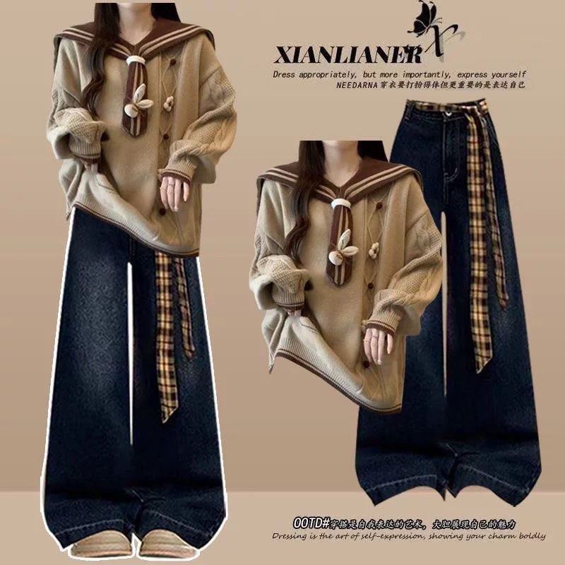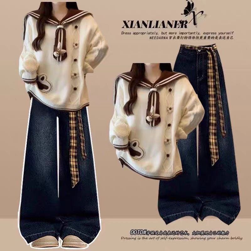 学院风海军领毛衣牛仔裤两件套女秋冬季少女学生显瘦套装韩系穿搭