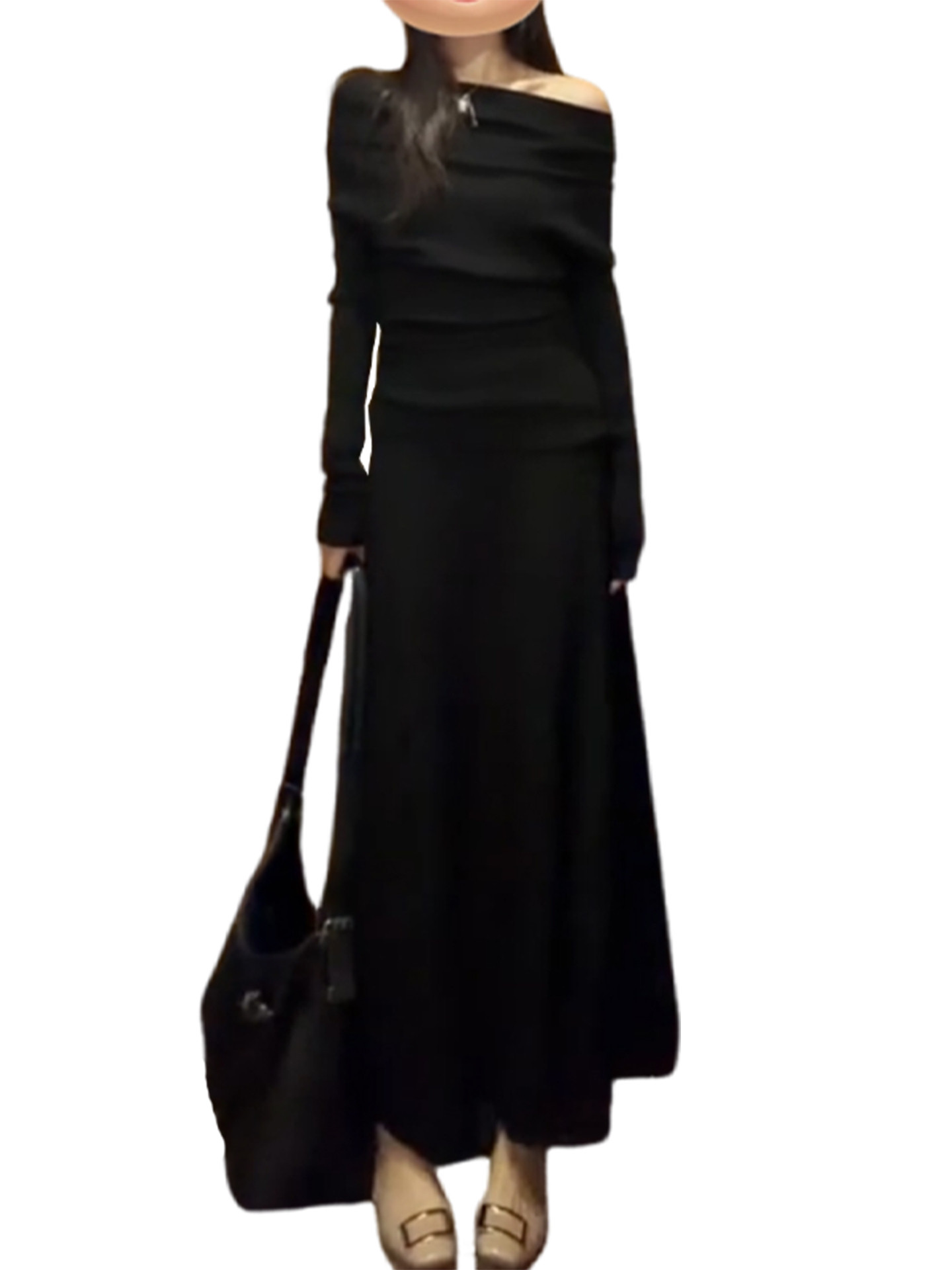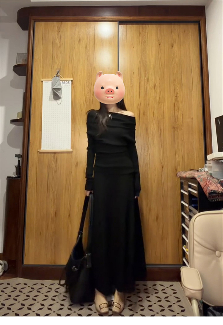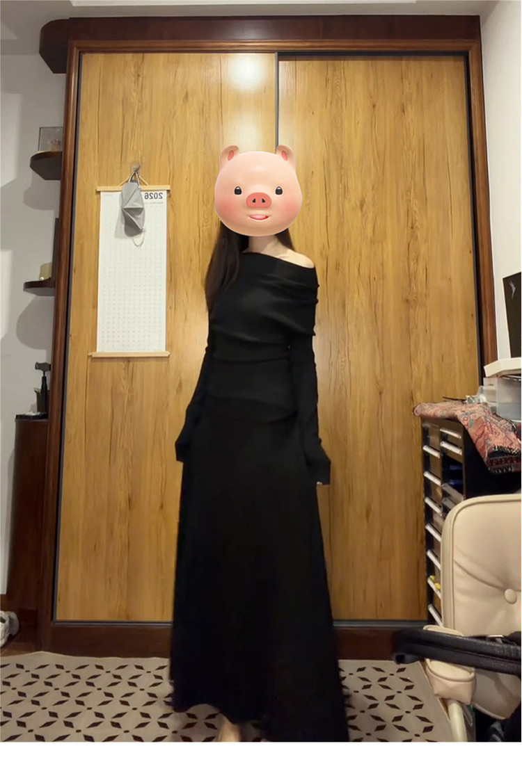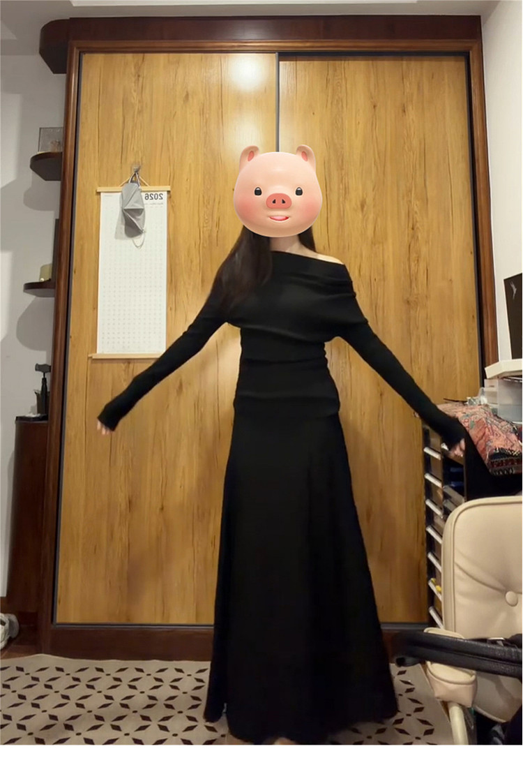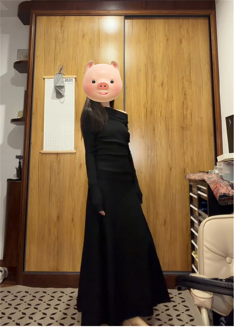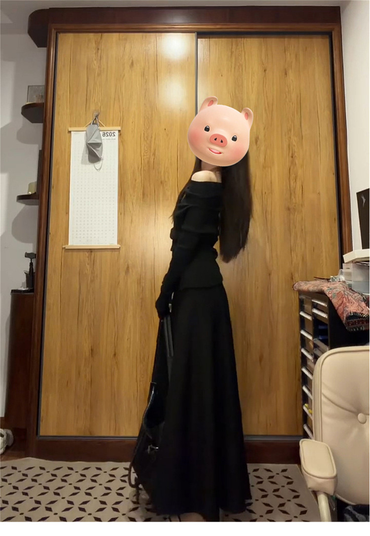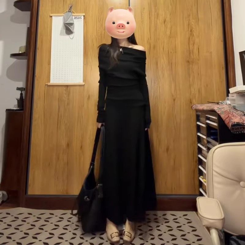 黑色一字肩连衣裙子女秋冬季2026新款超火ootd穿搭赫本风一整套装
