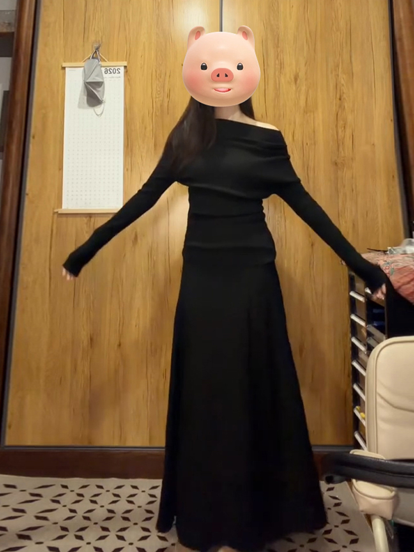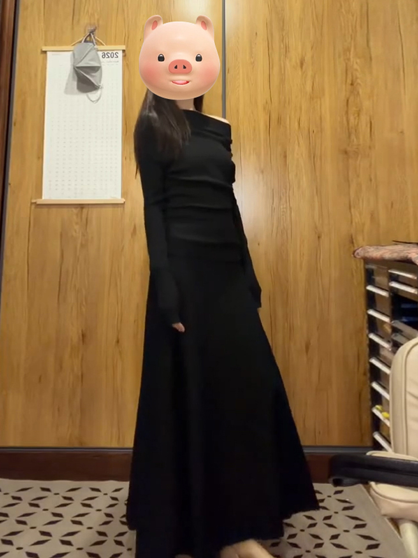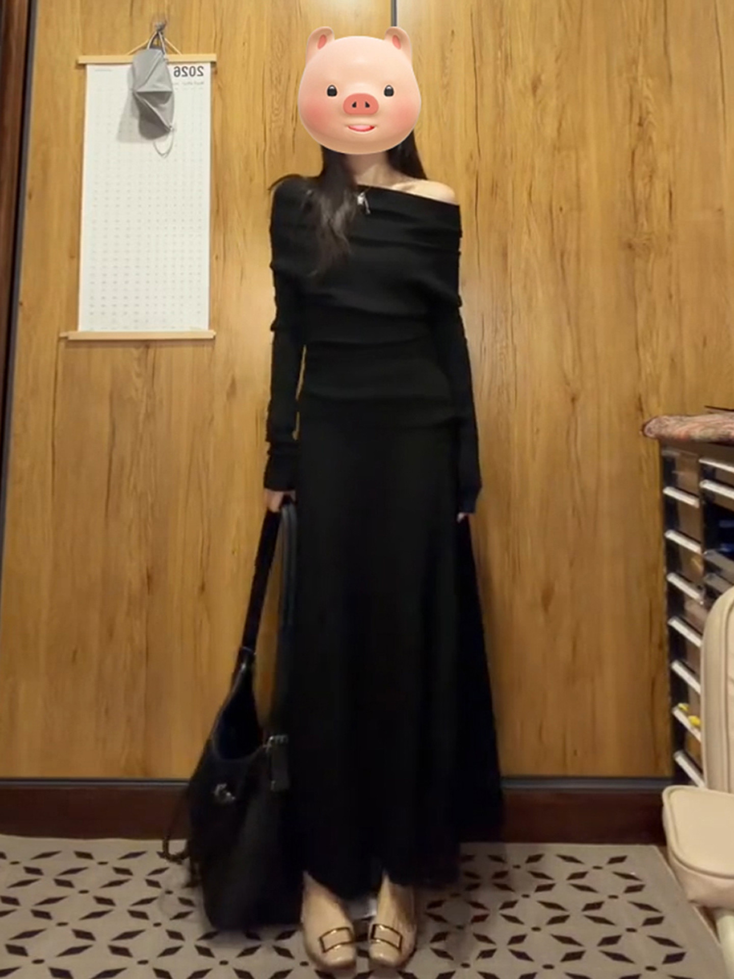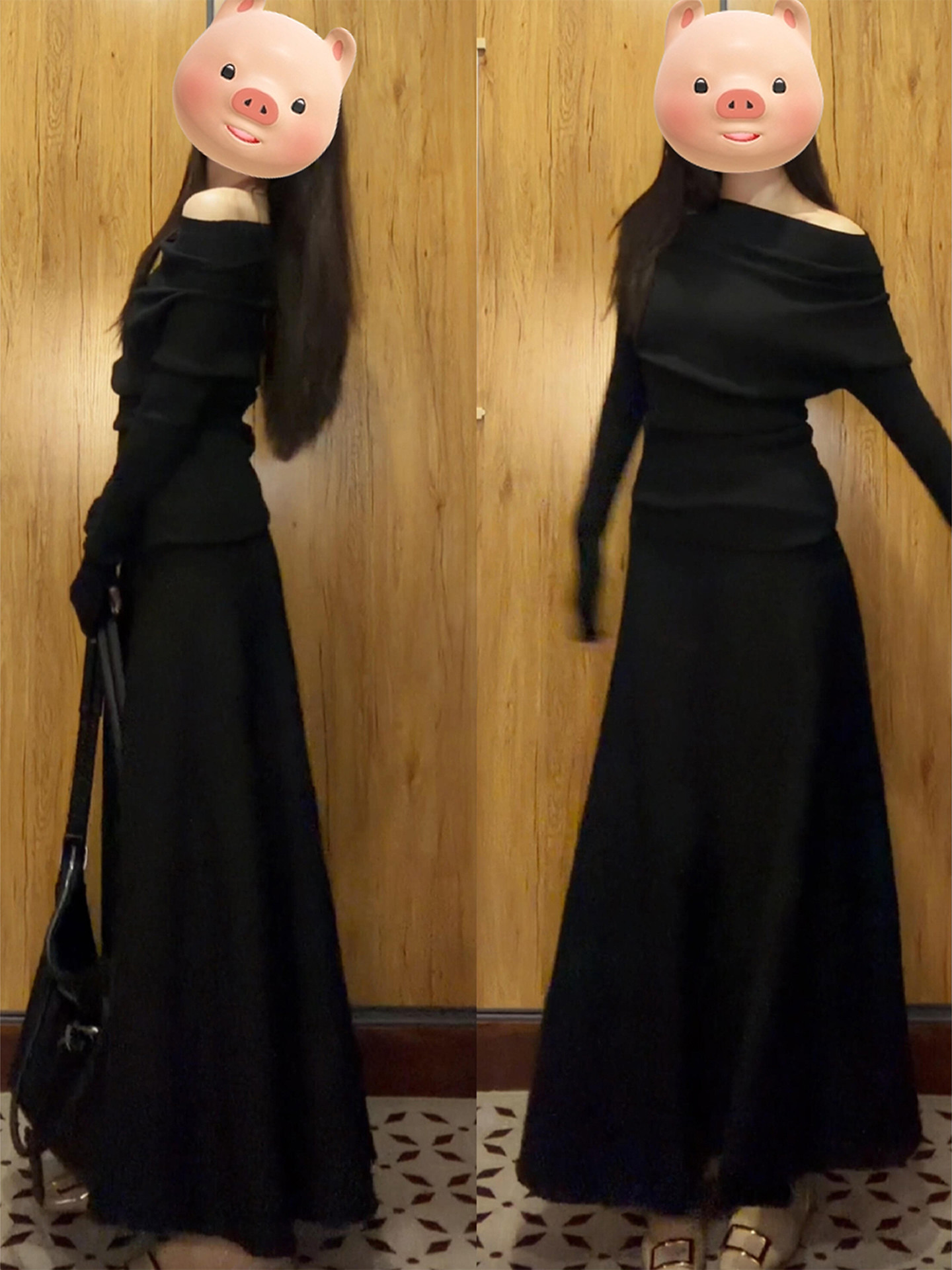 黑色一字肩连衣裙子女秋冬季2026新款超火ootd穿搭赫本风一整套装