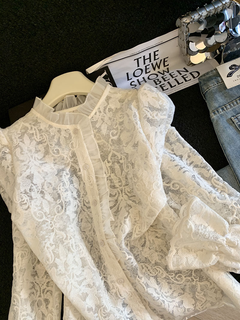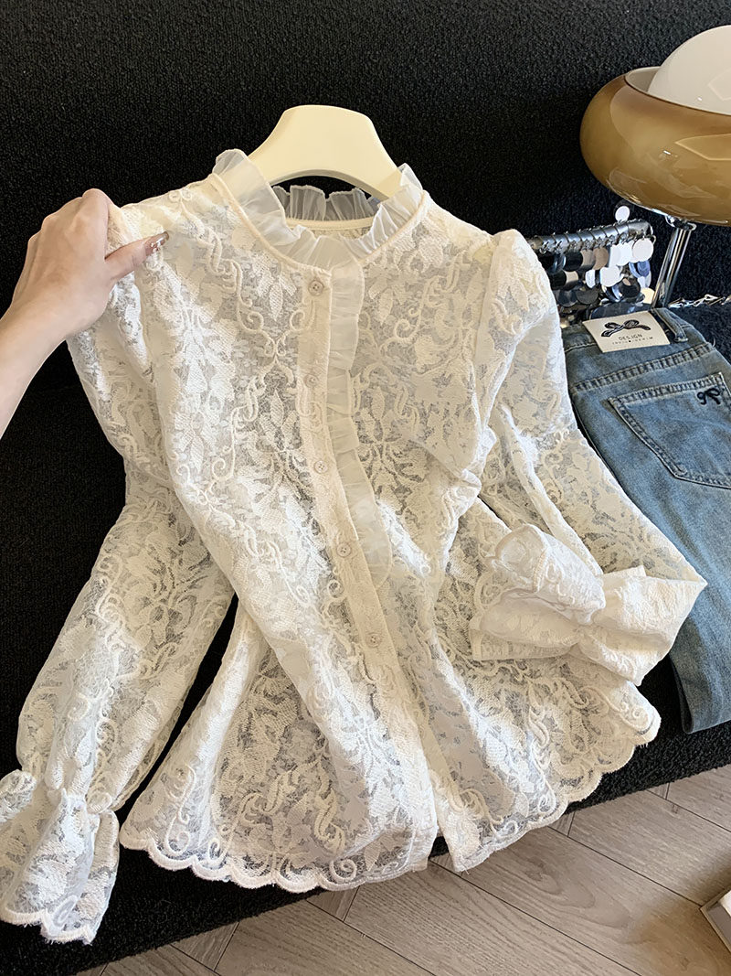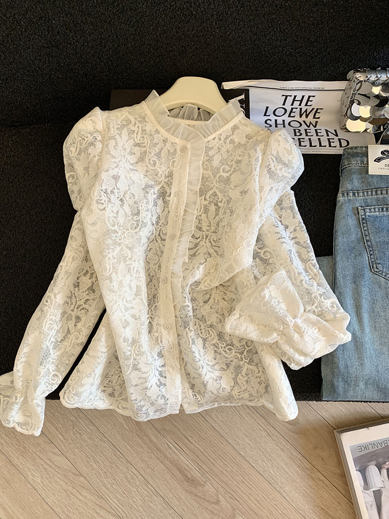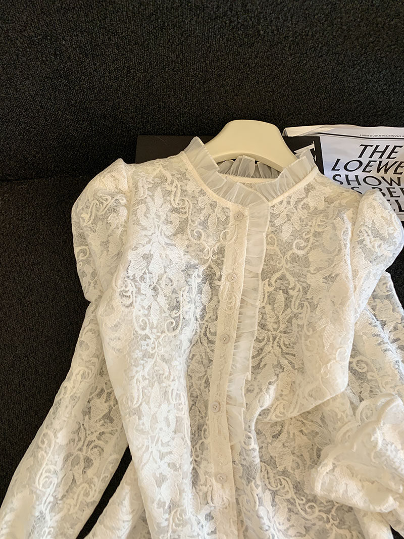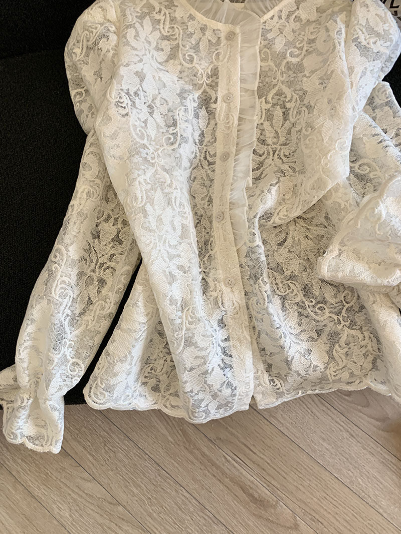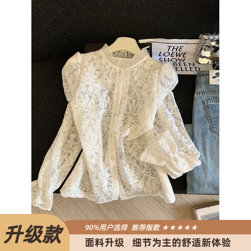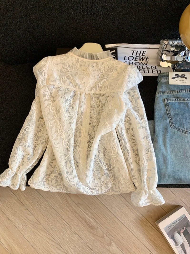 自留款推荐~花边领刺绣钩花喇叭袖衬衫女早春新款设计感别致上衣