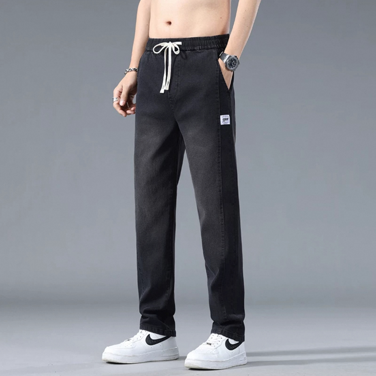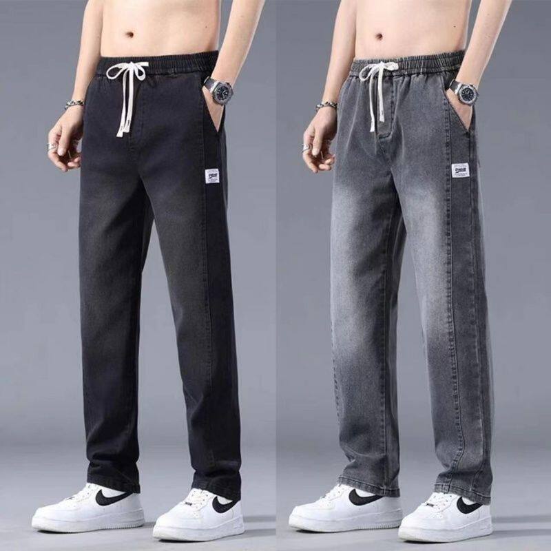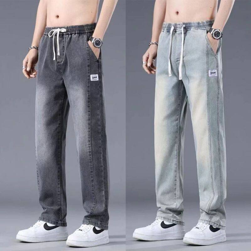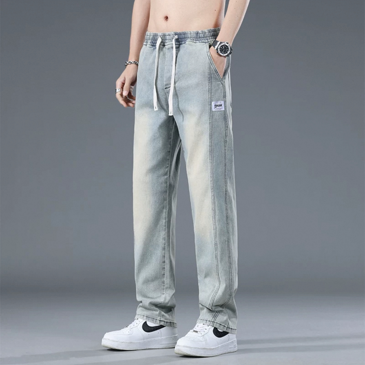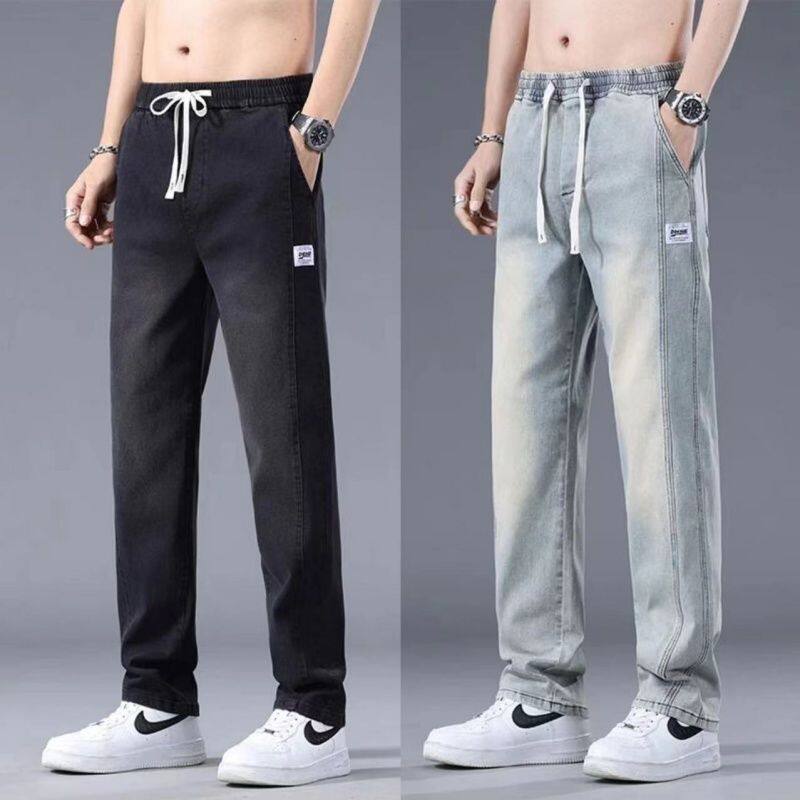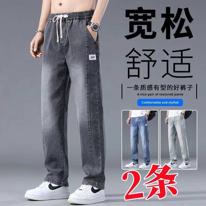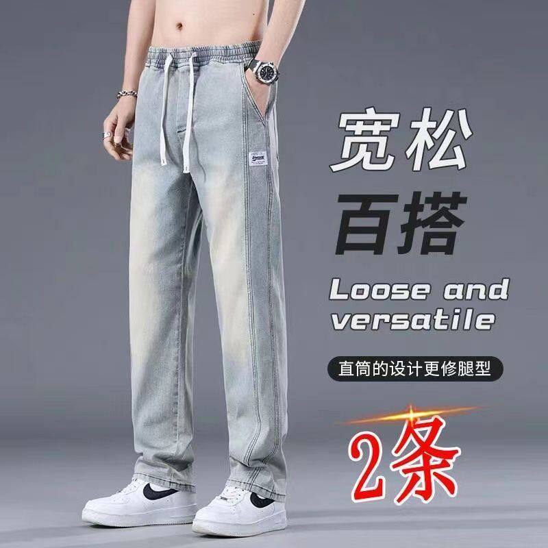 男士牛仔裤弹力抽绳宽松直筒长裤夏季薄款新款休闲潮牌青年男裤子