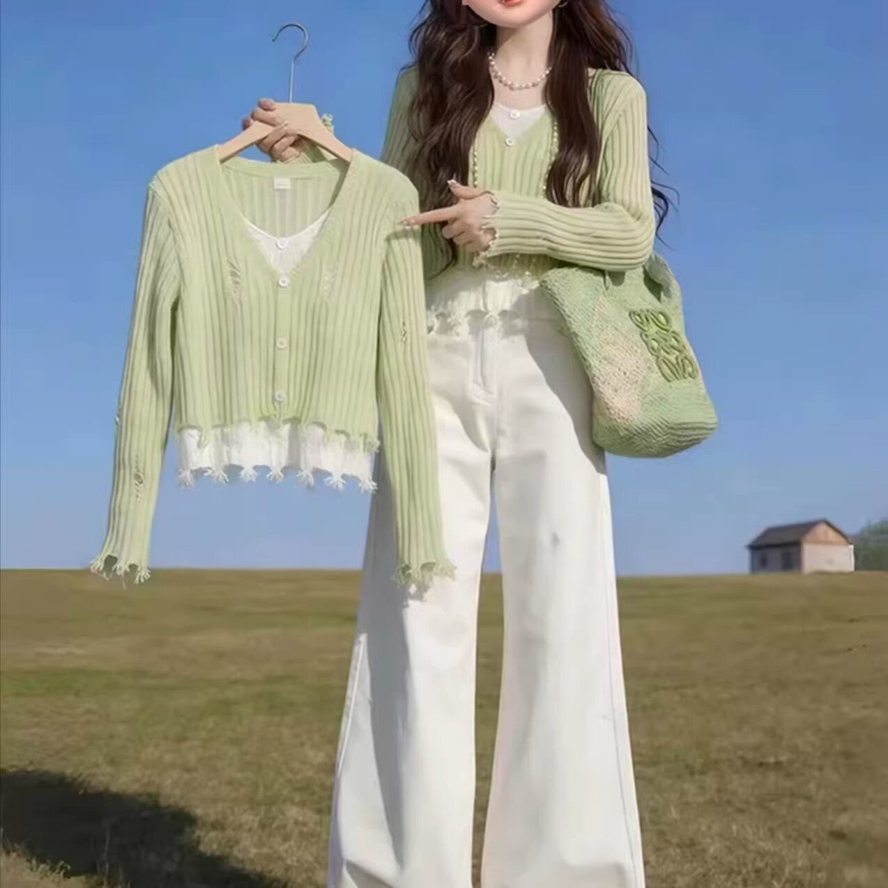 绿色假两件修身内搭打底针织衫女2026春季巨好看慵懒松弛绝美上衣