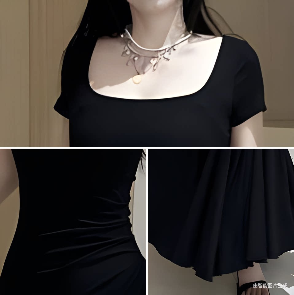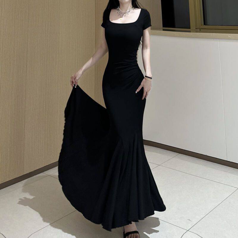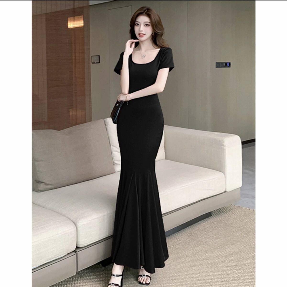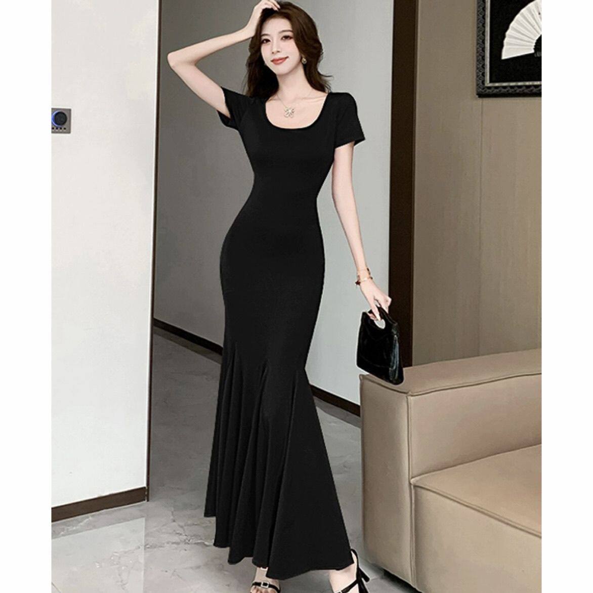 步步生莲黑色连衣裙女夏季新款气质短袖显瘦收腰包臀裙长裙鱼尾裙