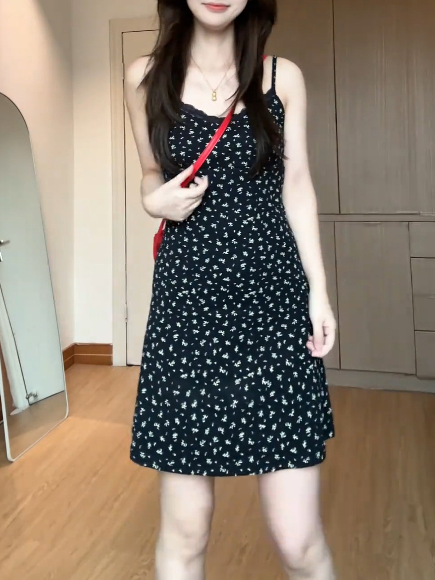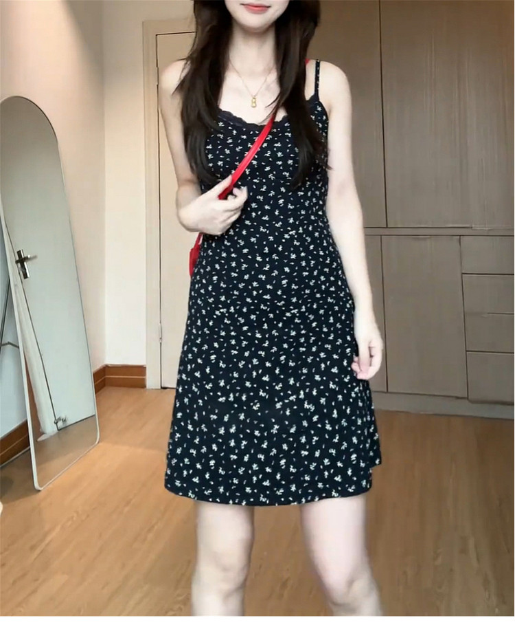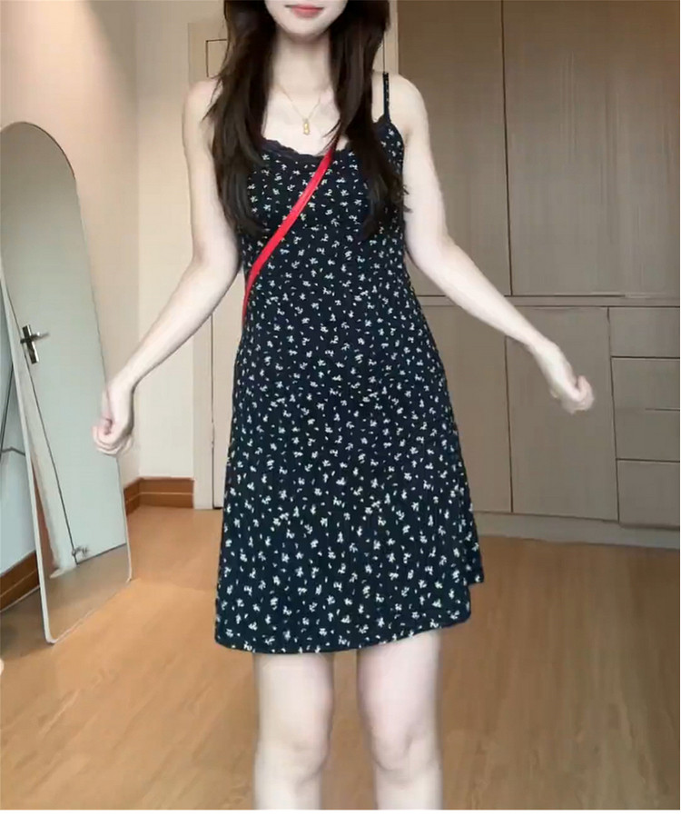 2026新款法式气质黑色碎花吊带连衣裙子女夏季小个子收腰显瘦短裙