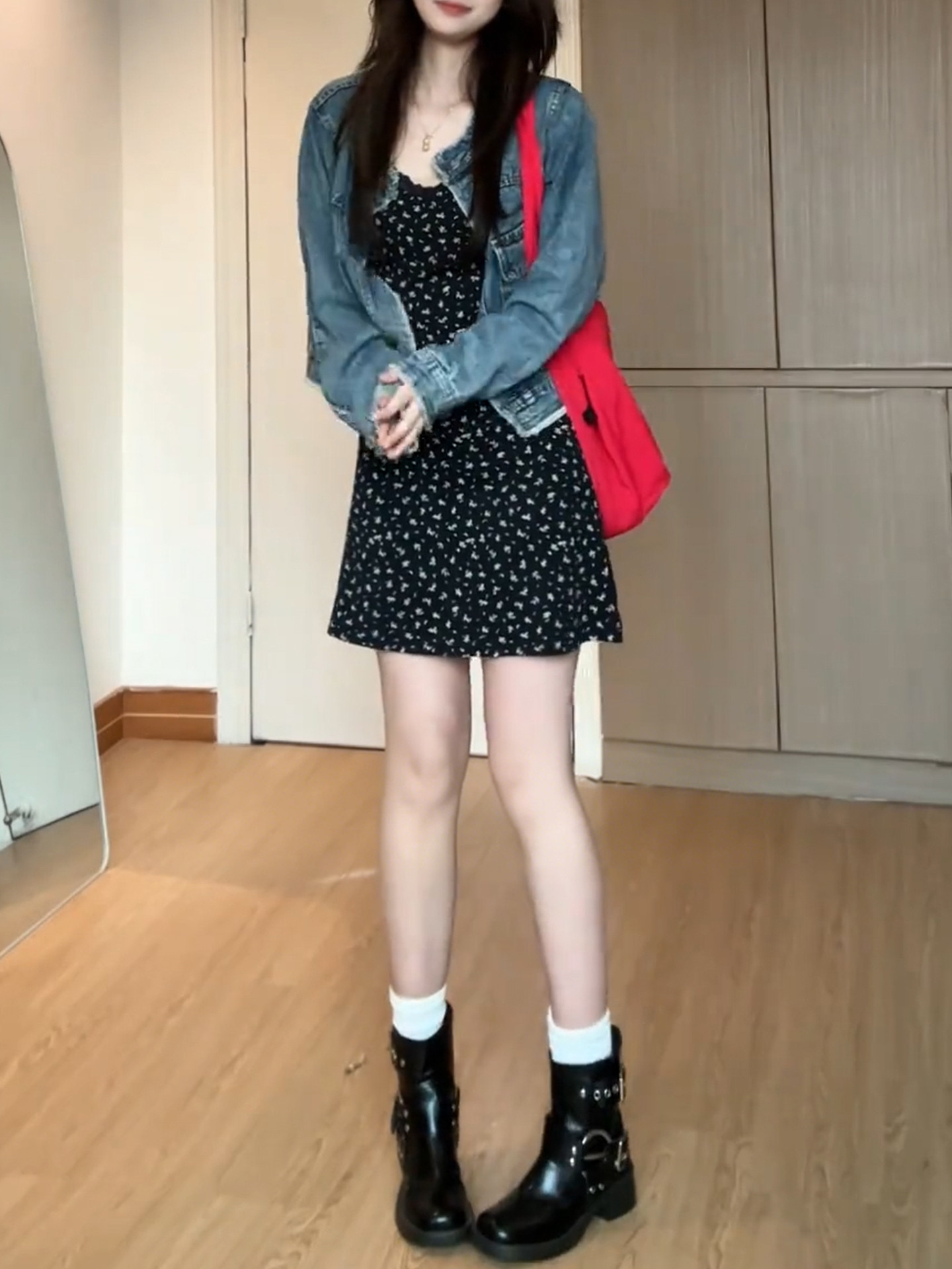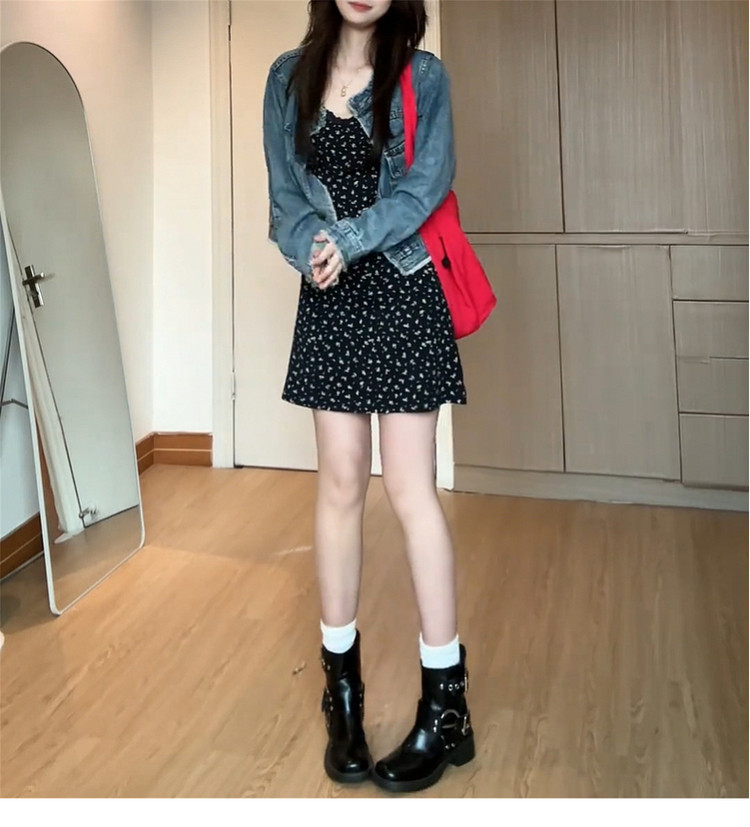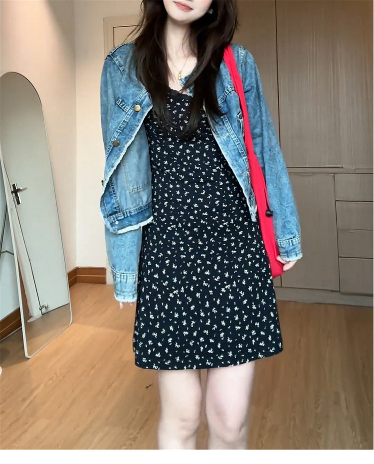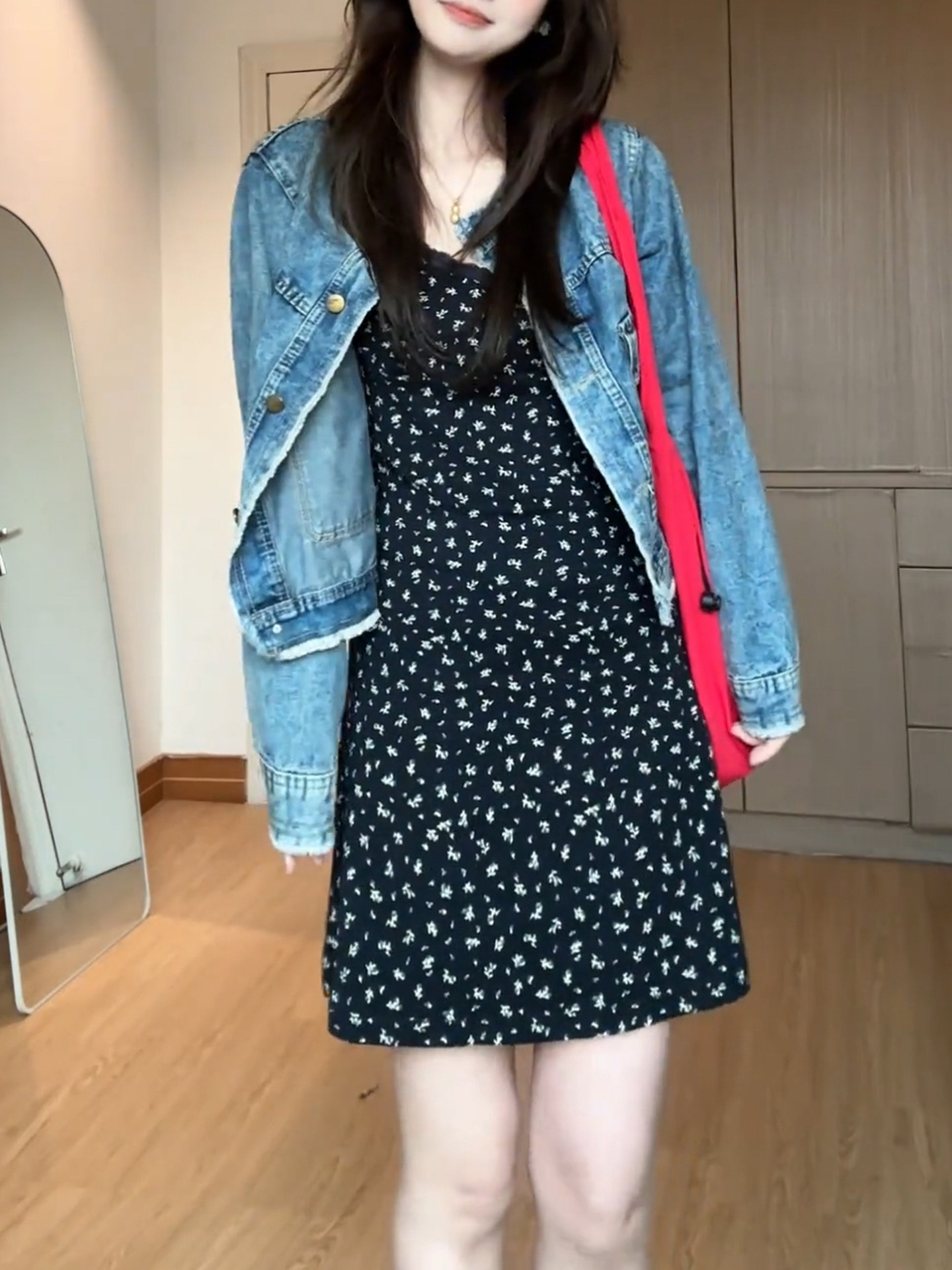 2026新款法式气质黑色碎花吊带连衣裙子女夏季小个子收腰显瘦短裙