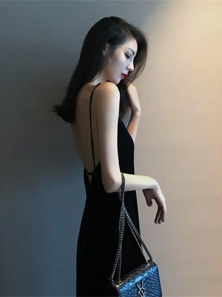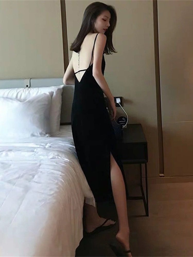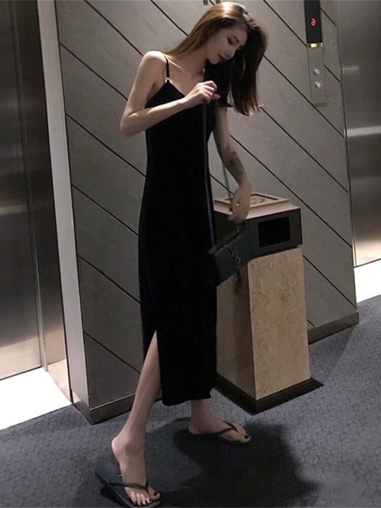 赫本小黑裙黑色高冷御姐风吊带连衣裙女夏季法式性感露背开叉长裙