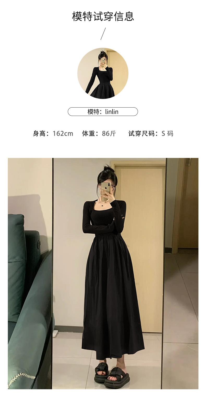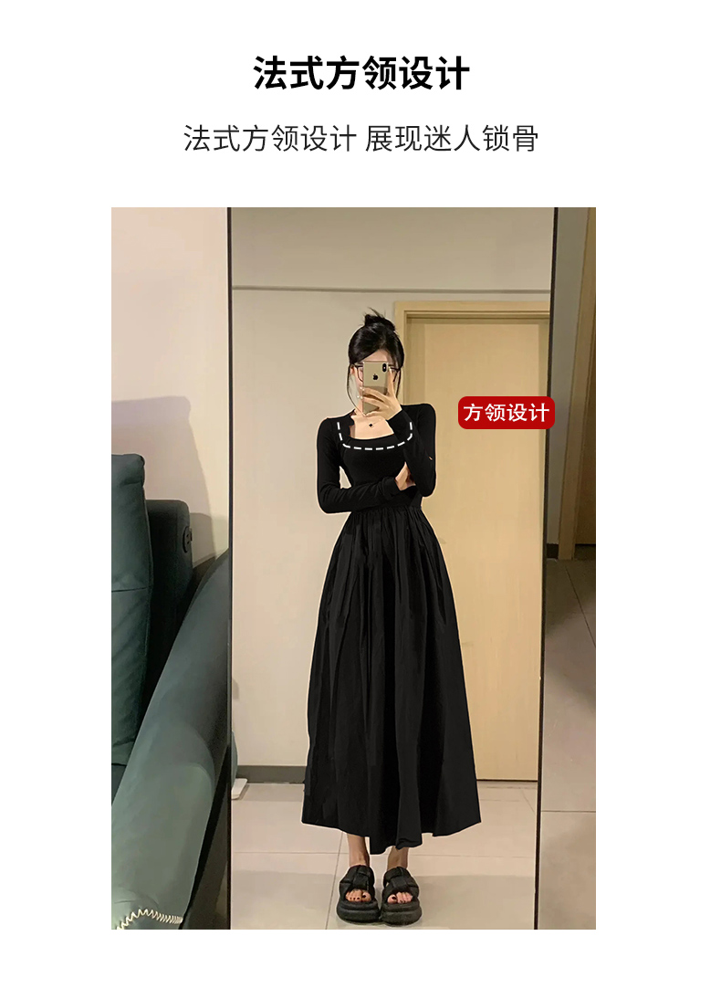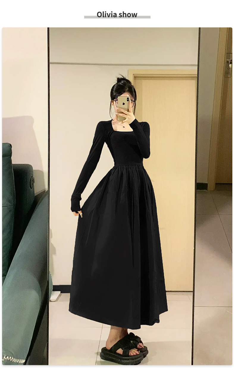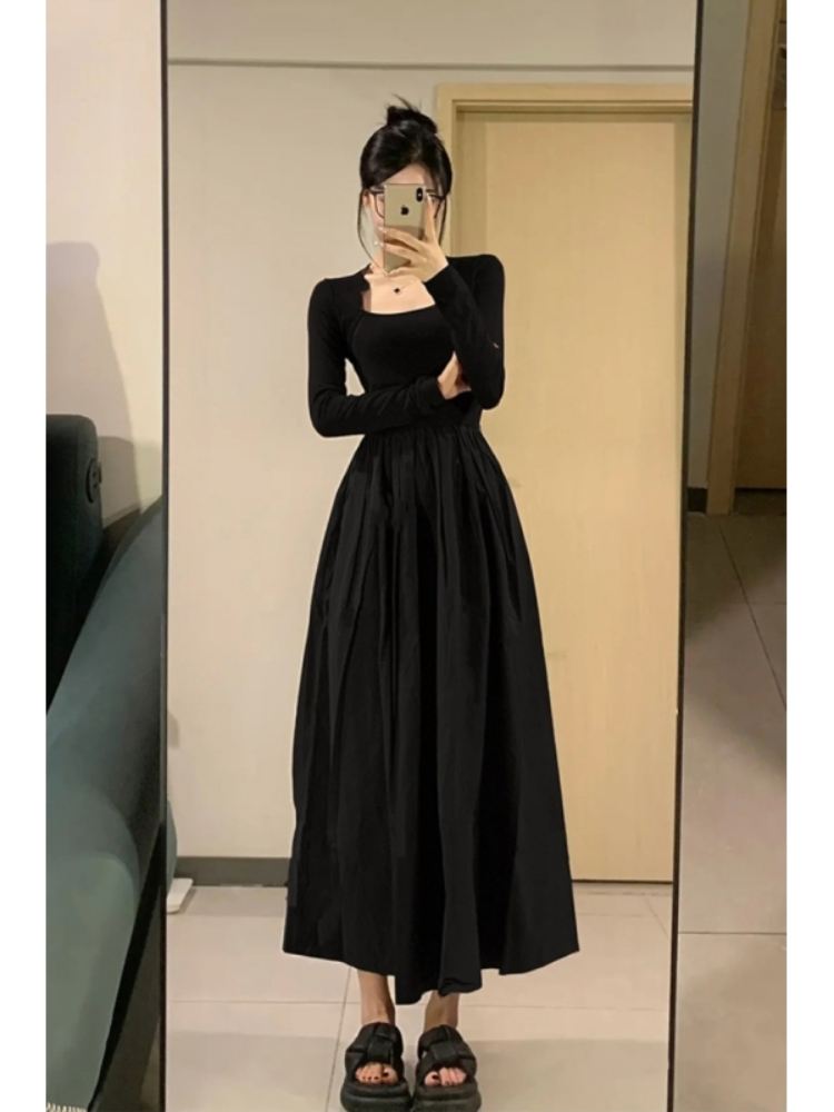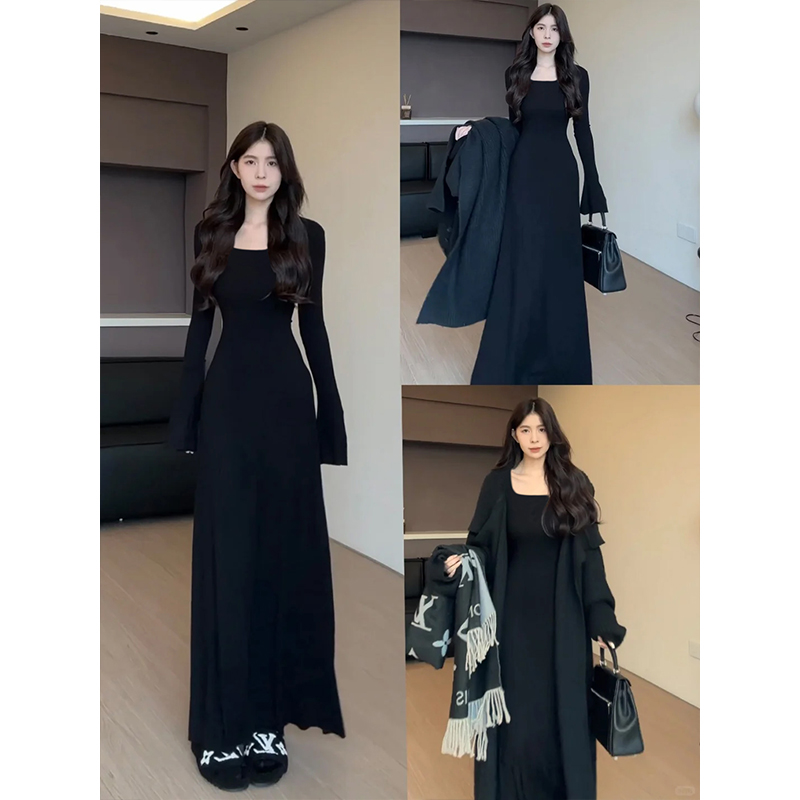 秋季赫本风黑色连衣裙女秋冬套装高级感长裙子一整套穿搭2025新款