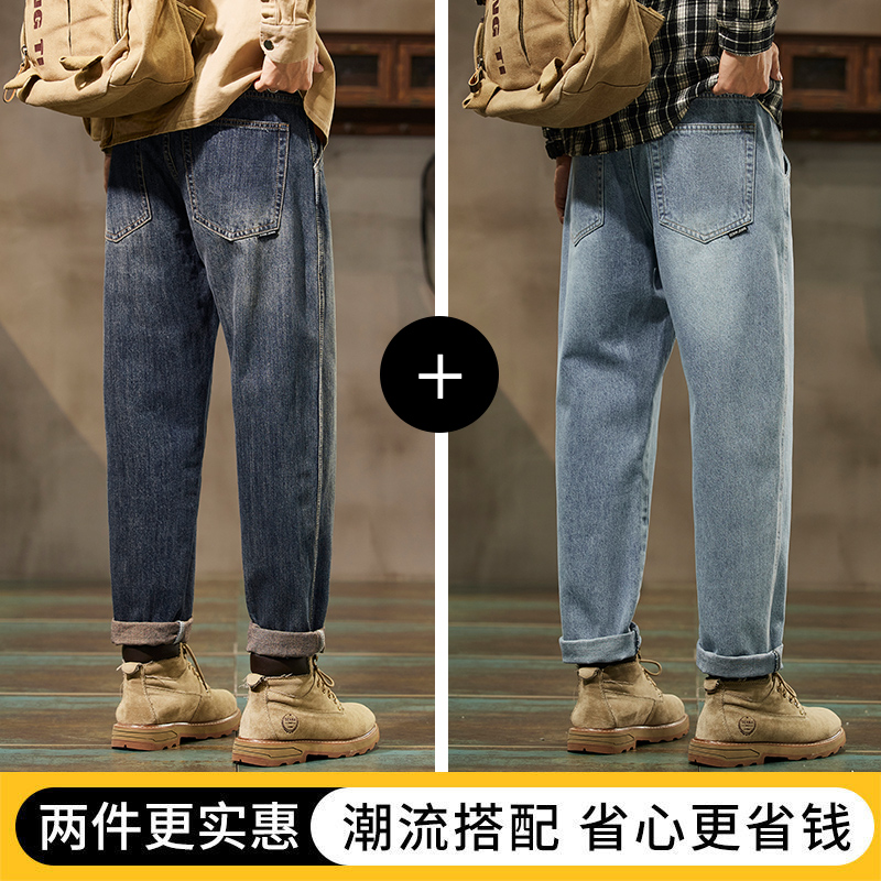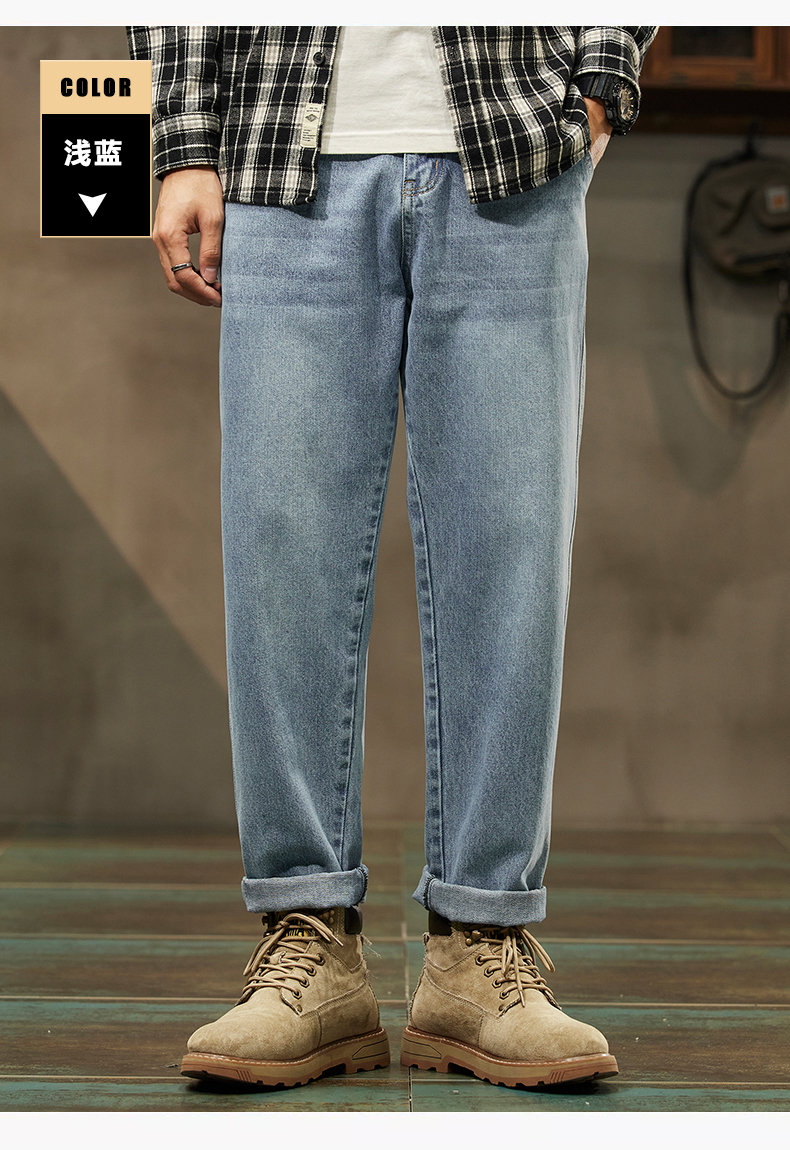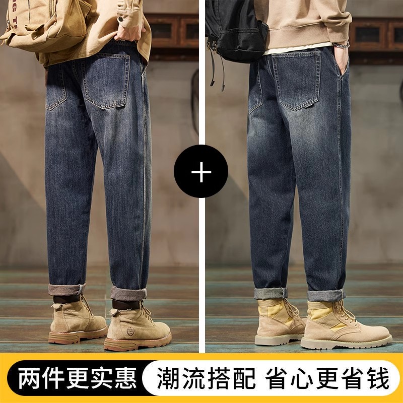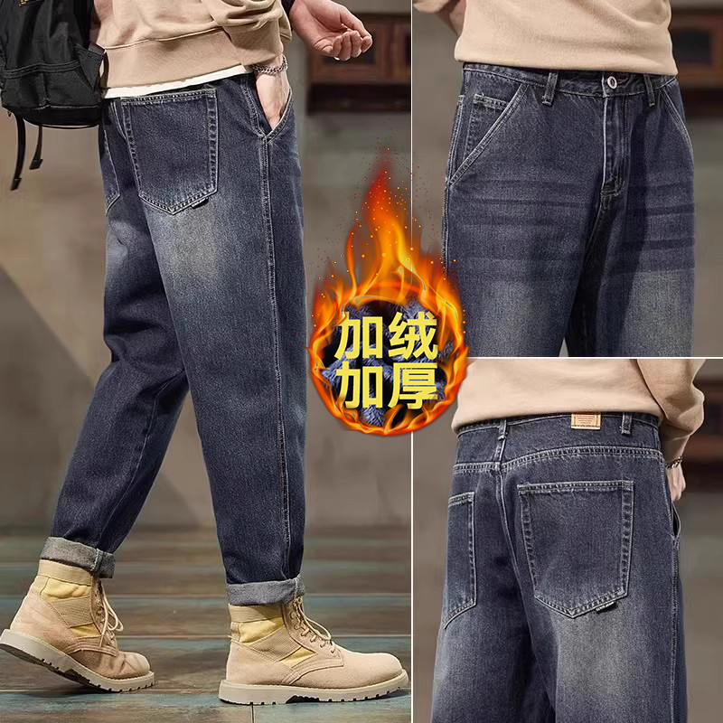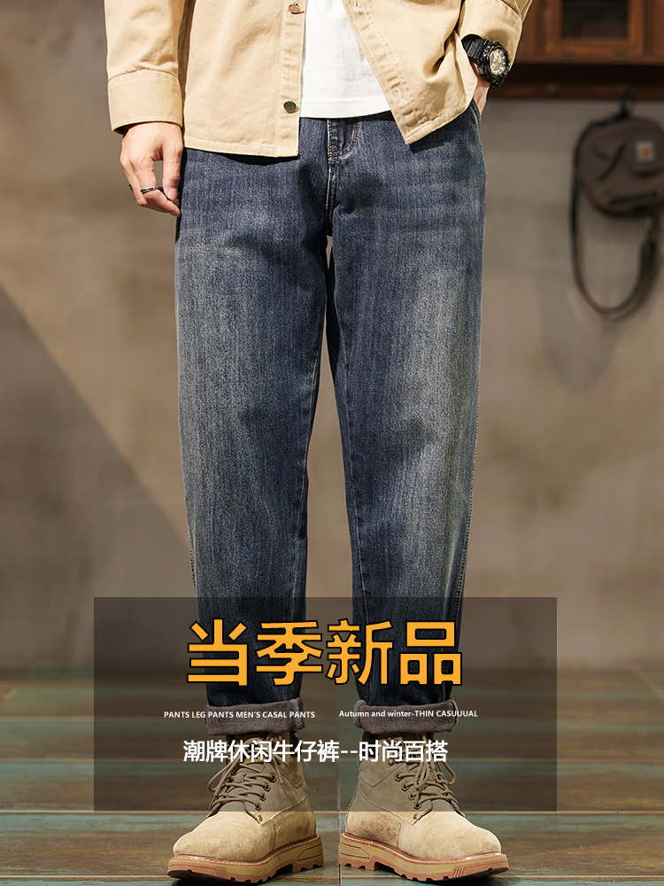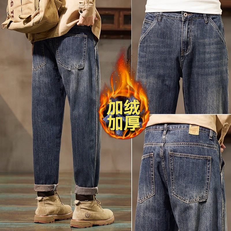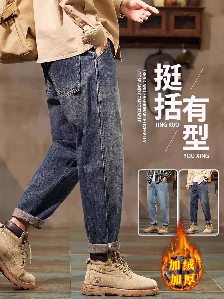 美式牛仔裤男士潮牌直筒宽松2025秋冬加绒新款水洗工装男生长裤子