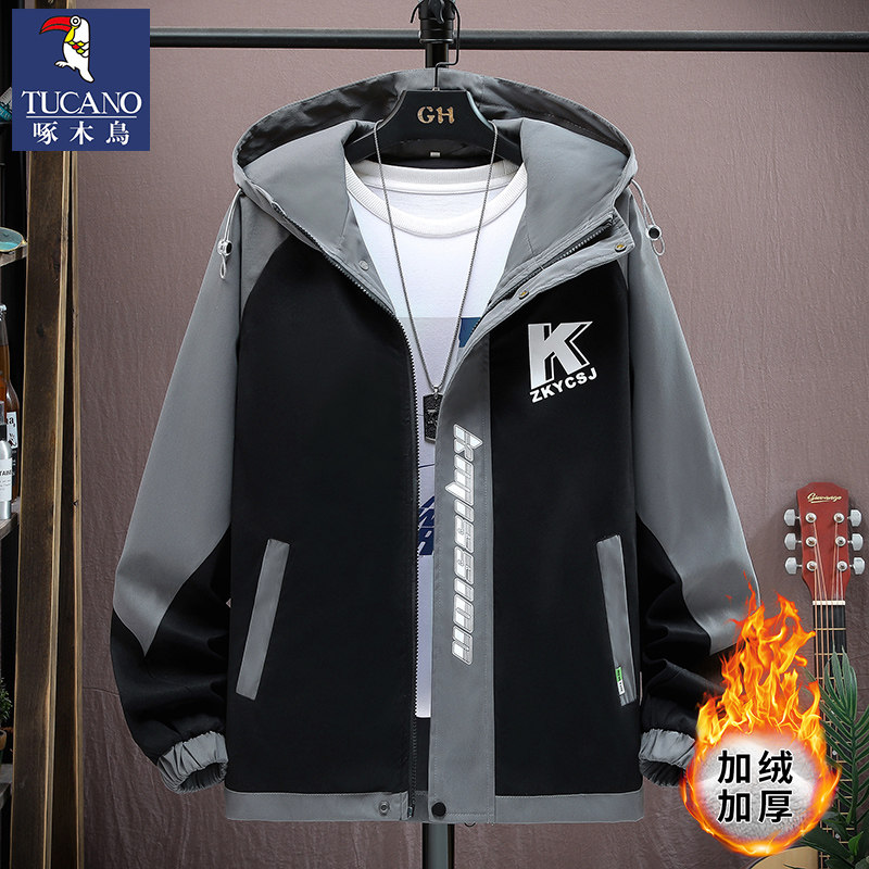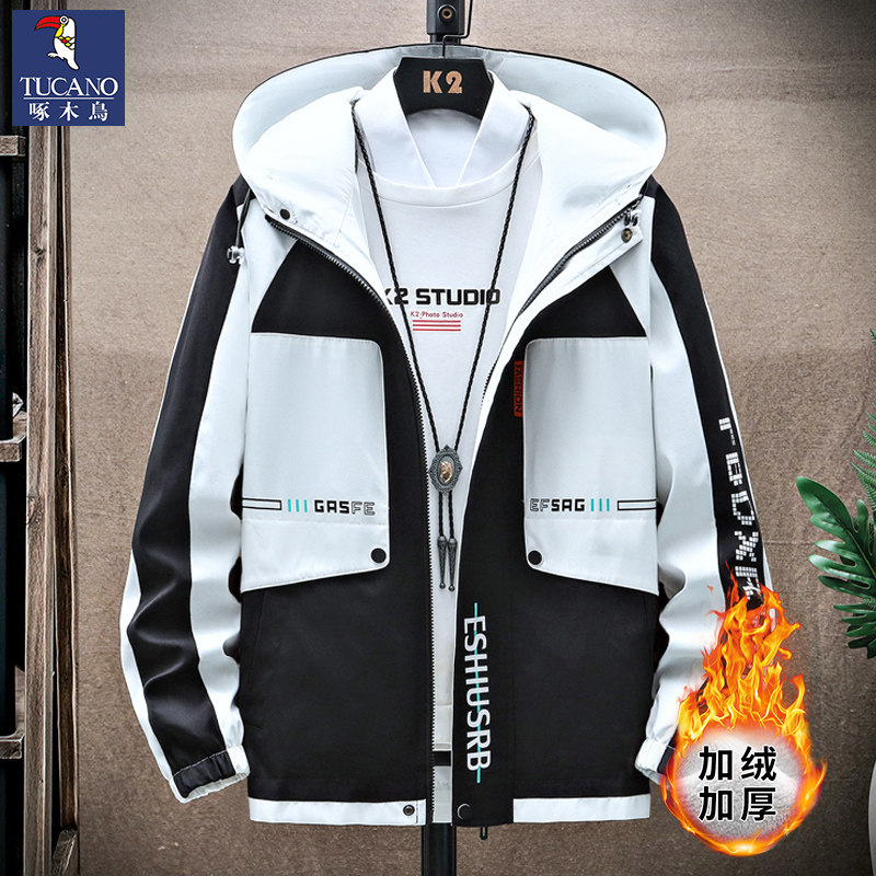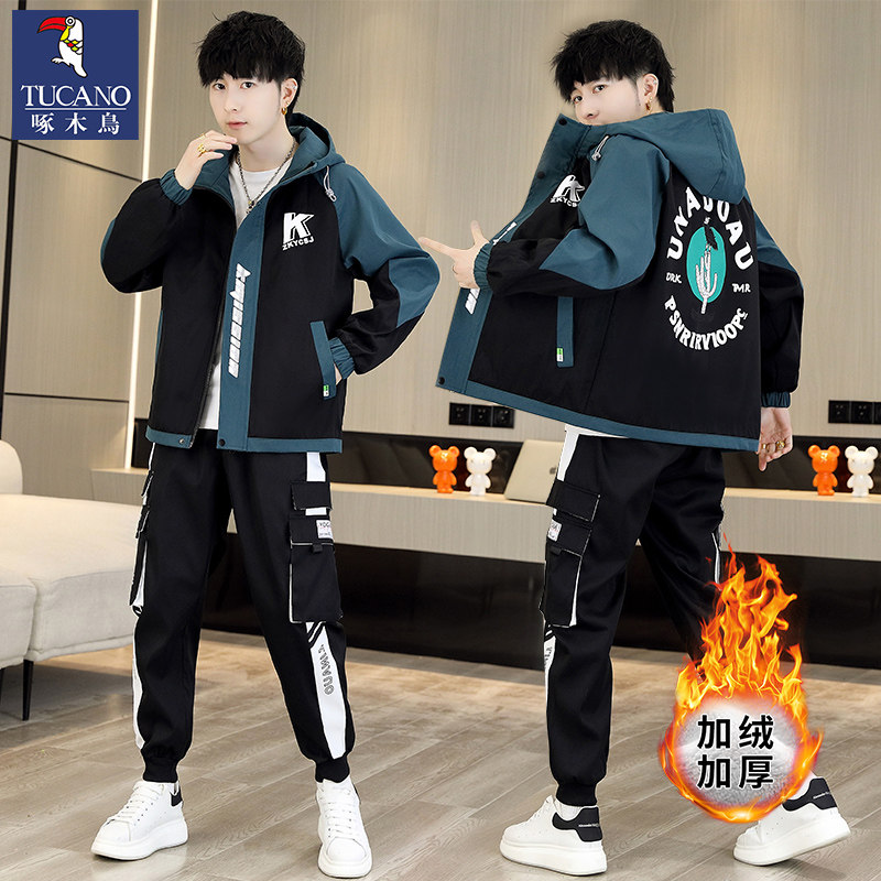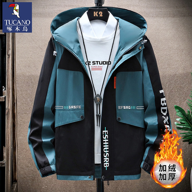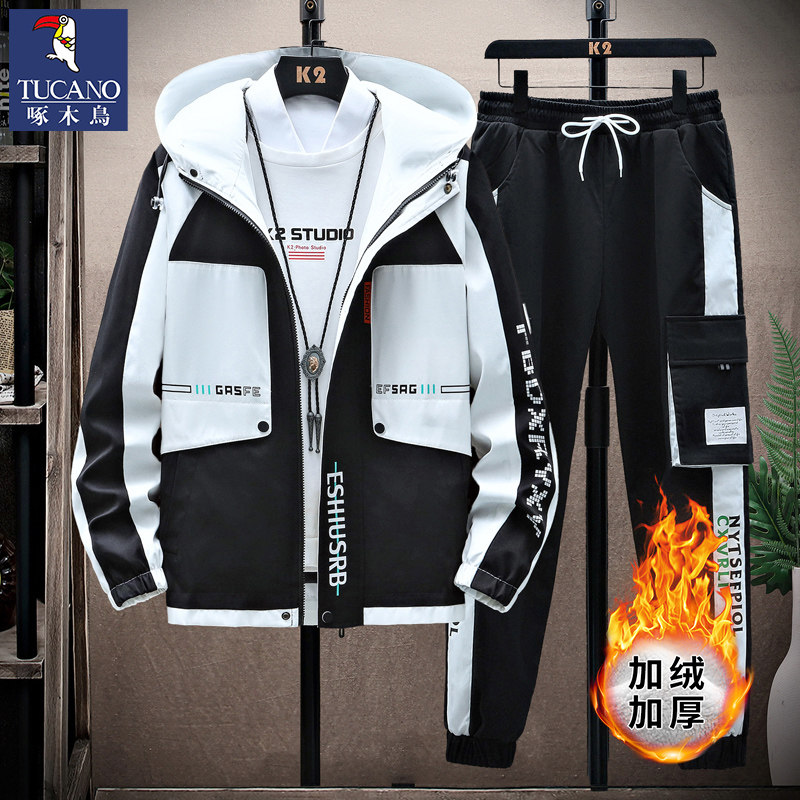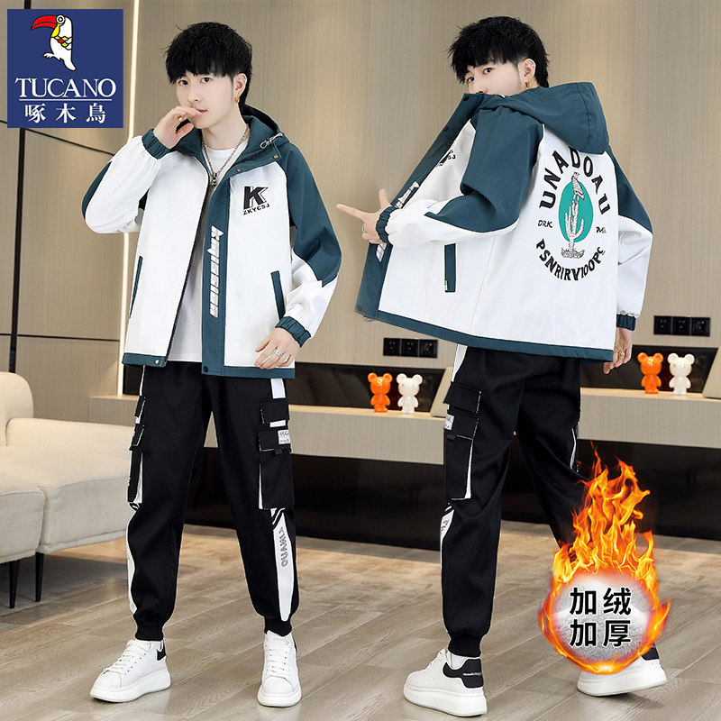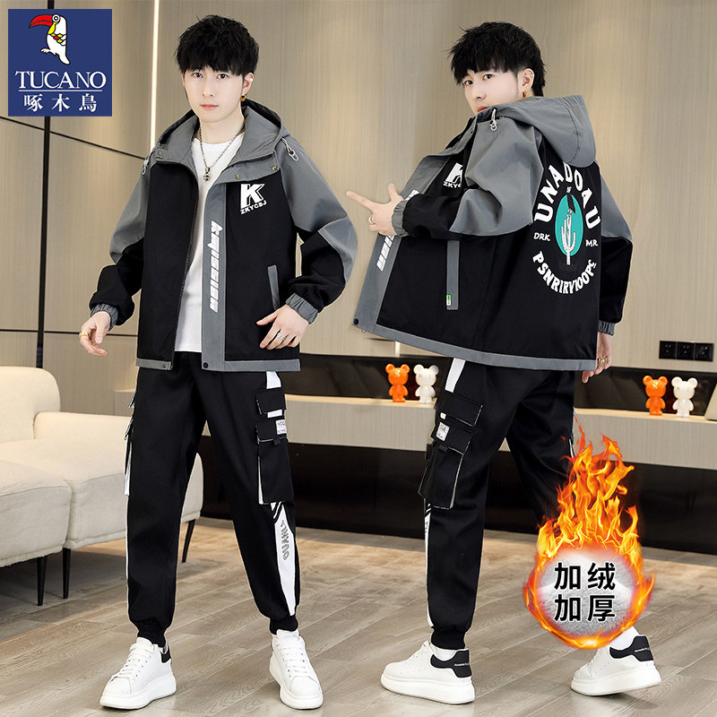 啄木鸟秋冬季外套男士加绒加厚新款夹克青少年套装潮帅气保暖男装