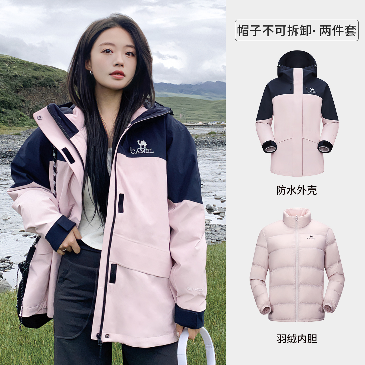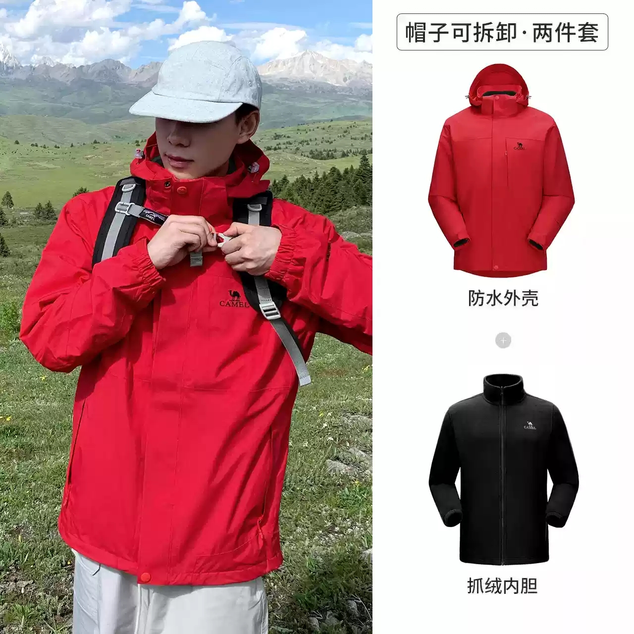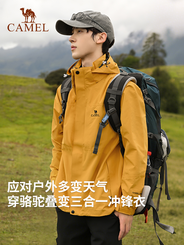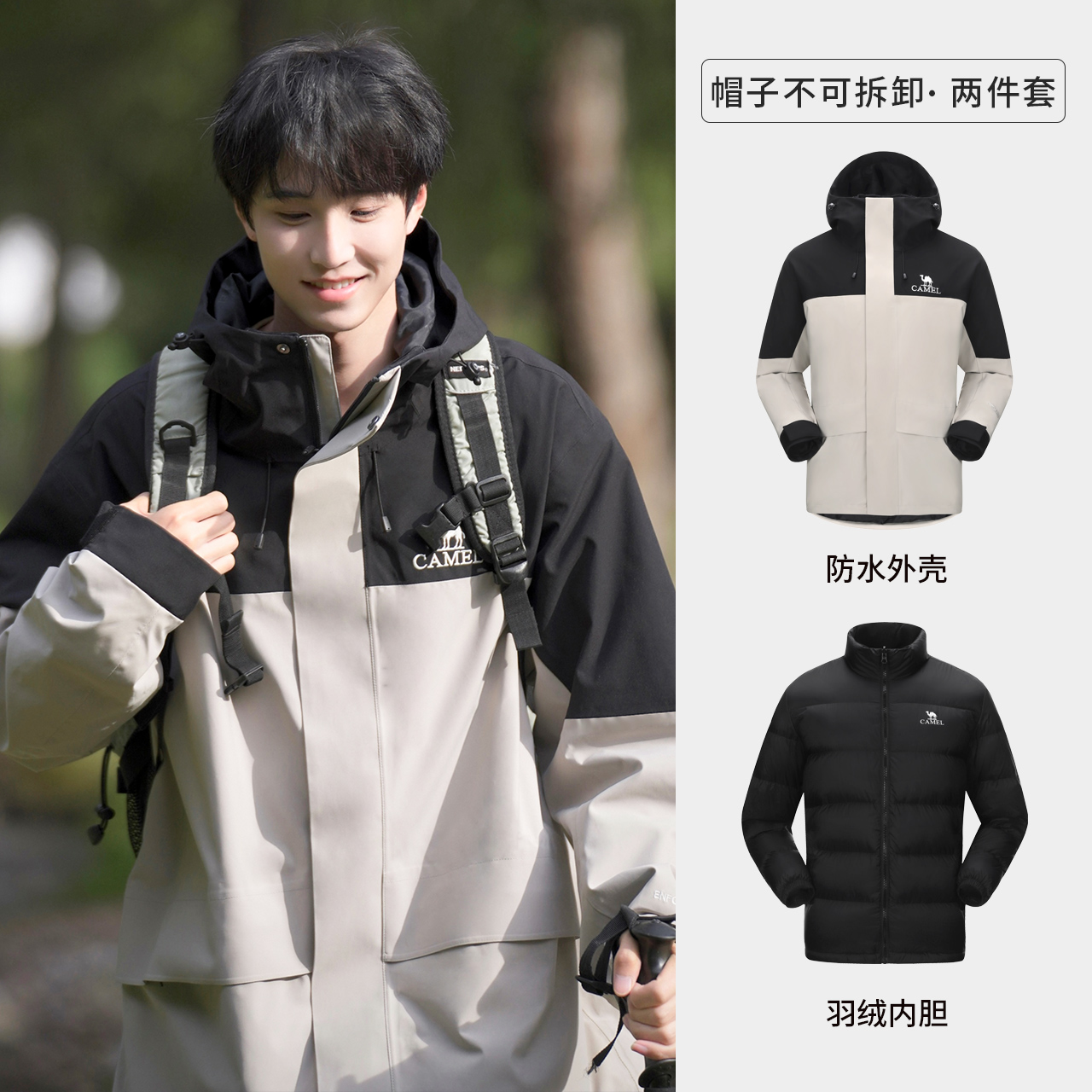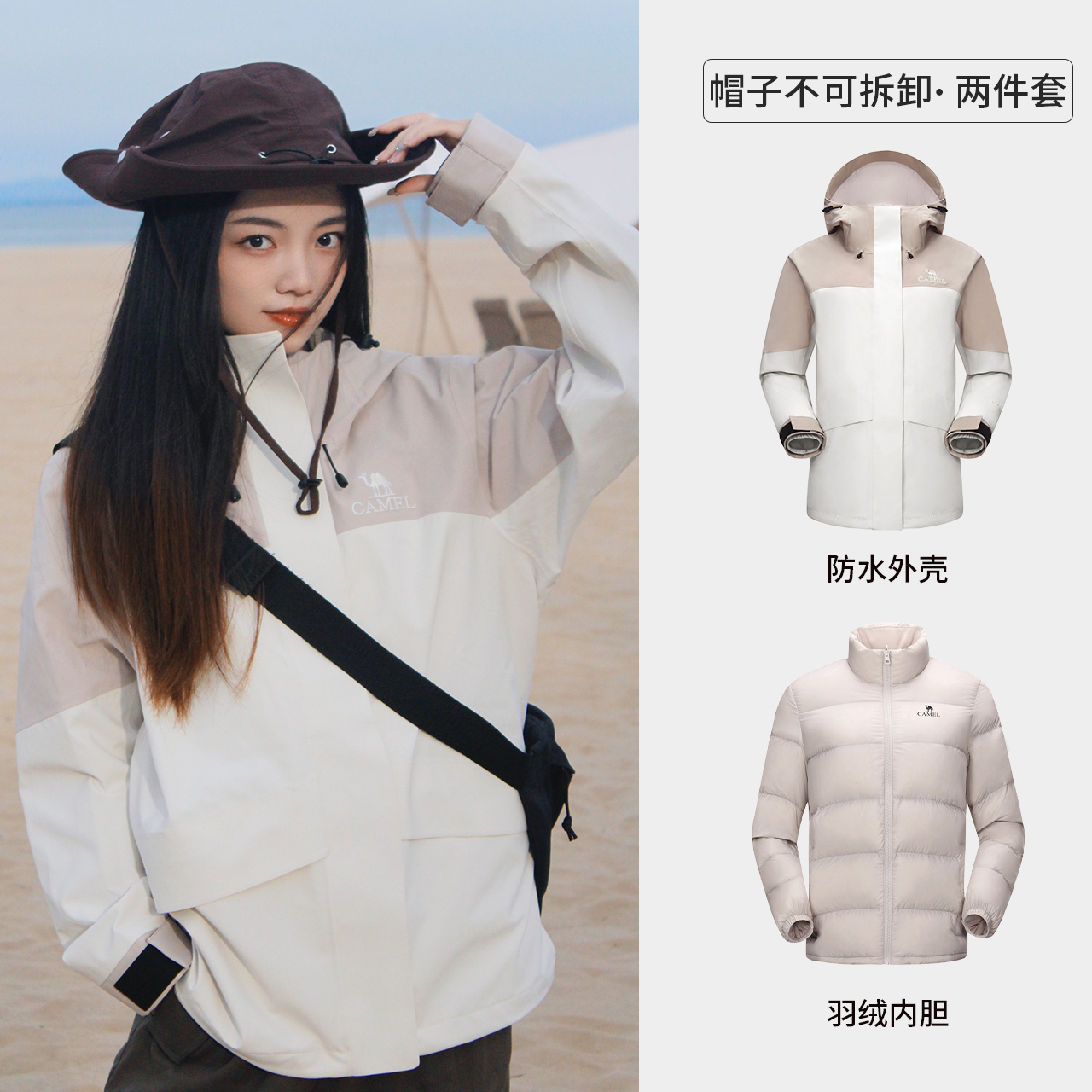 骆驼户外谷子黄色冲锋衣男女款三合一羽绒服三防防水登山服外套冬